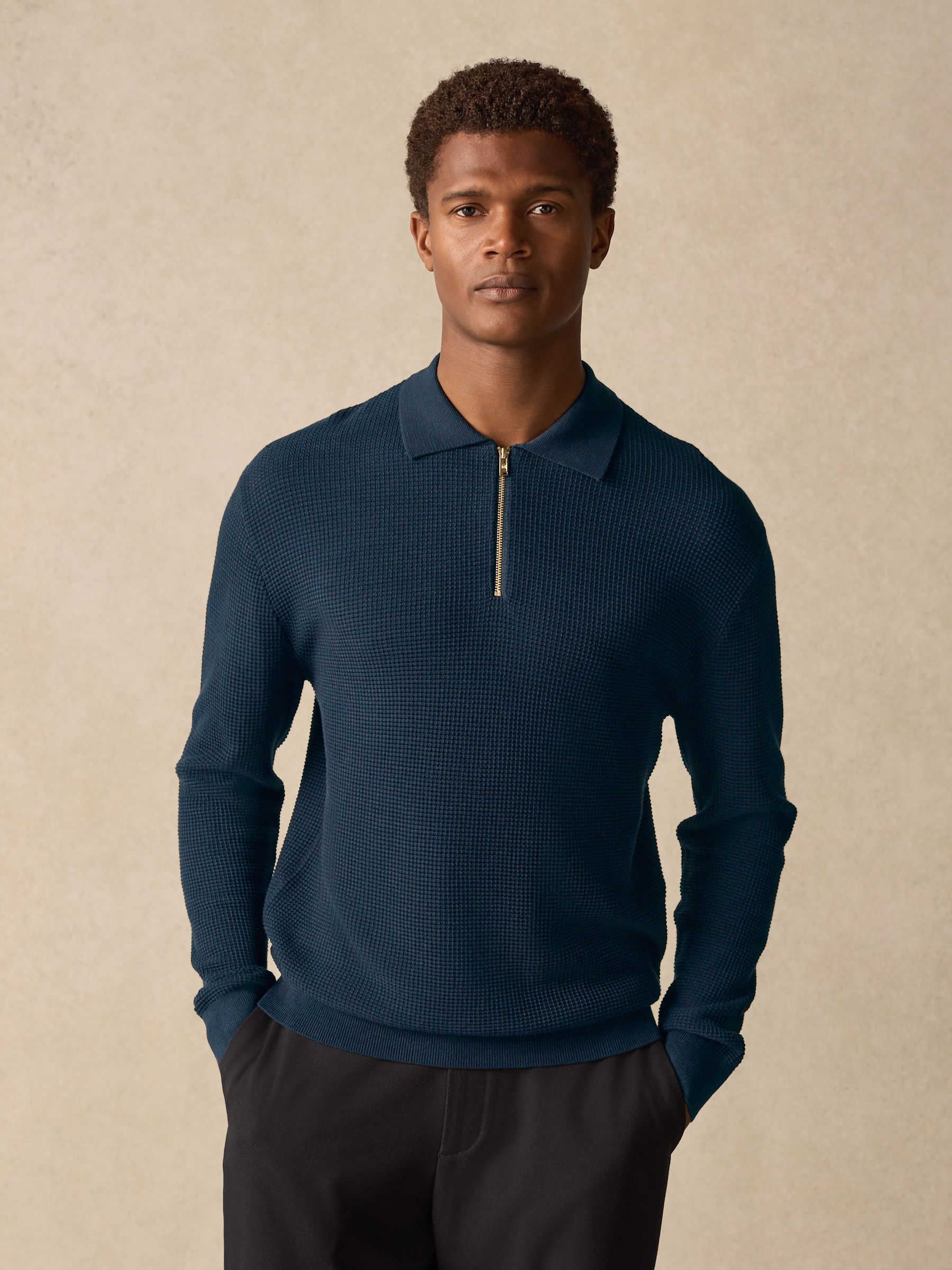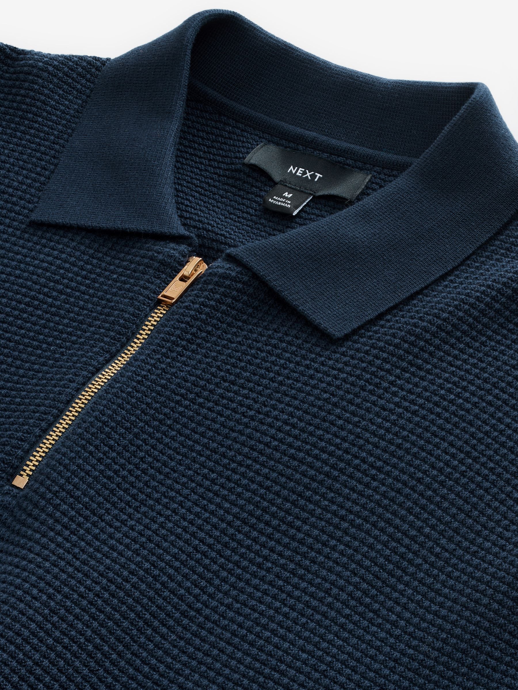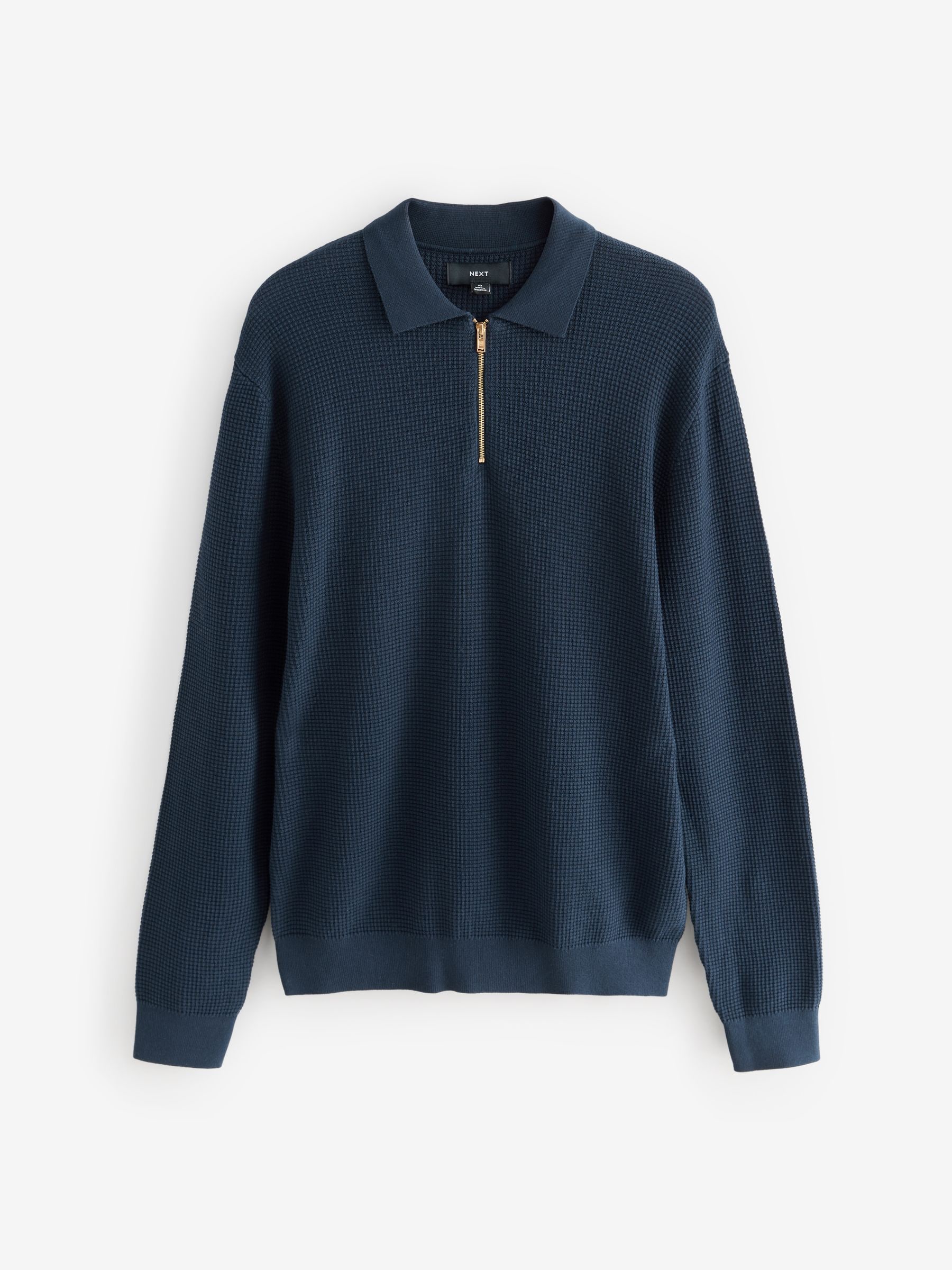 This versatile navy blue long sleeve polo shirt looks great in the office, at a party or with off-duty looks, made from pure cotton in a textured knit fabric, finished with a zip-up neck, a classic collar and ribbed hems.