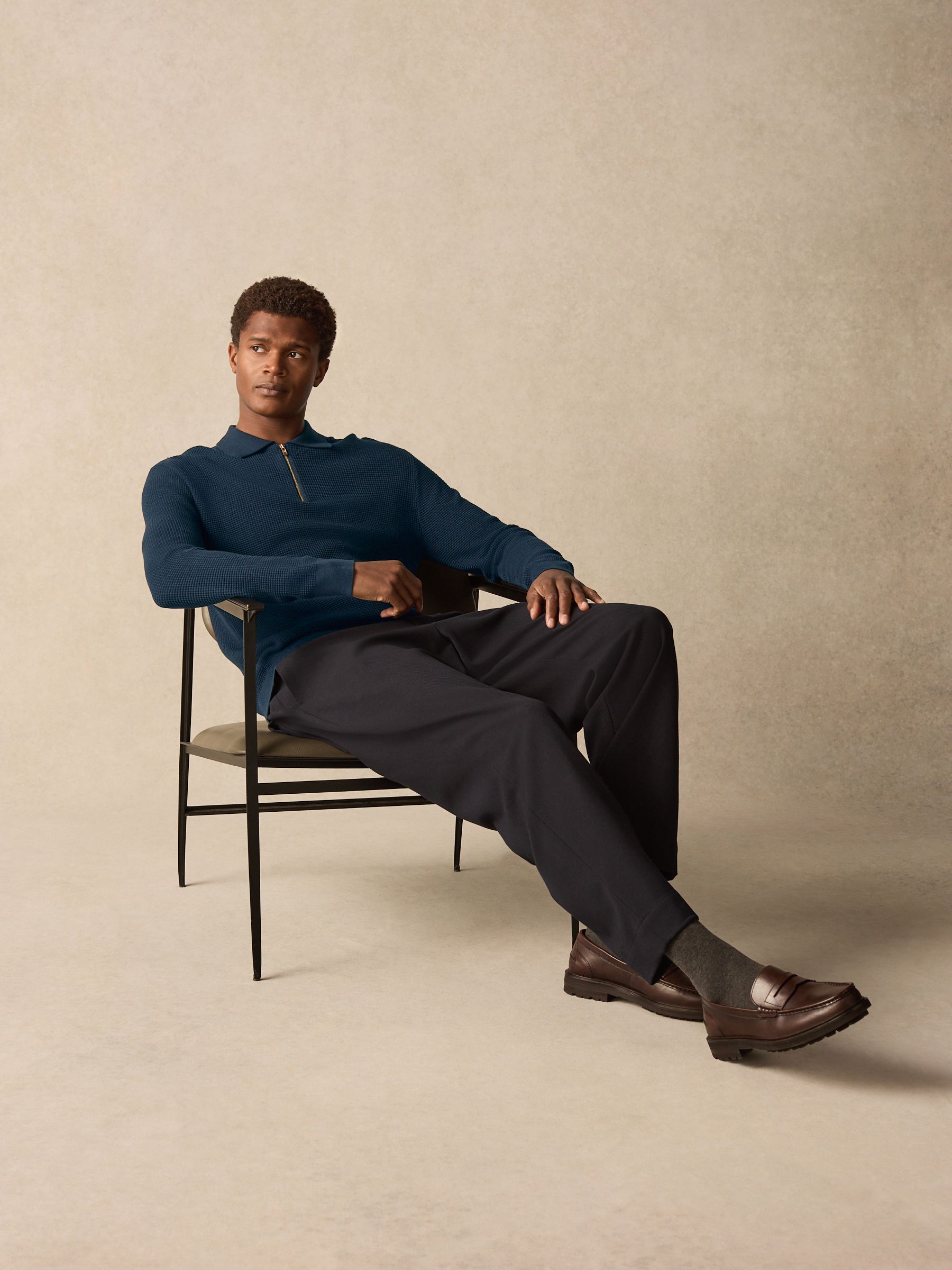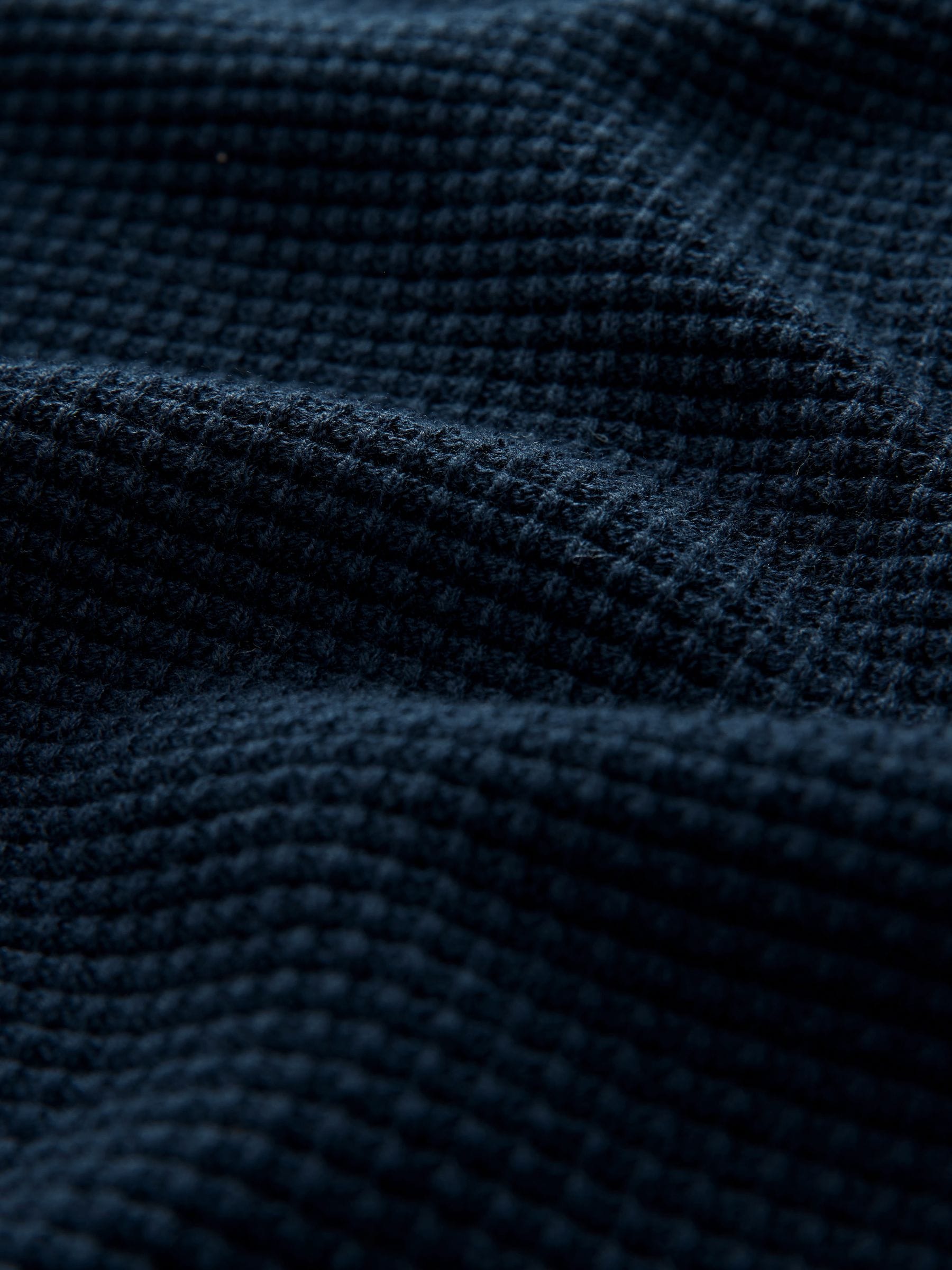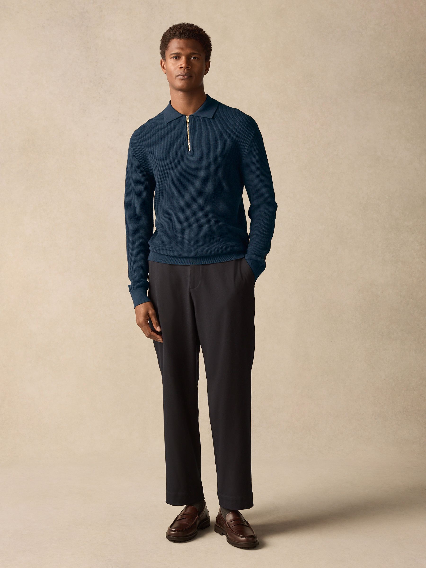 This versatile navy blue long sleeve polo shirt looks great in the office, at a party or with off-duty looks, made from pure cotton in a textured knit fabric, finished with a zip-up neck, a classic collar and ribbed hems.