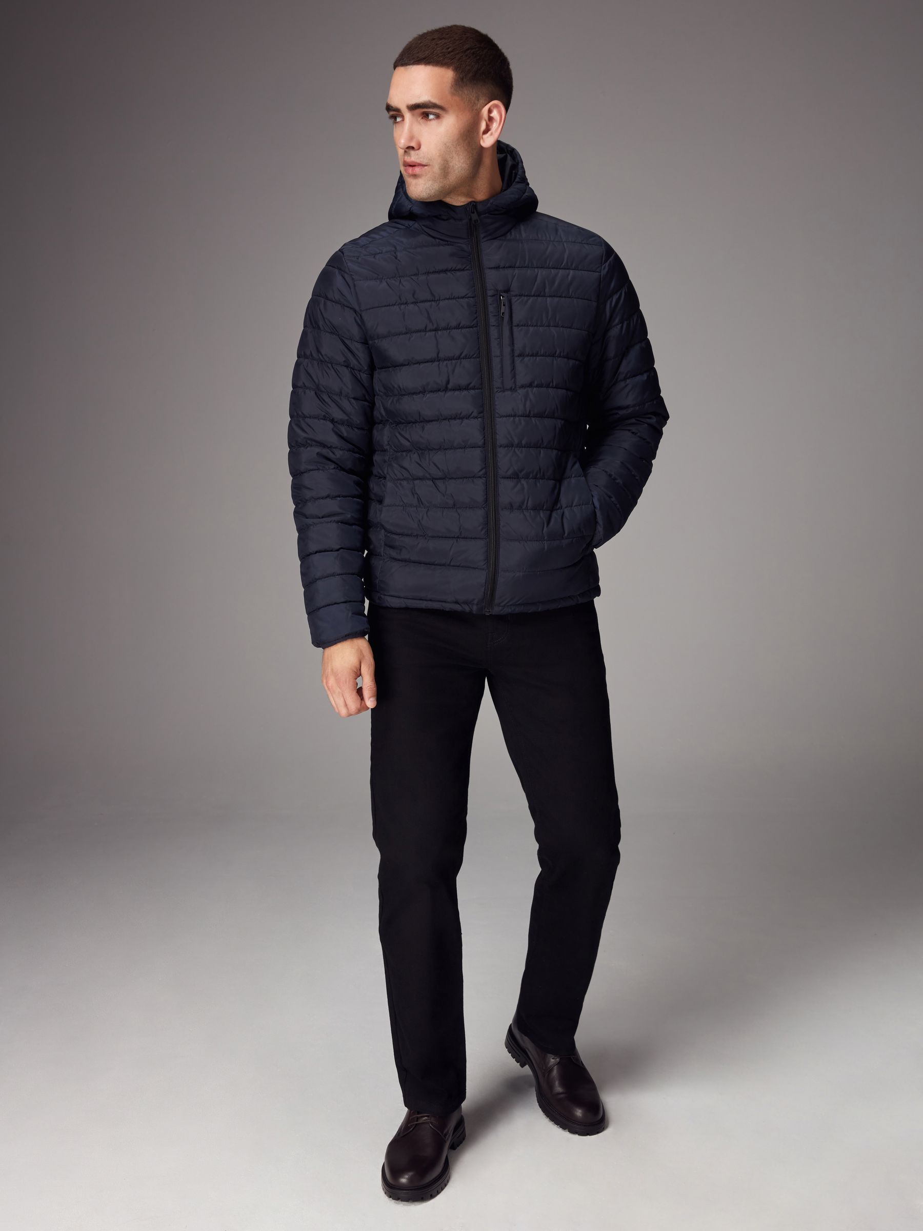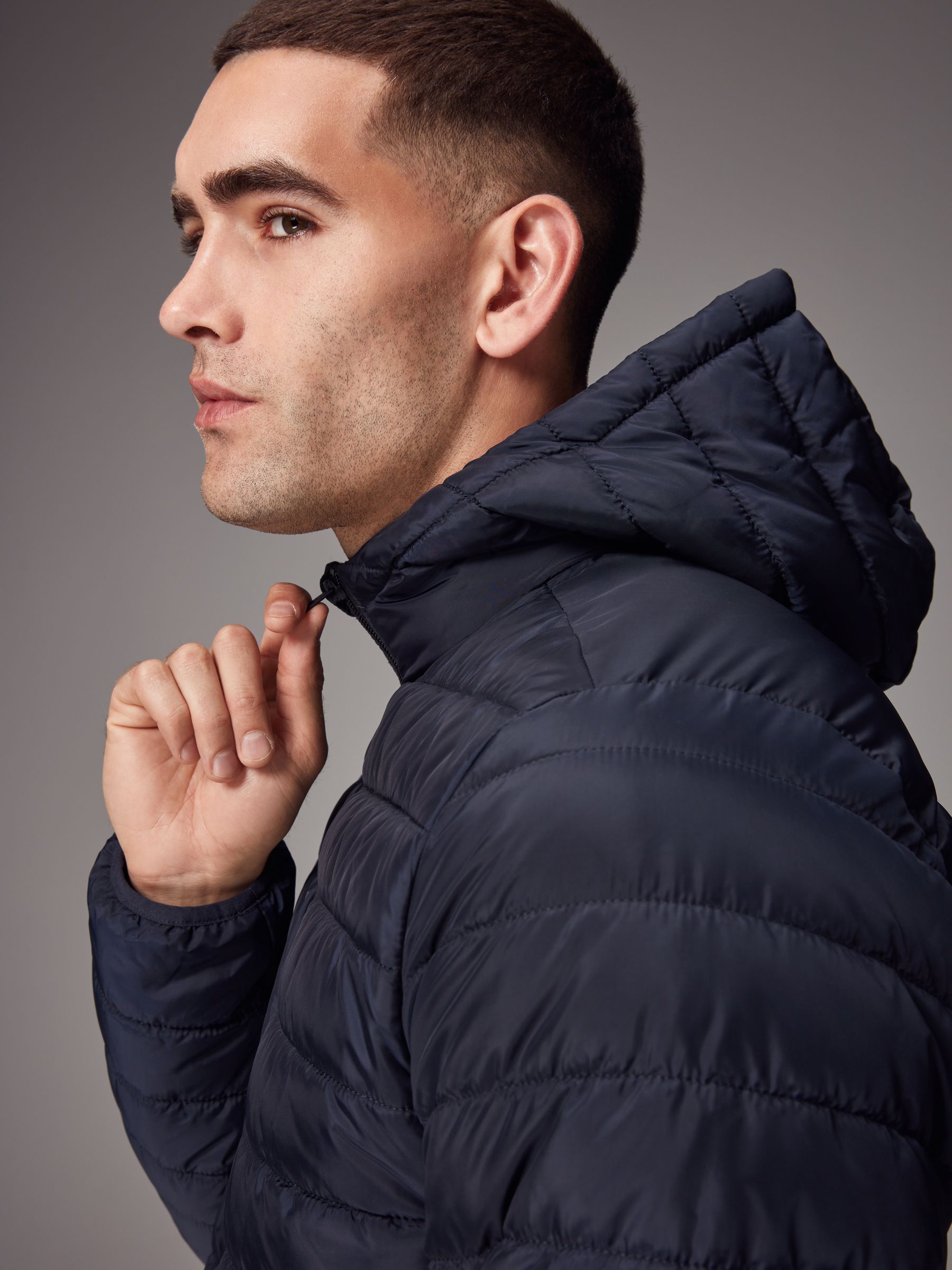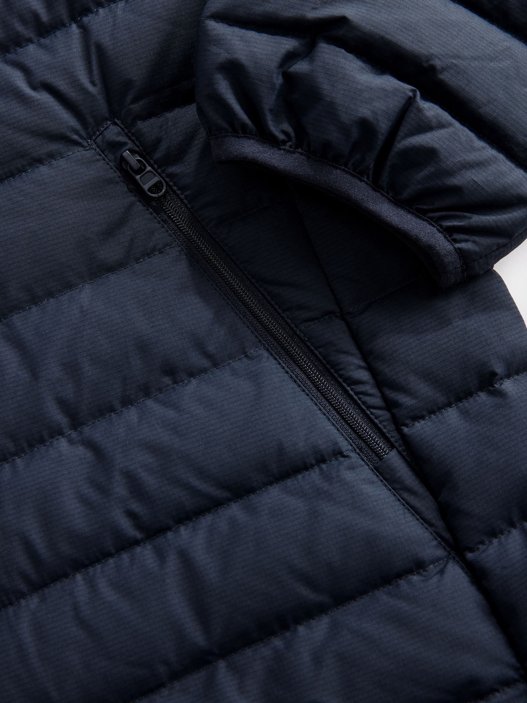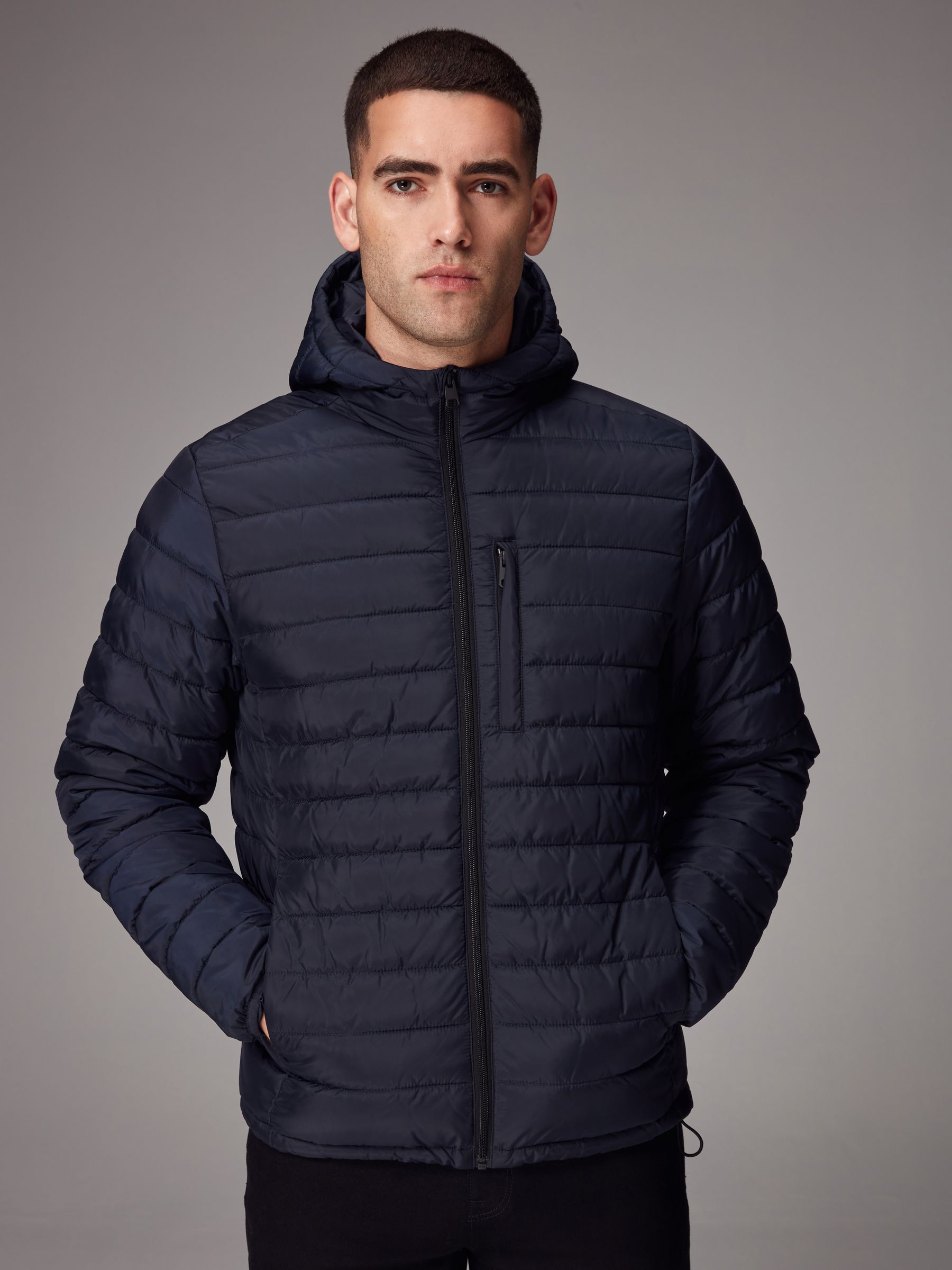 A stylish layer to add to your core outerwear, our navy blue lightweight puffer jacket is sleek, comfortable and stylish. Designed in a lightweight, shower resistant fabric with adjustable toggle pull and handy hood. Puffer jacket Lightweight Shower resistant Hooded Adjustable toggle pull Main 100% Recycled polyester. Lining 100% Recycled polyester.