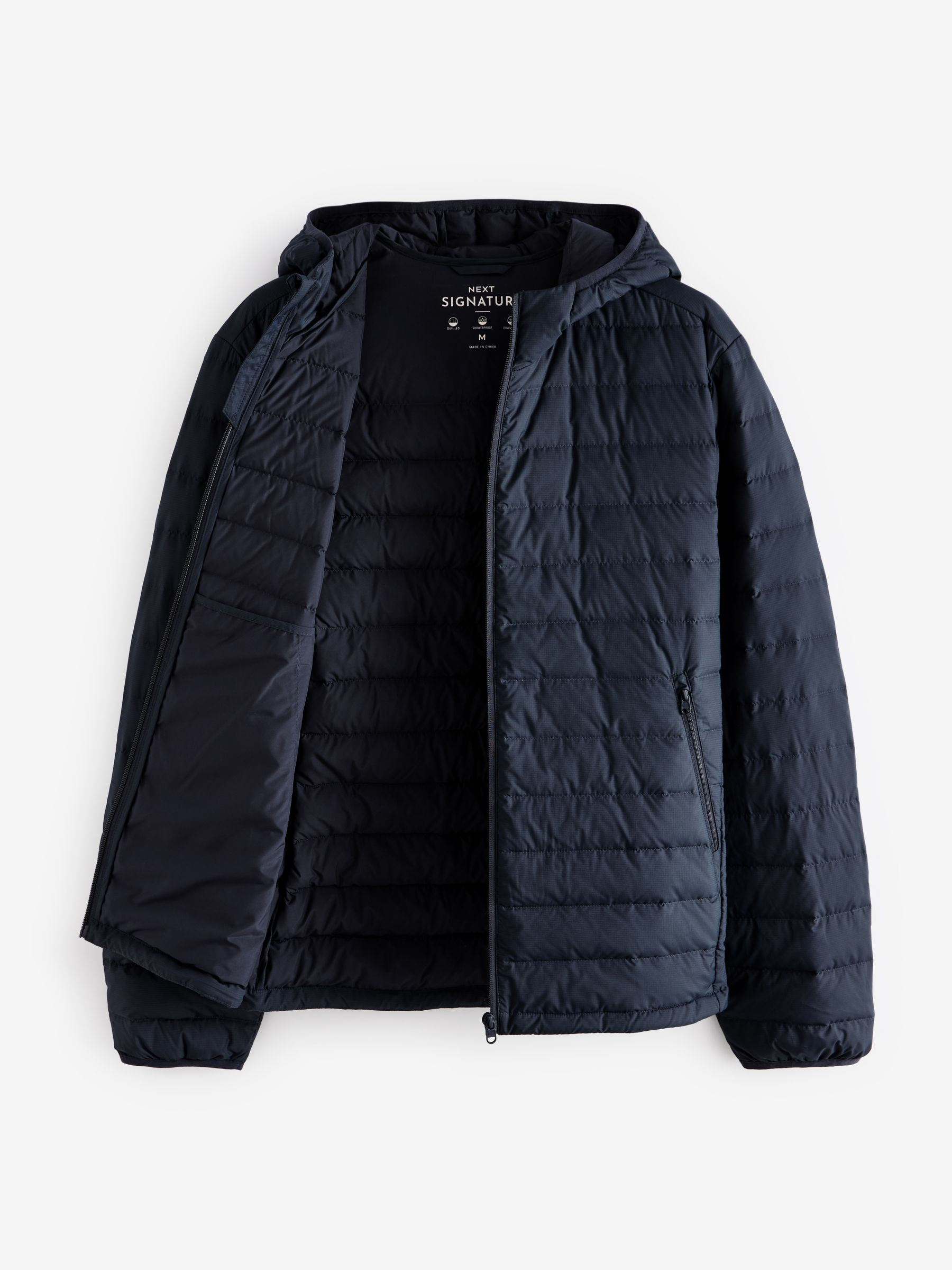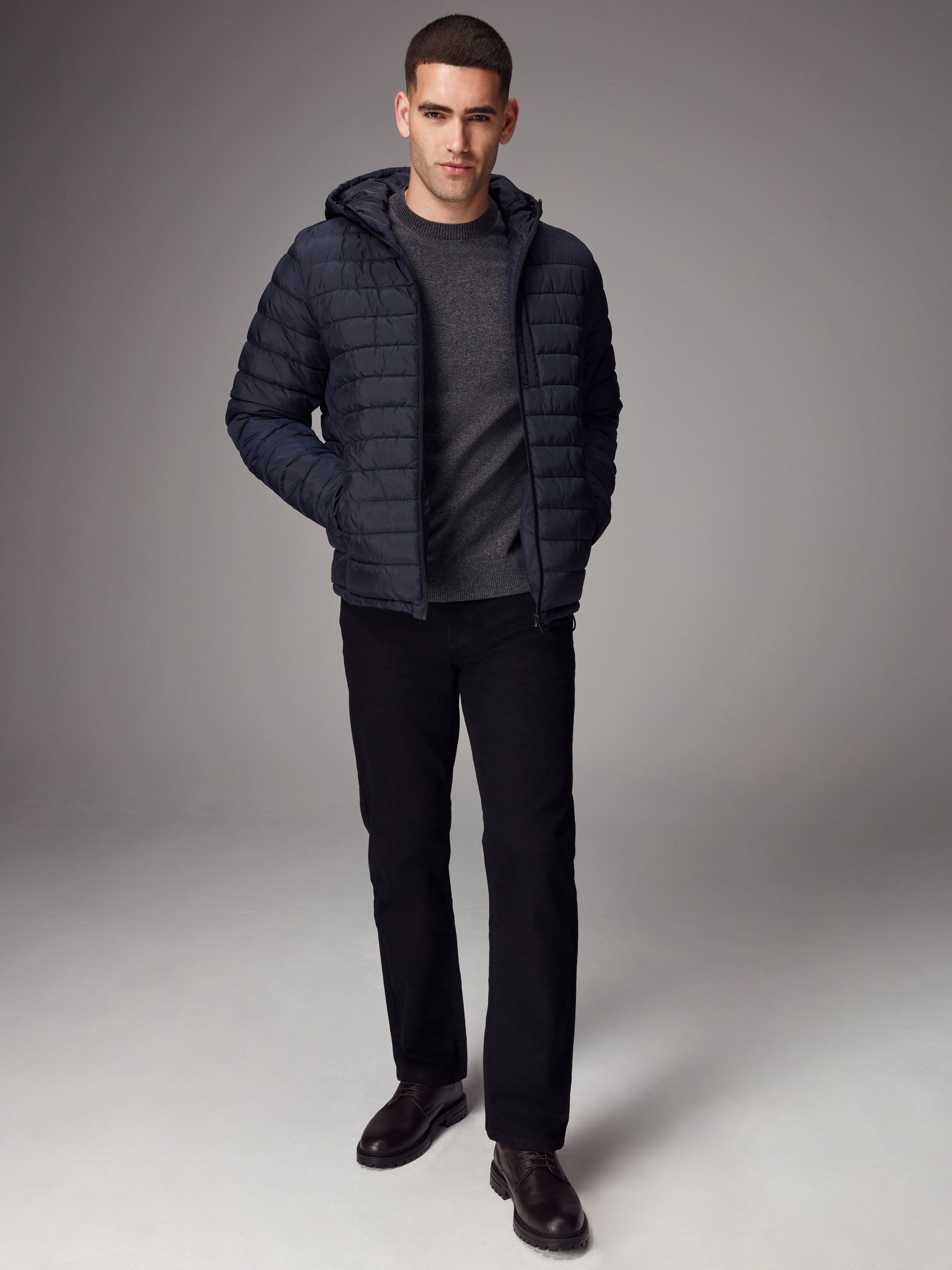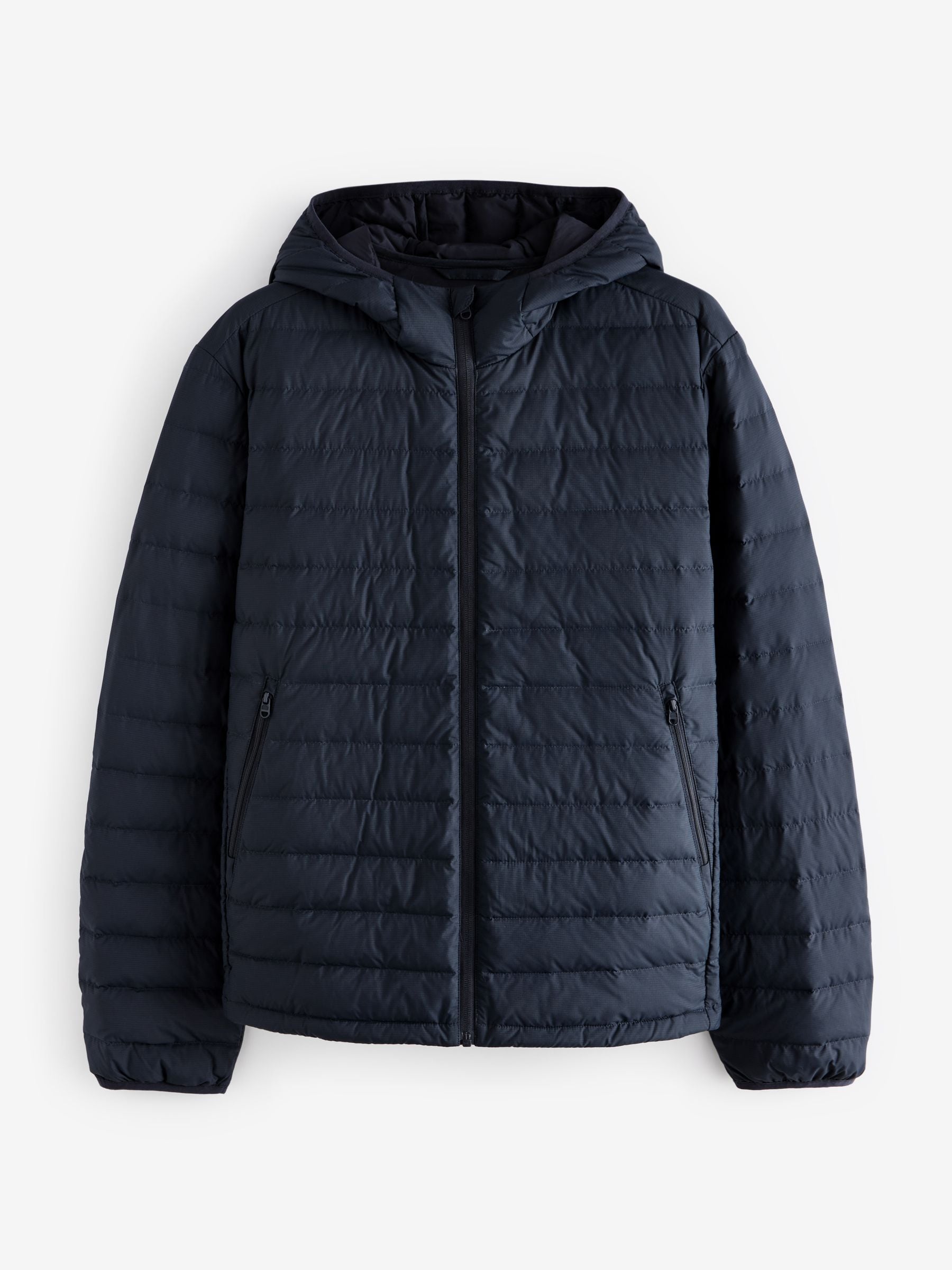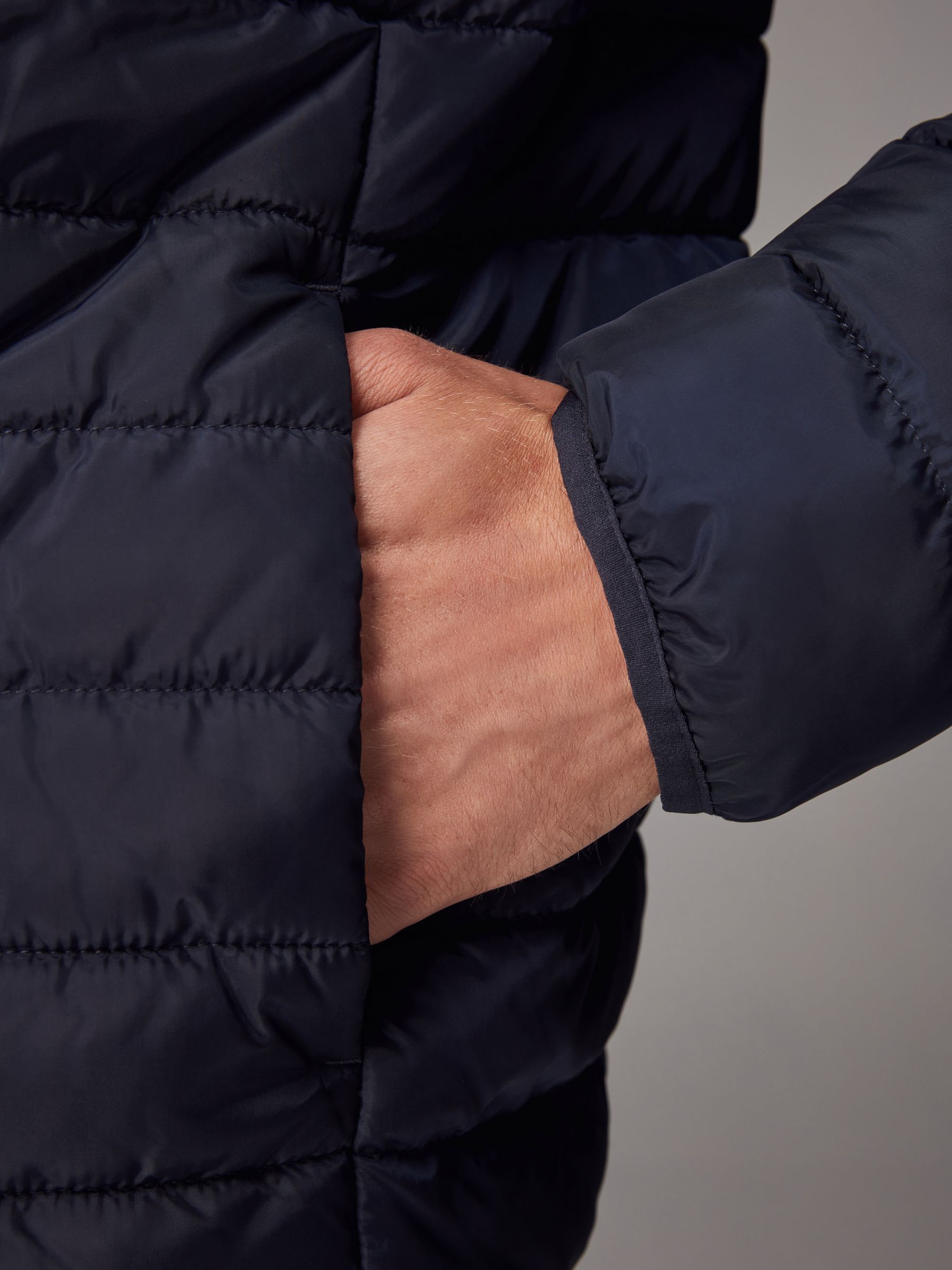 A stylish layer to add to your core outerwear, our navy blue lightweight puffer jacket is sleek, comfortable and stylish. Designed in a lightweight, shower resistant fabric with adjustable toggle pull and handy hood. Puffer jacket Lightweight Shower resistant Hooded Adjustable toggle pull Main 100% Recycled polyester. Lining 100% Recycled polyester.
