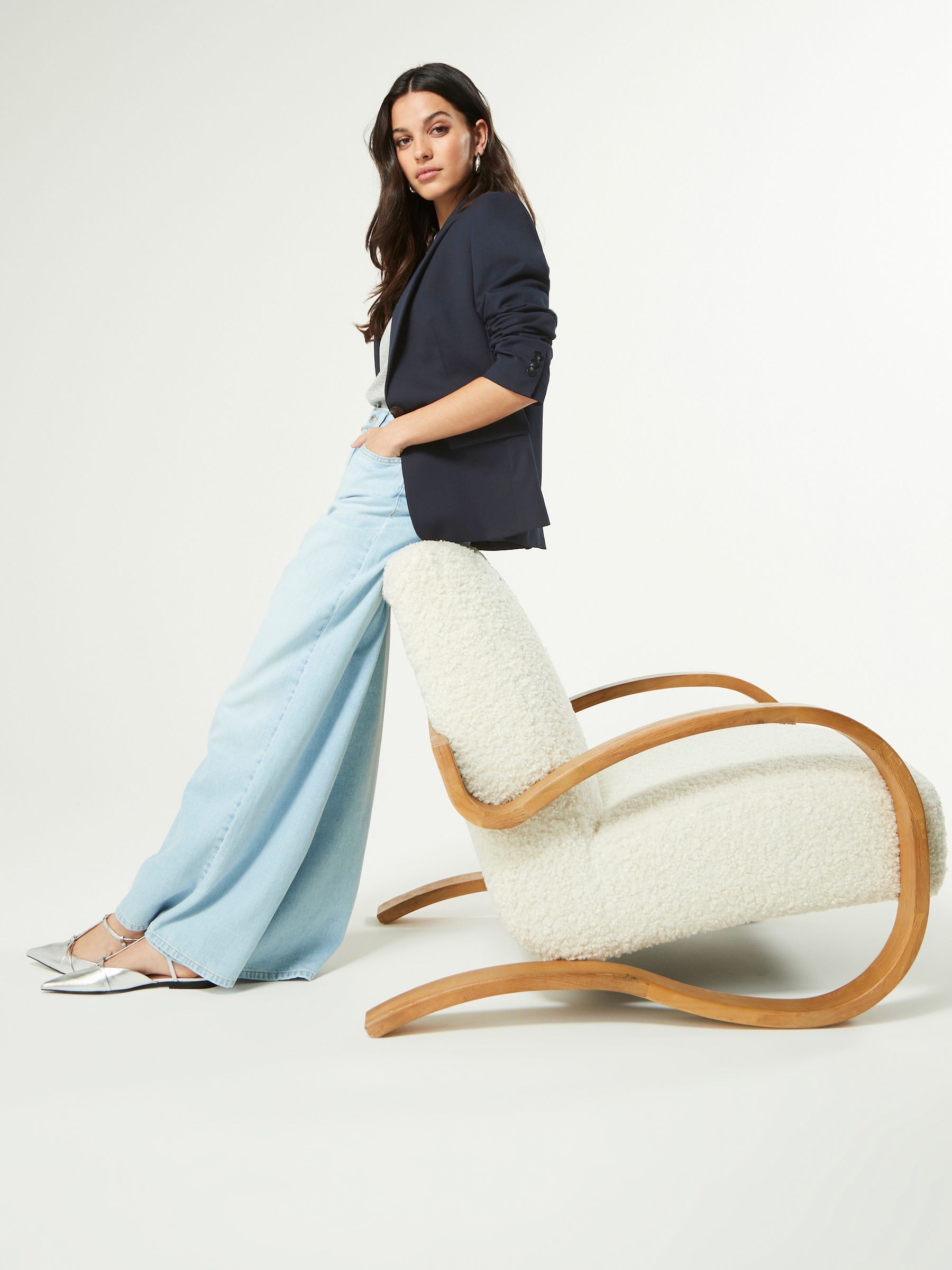 Update your 9-5 style with our Navy tailored single breasted blazer. Designed in a regular fit with a tailored silhouette, this trendy blazer is single-breasted with a button fastening. Complete with front pockets and a notched lapel collar. Regular fit Front pockets Single breasted Notched lapel collar Regular centre back neck to hem 25″ x 63cm. Machine washable. Main 64% Recycled polyester, 34% Enhanced Spunshades™ viscose, 2% Elastane. Lining 100% Recycled polyester. Our tall collection is designed to fit women 5’10” and above. This has been proportionally increased through the body, leg and sleeve to achieve the perfect fit. Available in sizes 8-20., Items with the curve logo are available in sizes 18 and above.