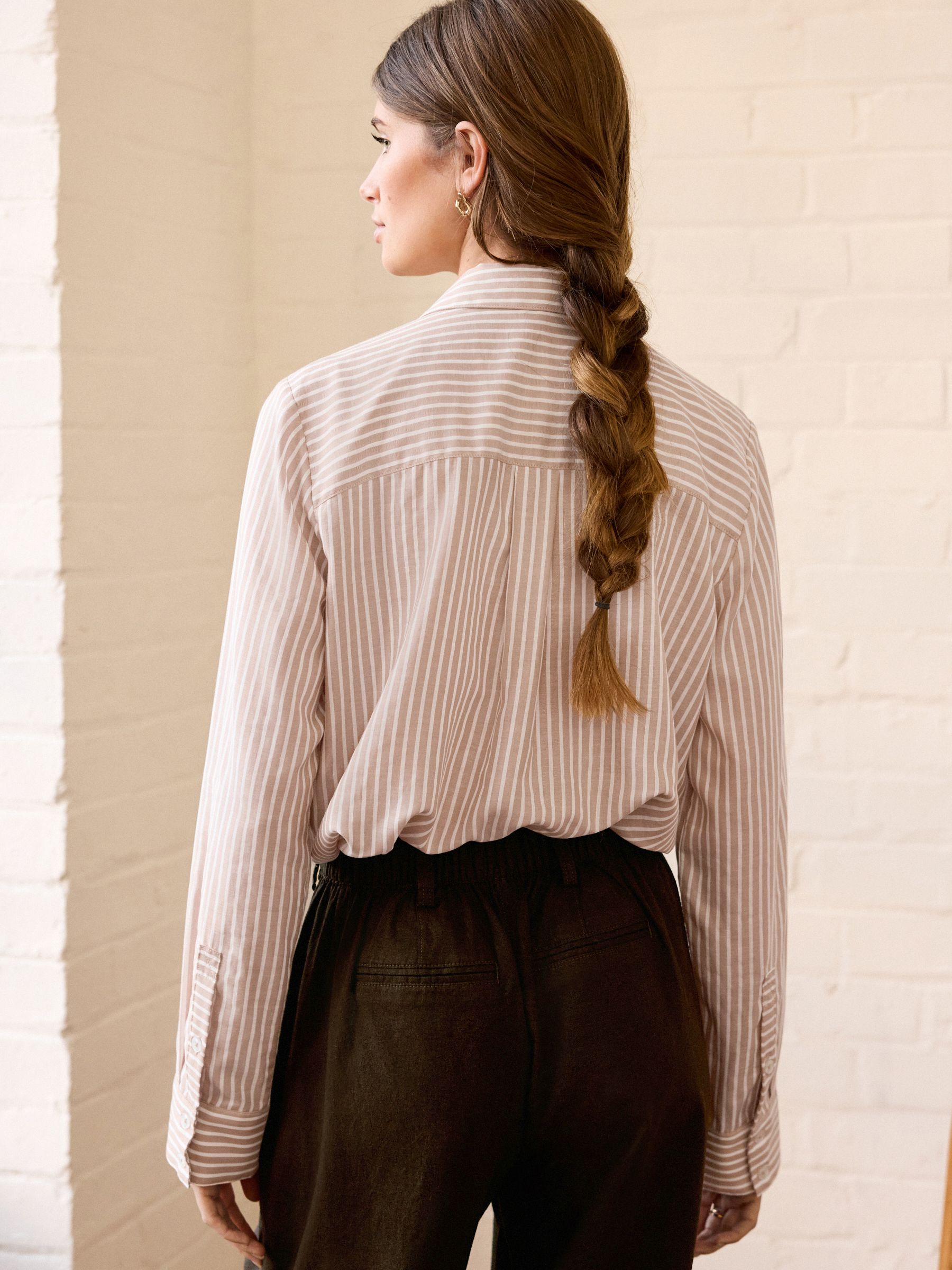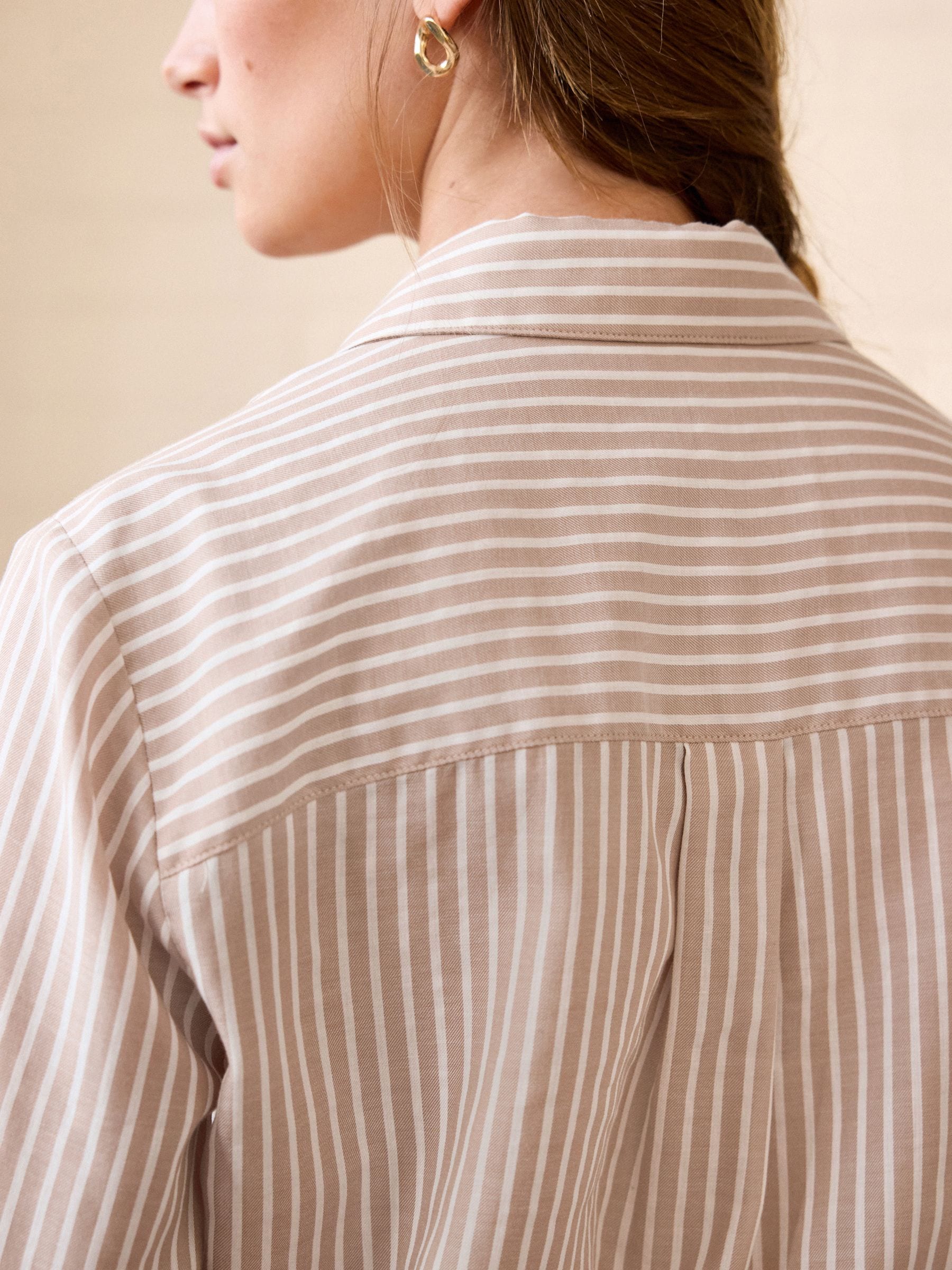 Dress to impress with our neutral striped long-sleeved smart shirt. Crafted from a lightweight TENCEL™ and cotton blend, this long-sleeved button-down shirt is perfect for dressing up or down. The shirt features a button-up fastening, a V-shaped neckline and a classic collar.