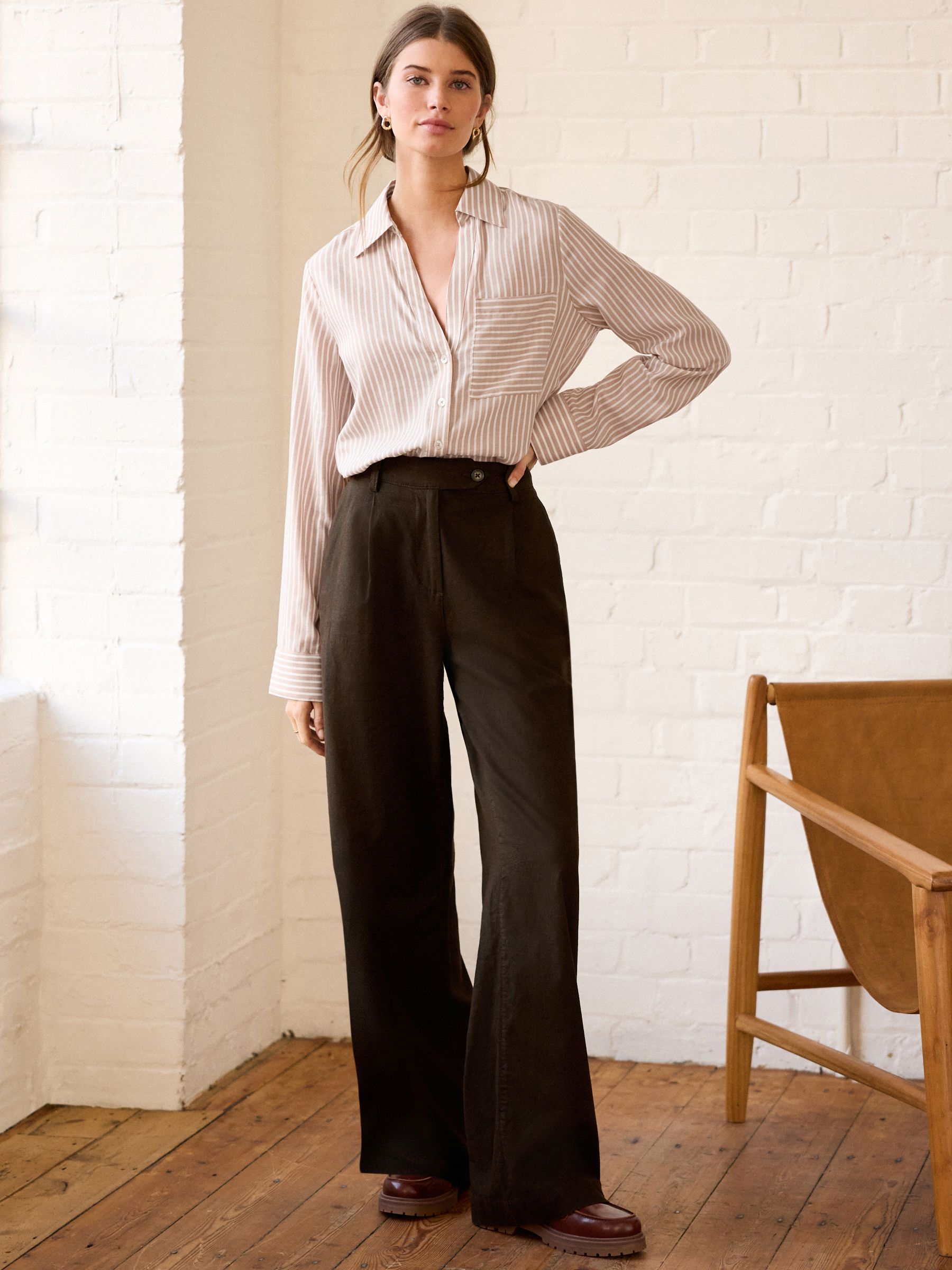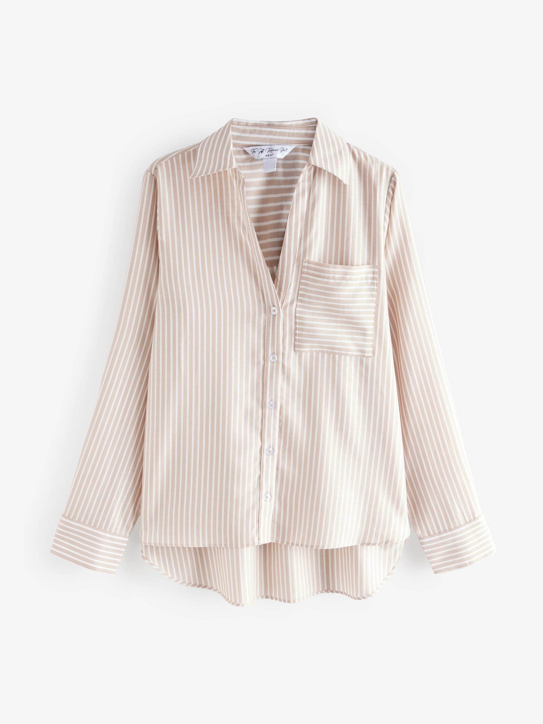 Dress to impress with our neutral striped long-sleeved smart shirt. Crafted from a lightweight TENCEL™ and cotton blend, this long-sleeved button-down shirt is perfect for dressing up or down. The shirt features a button-up fastening, a V-shaped neckline and a classic collar. Relaxed shape Regular sizing Cotton-blend Button fastening V-neck collar Chest pocket Machine washable. 54% Cotton, 46% TENCEL™ lyocell. Items with the curve logo are available in sizes 18 and above.
