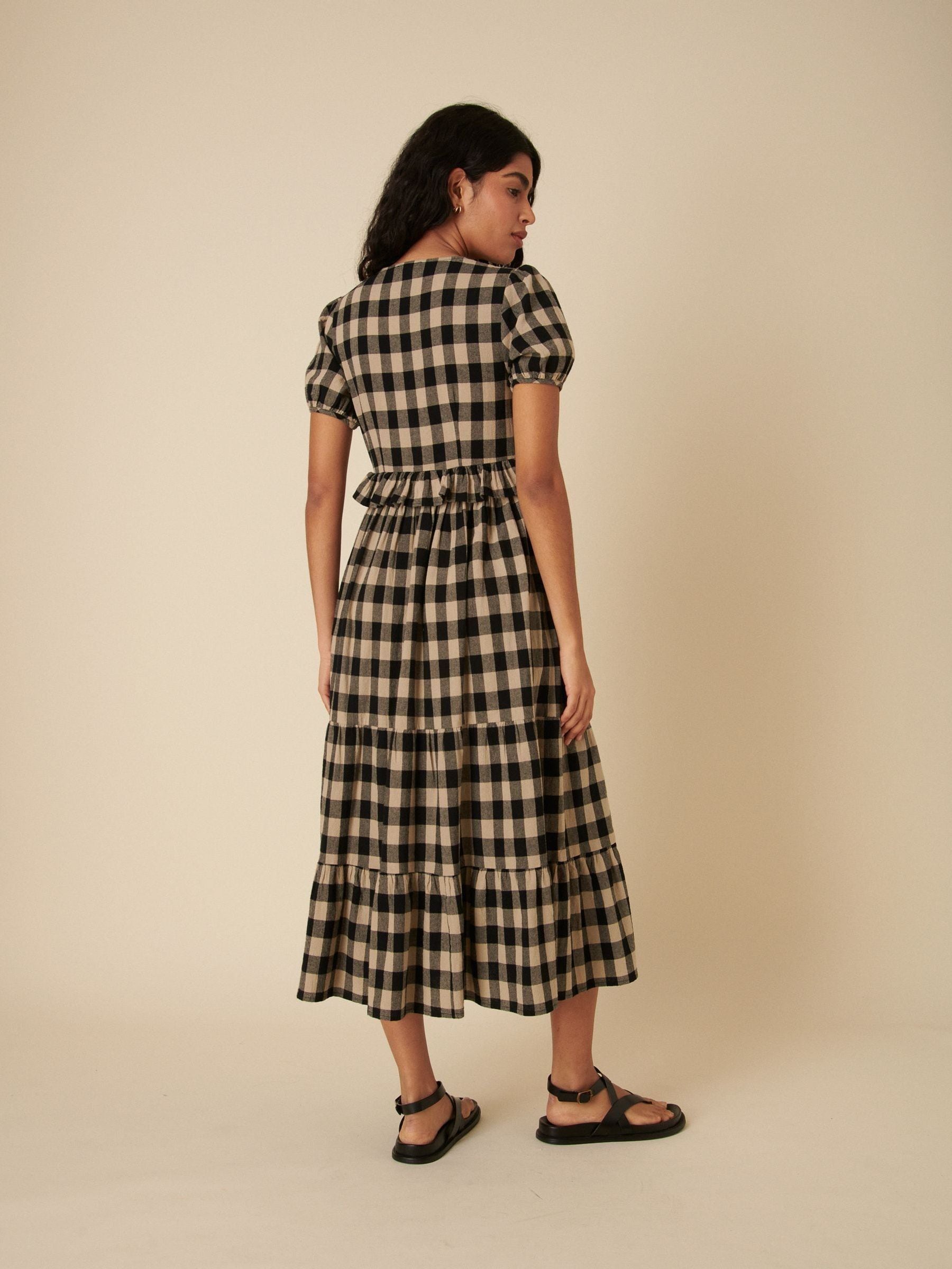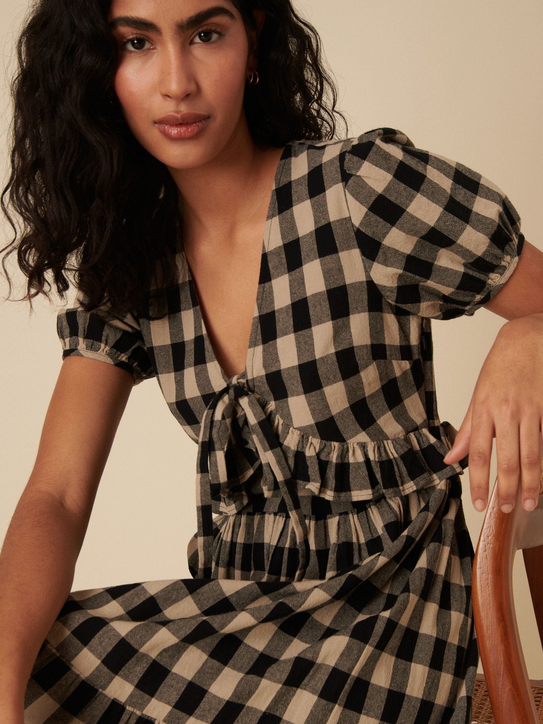 Classic checks, endless charm. In a bold classic black gingham, our Katie dress will be your new go-to. Details include the slightly puffed-up sleeves and tiered swishy skirt. Wear yours with strappy black sandals. V-Neck Mid-length puff sleeves Fitted bodice that defines the waist Relaxed skirt that skims the body Size tip: we recommend your usual size.