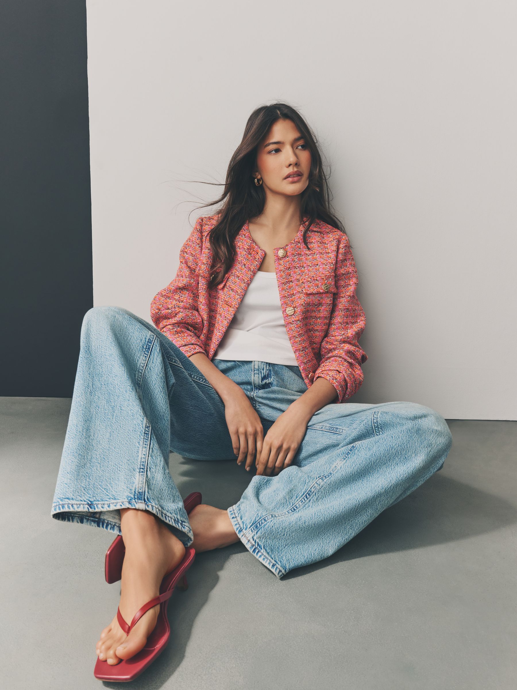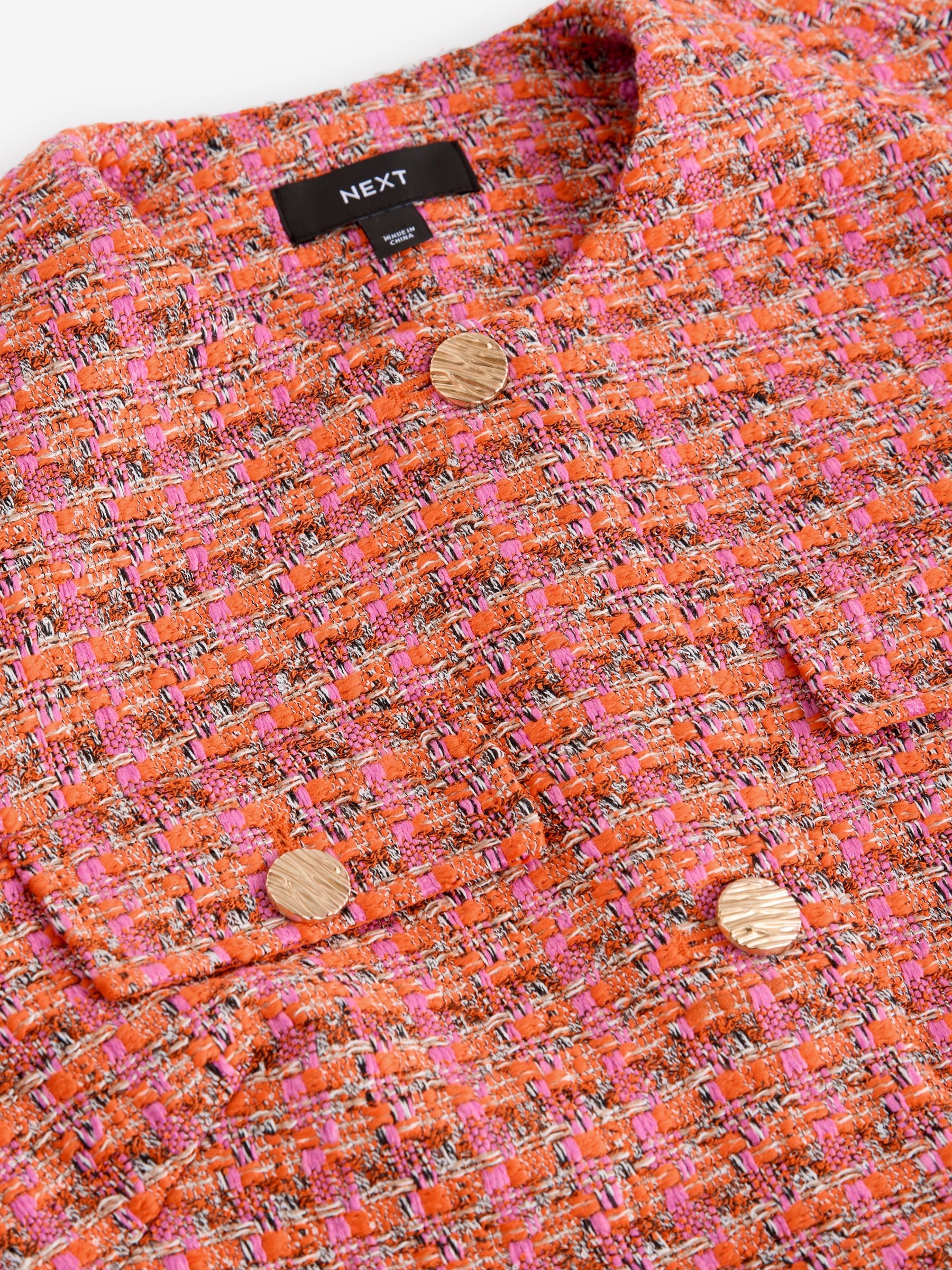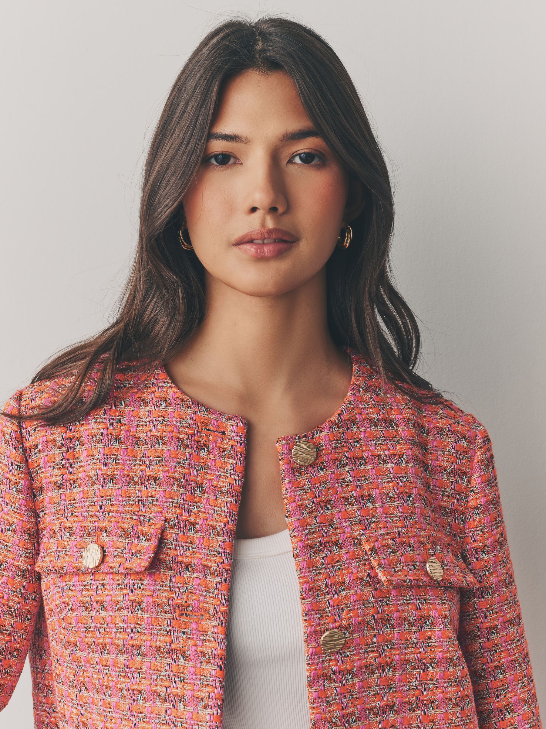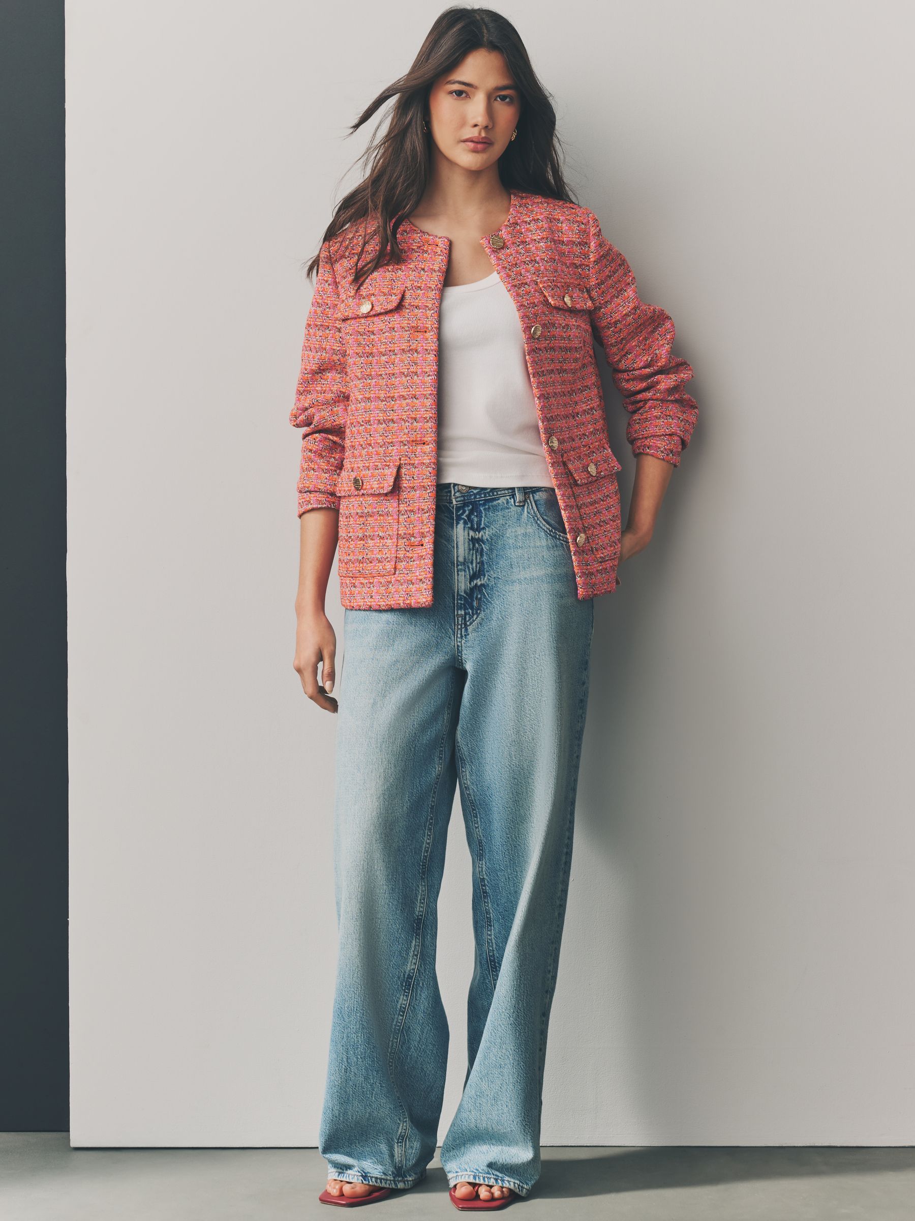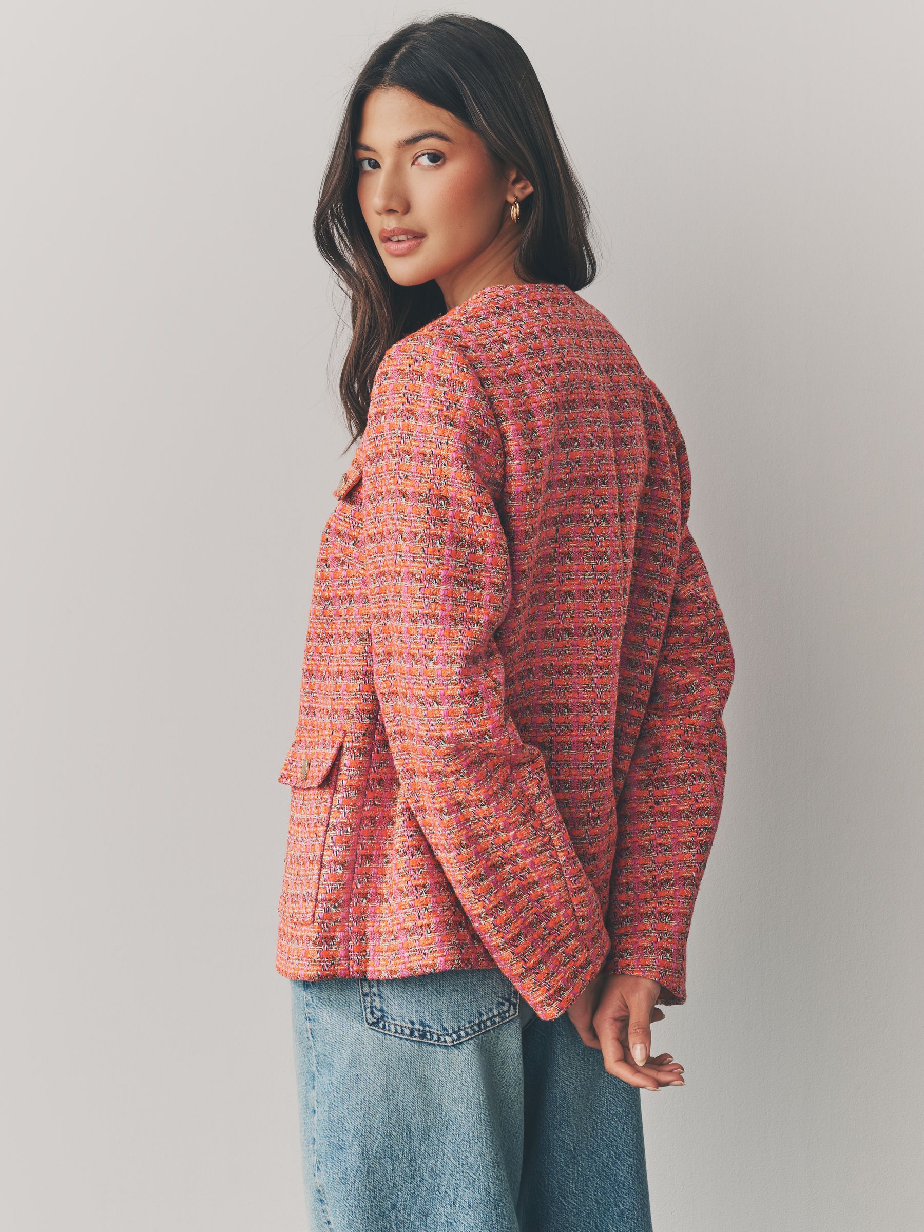 This jacket has a soft boucle textured fabric with a collarless design, a button-up fastening and button pockets, finished with four flap pockets and cut to a regular fit. Boucle fabric Pockets Regular fit Collarless design Regular centre back neck to hem 24.5″ x 62cm. Machine washable. Main 91% Polyester, 3% Acrylic, 3% Viscose, 2% Cotton, 1% Nylon. Lining 100% Polyester. Our tall collection is designed to fit women 5’10” and above. This has been proportionally increased through the body, leg and sleeve to achieve the perfect fit. Available in sizes 8-20., Items with the curve logo are available in sizes 18 and above.