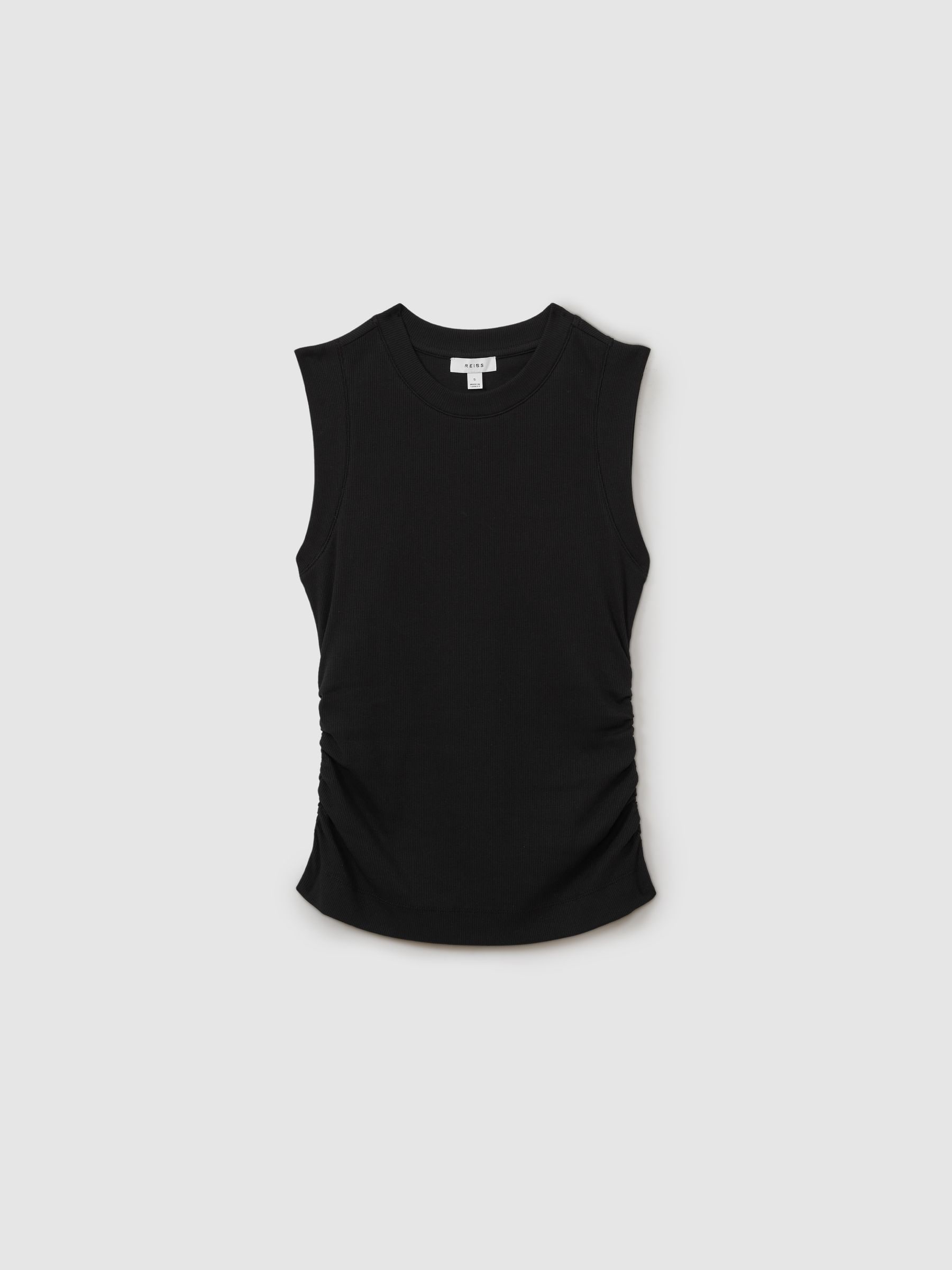 The black Trudy updates a classic vest shape with flattering ruching to the waist and refined capped sleeves. Its ribbed cotton composition is blended with stretch to comfortably hug the body.