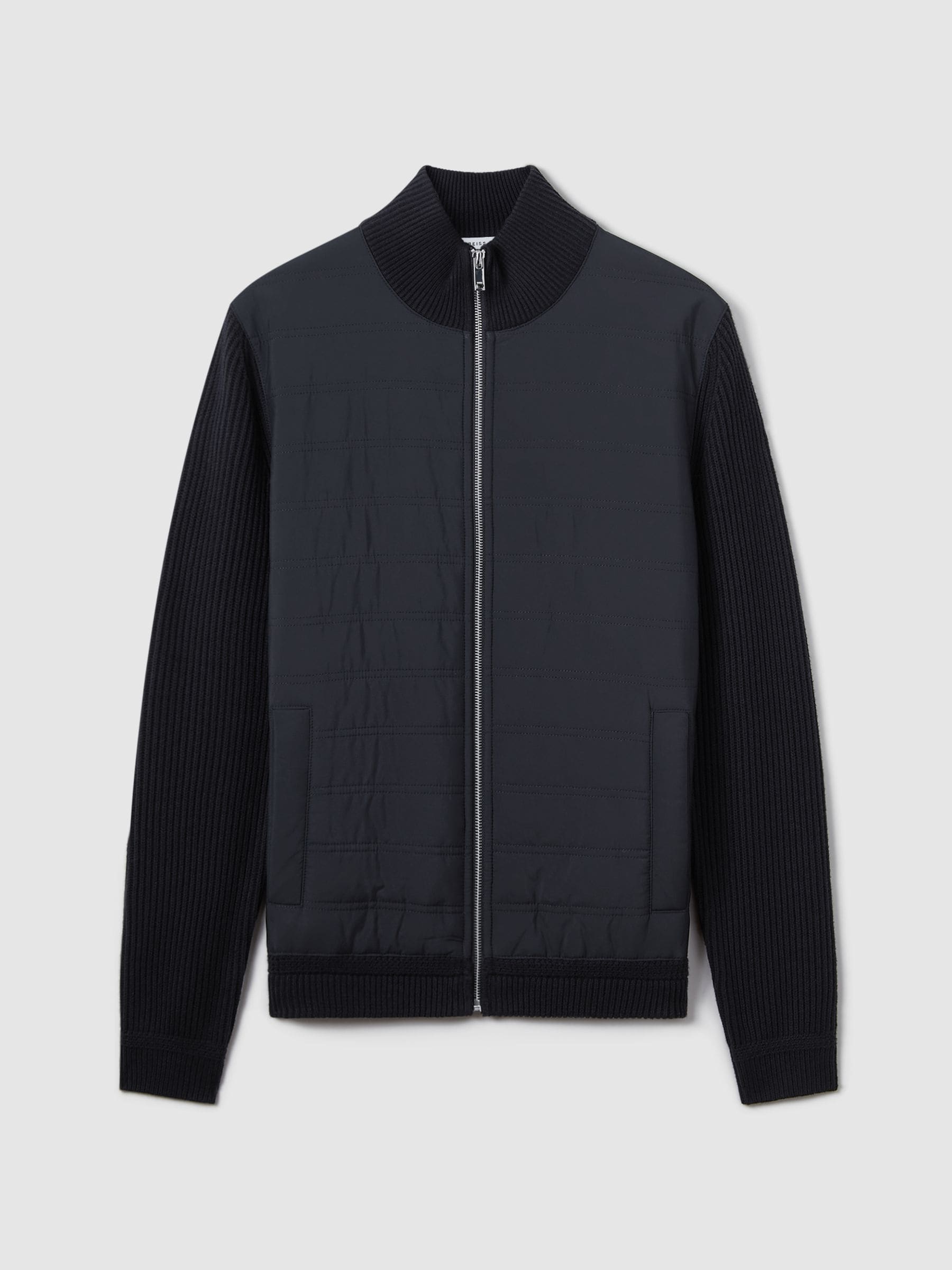 The knitted arms, back, and ribbed funnel neckline of the Trainer jacket in navy are met with a quilted front panel for versatile appeal. This cotton-rich style fastens with a zip and pockets are added for functionality.