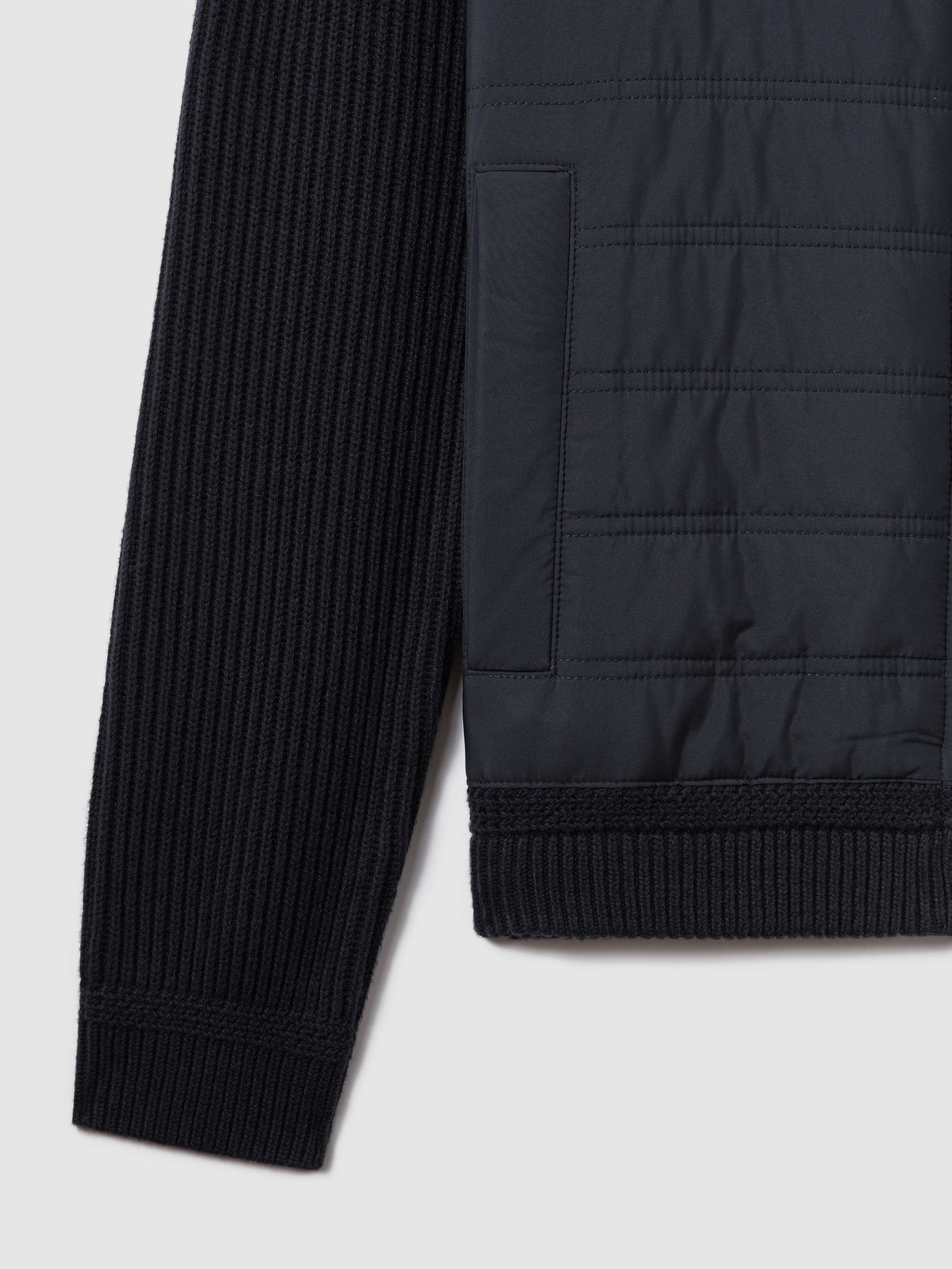 The knitted arms, back, and ribbed funnel neckline of the Trainer jacket in navy are met with a quilted front panel for versatile appeal. This cotton-rich style fastens with a zip and pockets are added for functionality. Hybrid quilt and knit construction Funnel neckline Long sleeves Zip-front closure Side-slip pockets Ribbed trims The model is wearing a size M. Measurements of model: 6ft 2”/188cm. Regular centre back neck to hem 27″ x 68cm. Hand wash only. Front Panel 100% Polyester. Body 70% Cotton, 20% Nylon, 10% Wool. Filling 100% Polyester.