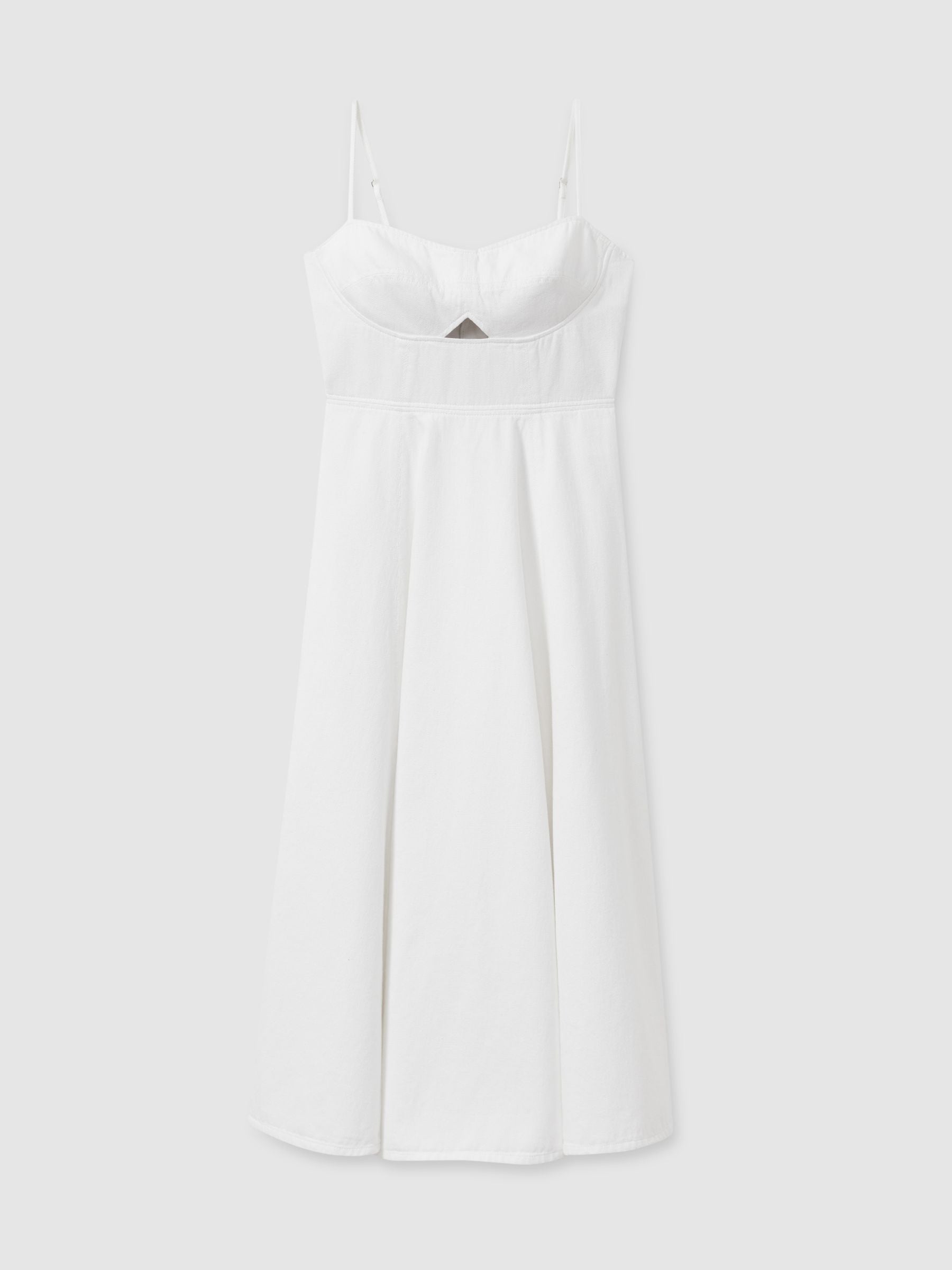 The Annie dress is arranged with a fit-and-flare silhouette that drapes out from the empire waistband. Made from denim, it offers structure and smooth stretch for comfort. Cut-out detail to bust Adjustable shoulder straps Zip-closure to reverse Fit-and-flare silhouette Midi length Machine washable. 100% Cotton.