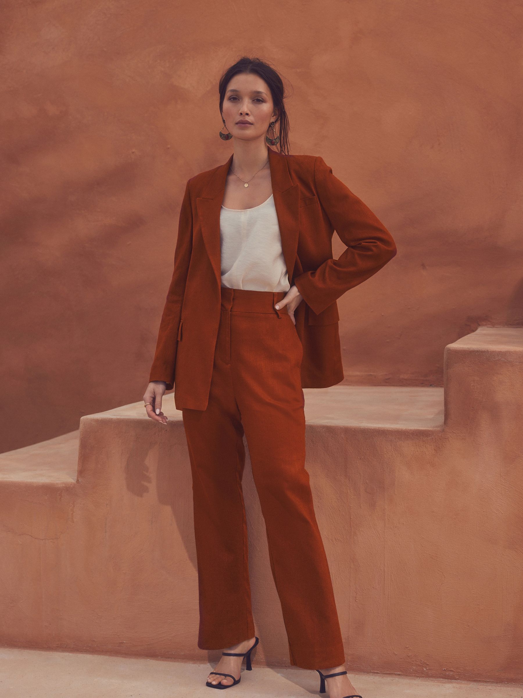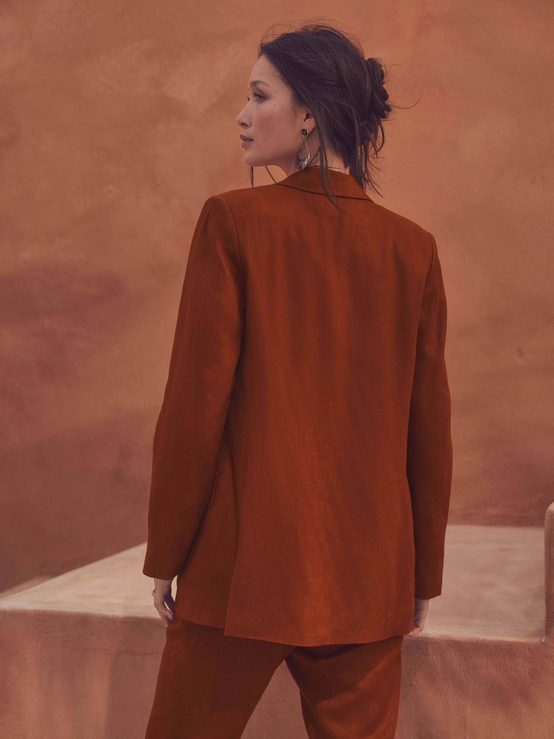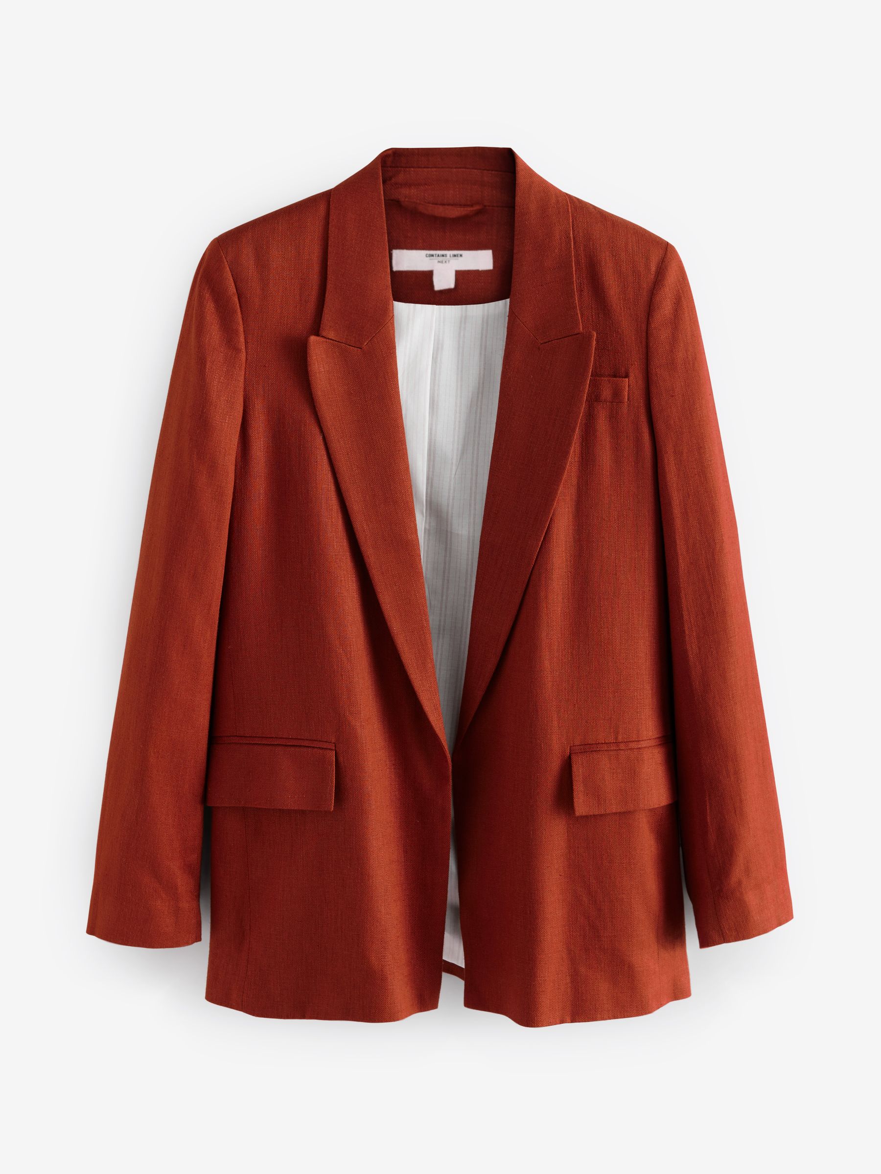 With a lightweight feel, this rust brown blazer jacket has a comfortable with added linen, featuring a lapel collar, flap mock pockets and a button-free opening, finished with a printed lining. Regular fit Lightweight feel Added linen Lapel collar Flap mock pockets Printed lining Machine washable. Main 75% LENZING™ ECOVERO™ Viscose, 25% Linen. Lining 85% Recycled polyester, 15% Cotton. Our tall collection is designed to fit women 5’10” and above. This has been proportionally increased through the body, leg and sleeve to achieve the perfect fit. Available in sizes 8-20., Items with the curve logo are available in sizes 18 and above.