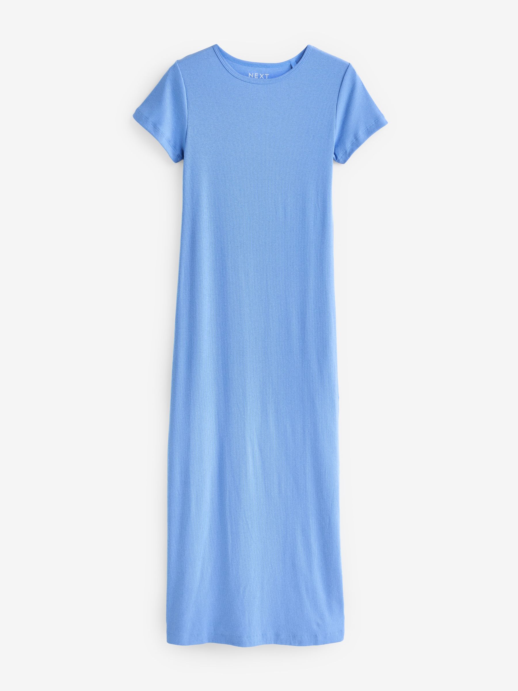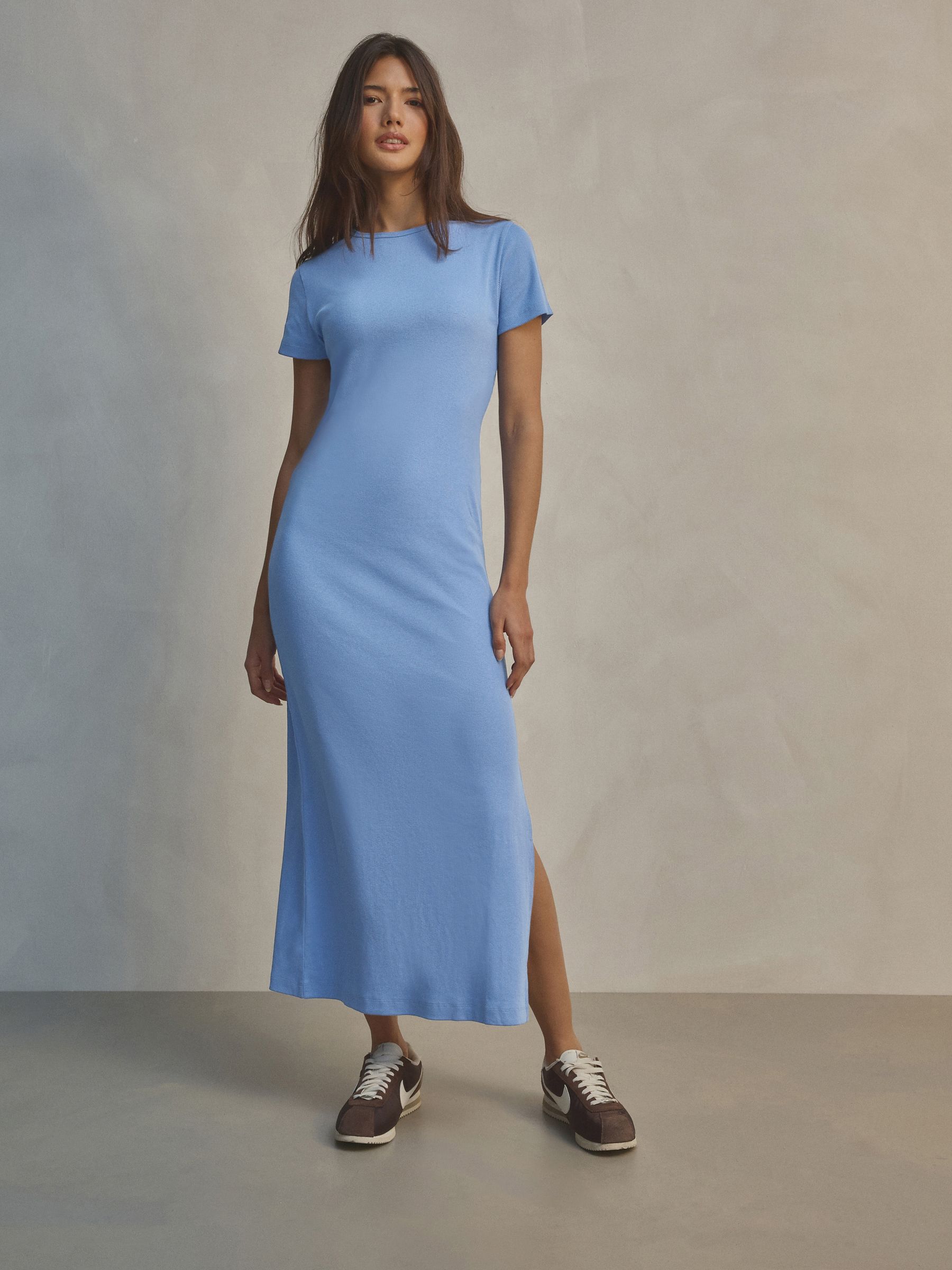 This product has a tighter fit than usual. A timeless warm weather staple, our ribbed T-Shirt style maxi dress is understated, yet elegant. Designed in a ribbed cotton stretch fabric with a T-Shirt silhouette and slit detail to the hem. Ribbed cotton stretch fabric T-Shirt style Crew neck Short sleeve Slit detail Maxi length Machine washable. 57% Cotton, 38% Polyester, 5% Elastane.
