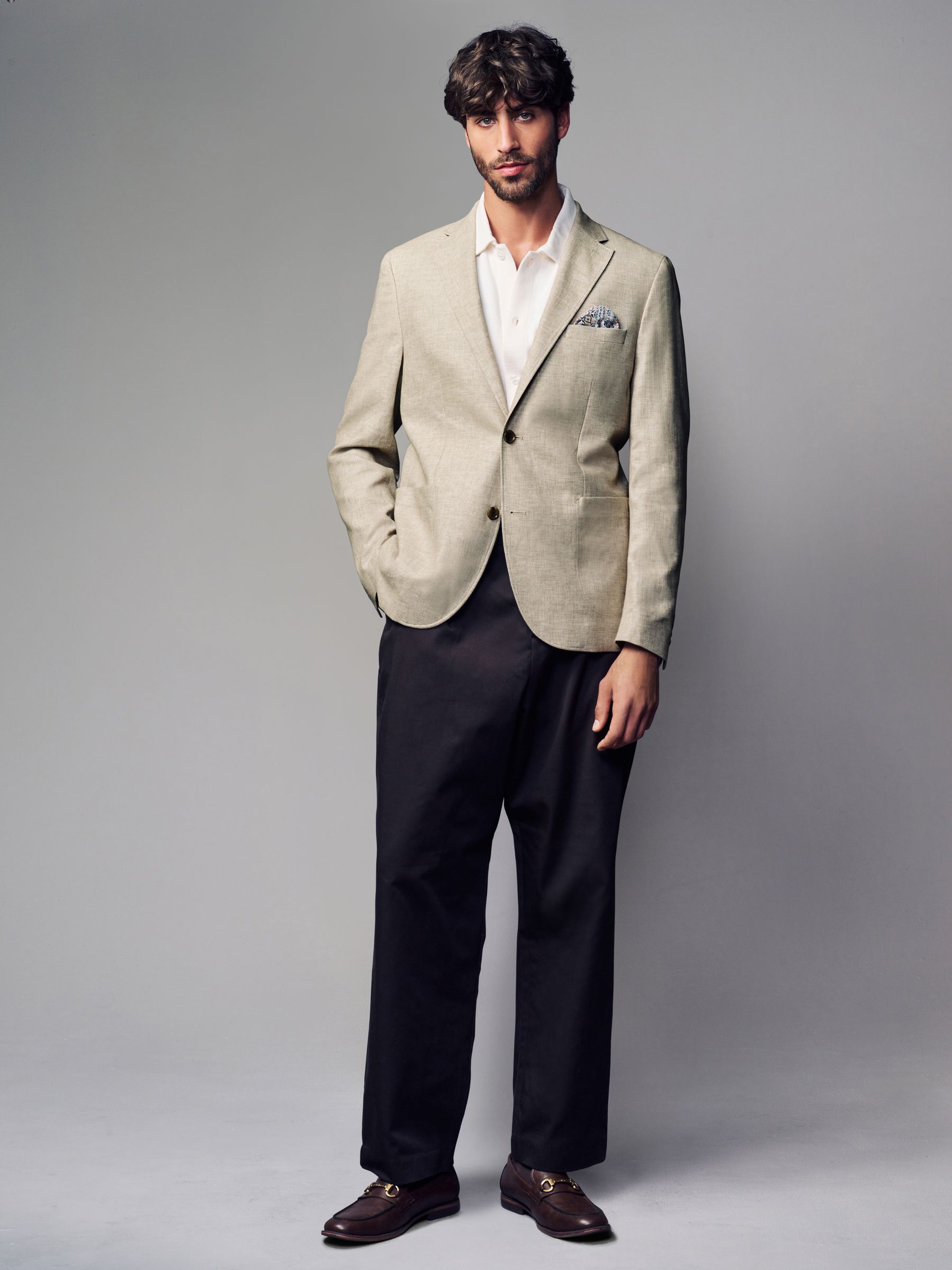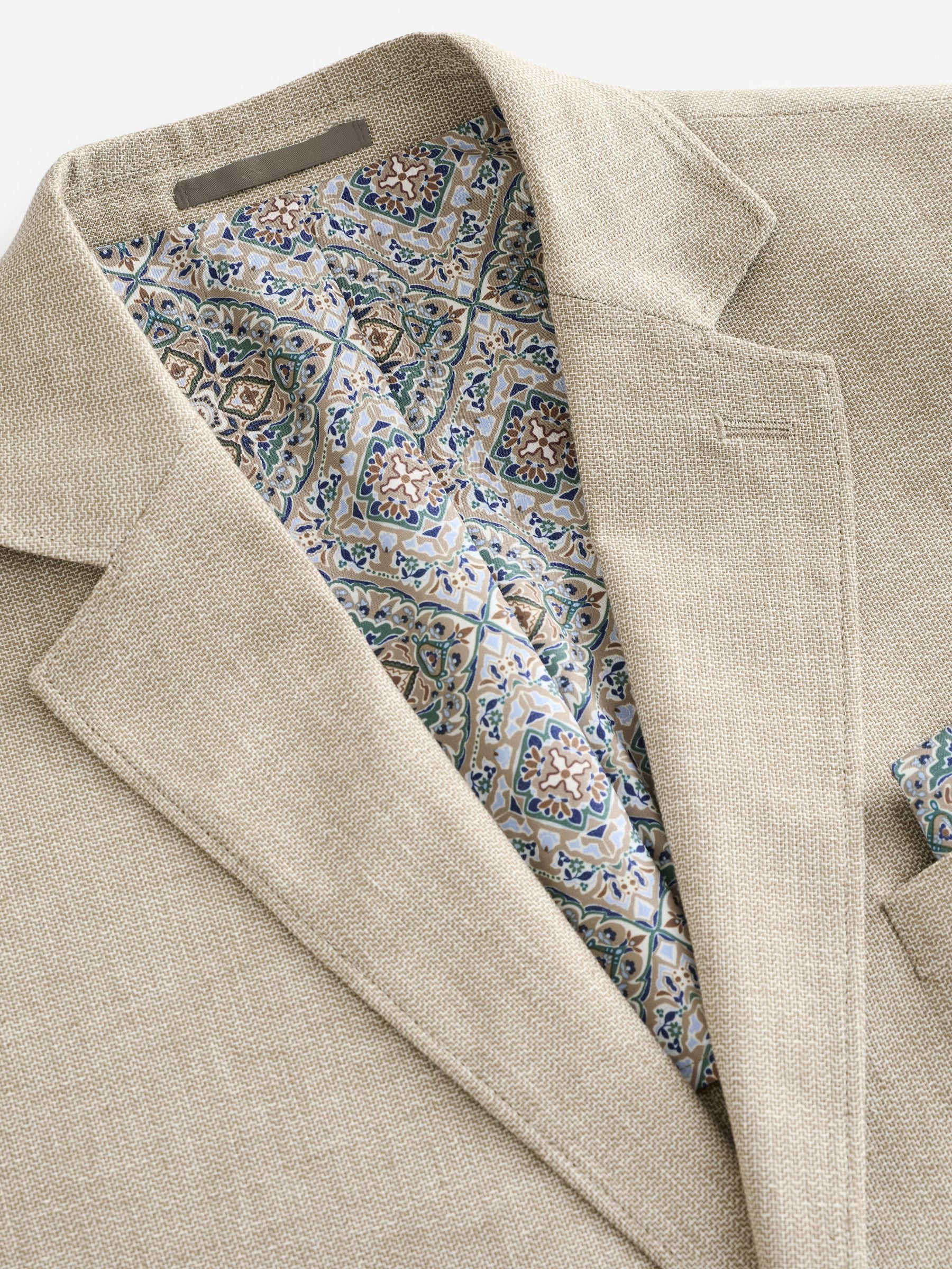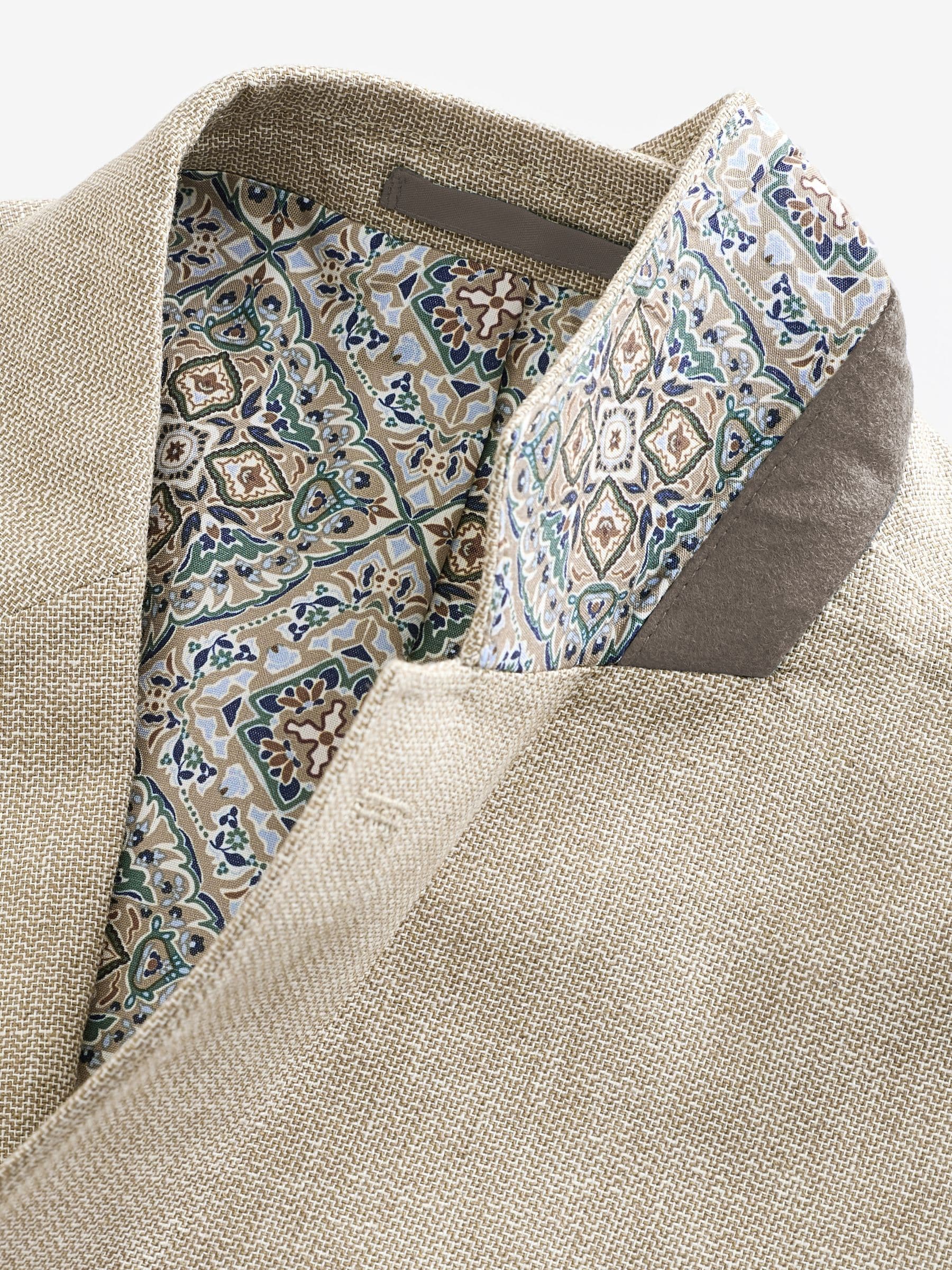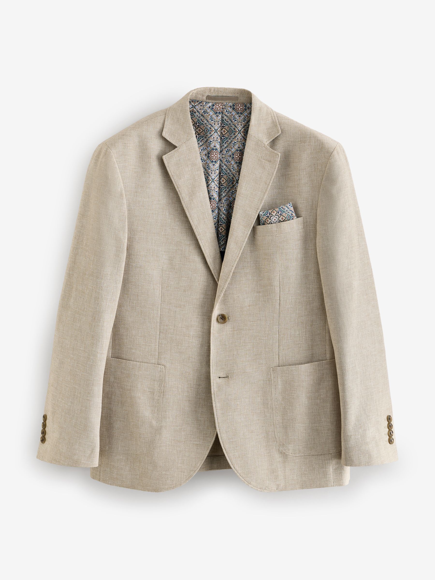 A stylish summer wardrobe essential for special occasions, our textured stone linen blend blazer is perfect for looking suave in the warmer weather. With contemporary zig zag textured linen fabric, this lightweight piece features a regular fit and features pockets, button fastening, notched lapels and printed lining. Regular fit Linen blend Button fastening Pockets Dry clean only. Main 55% Linen, 45% Cotton. Lining 65% Polyester, 35% Cotton.