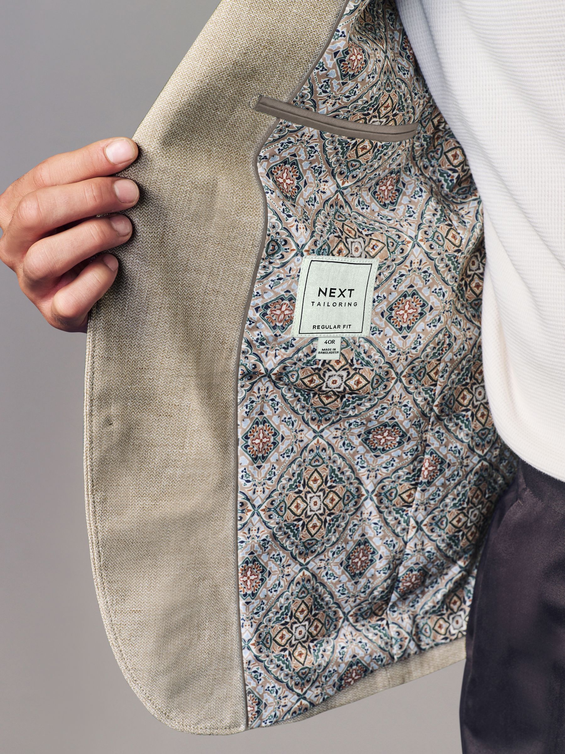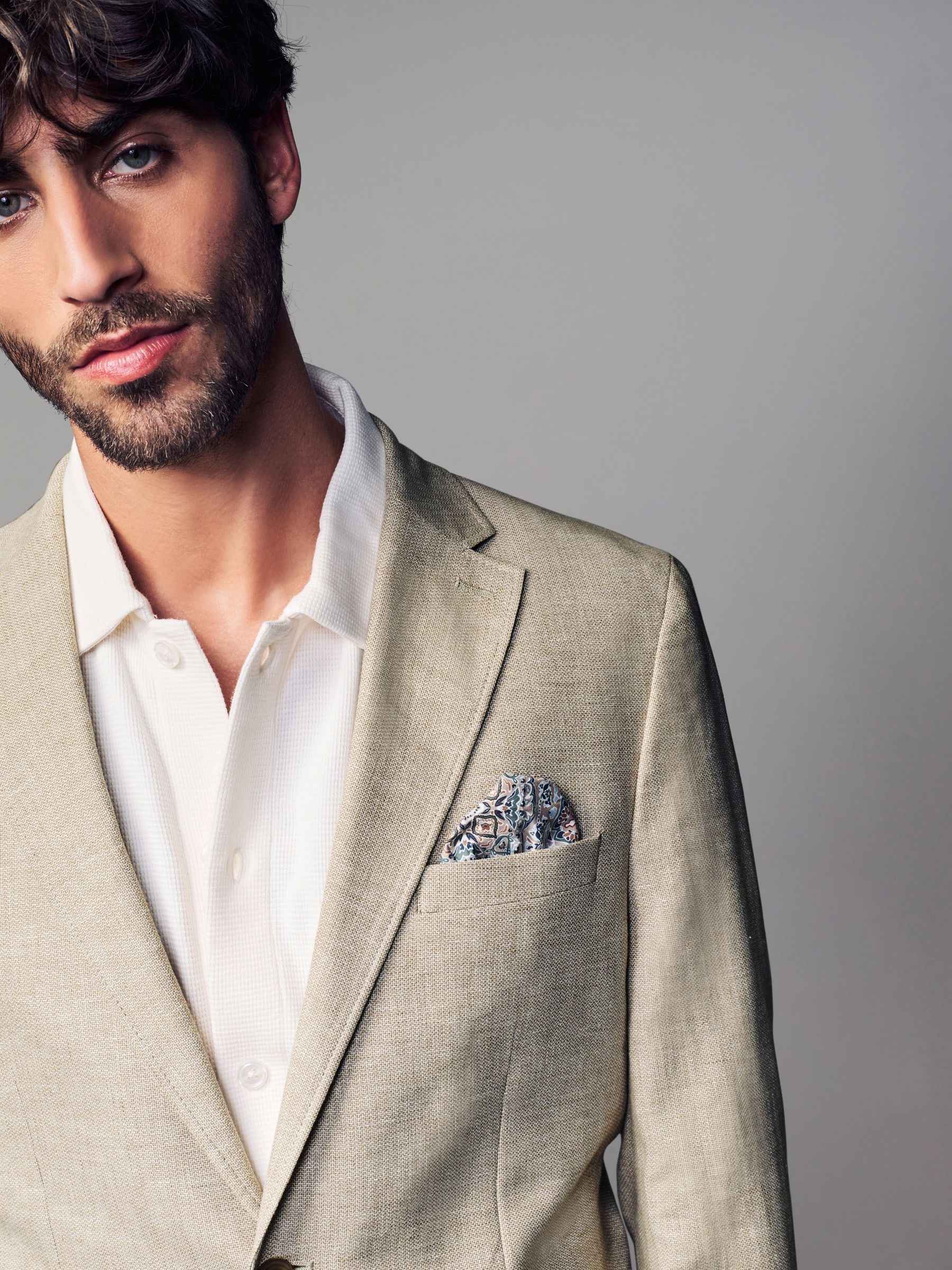 A stylish summer wardrobe essential for special occasions, our textured stone linen blend blazer is perfect for looking suave in the warmer weather. With contemporary zig zag textured linen fabric, this lightweight piece features a regular fit and features pockets, button fastening, notched lapels and printed lining.