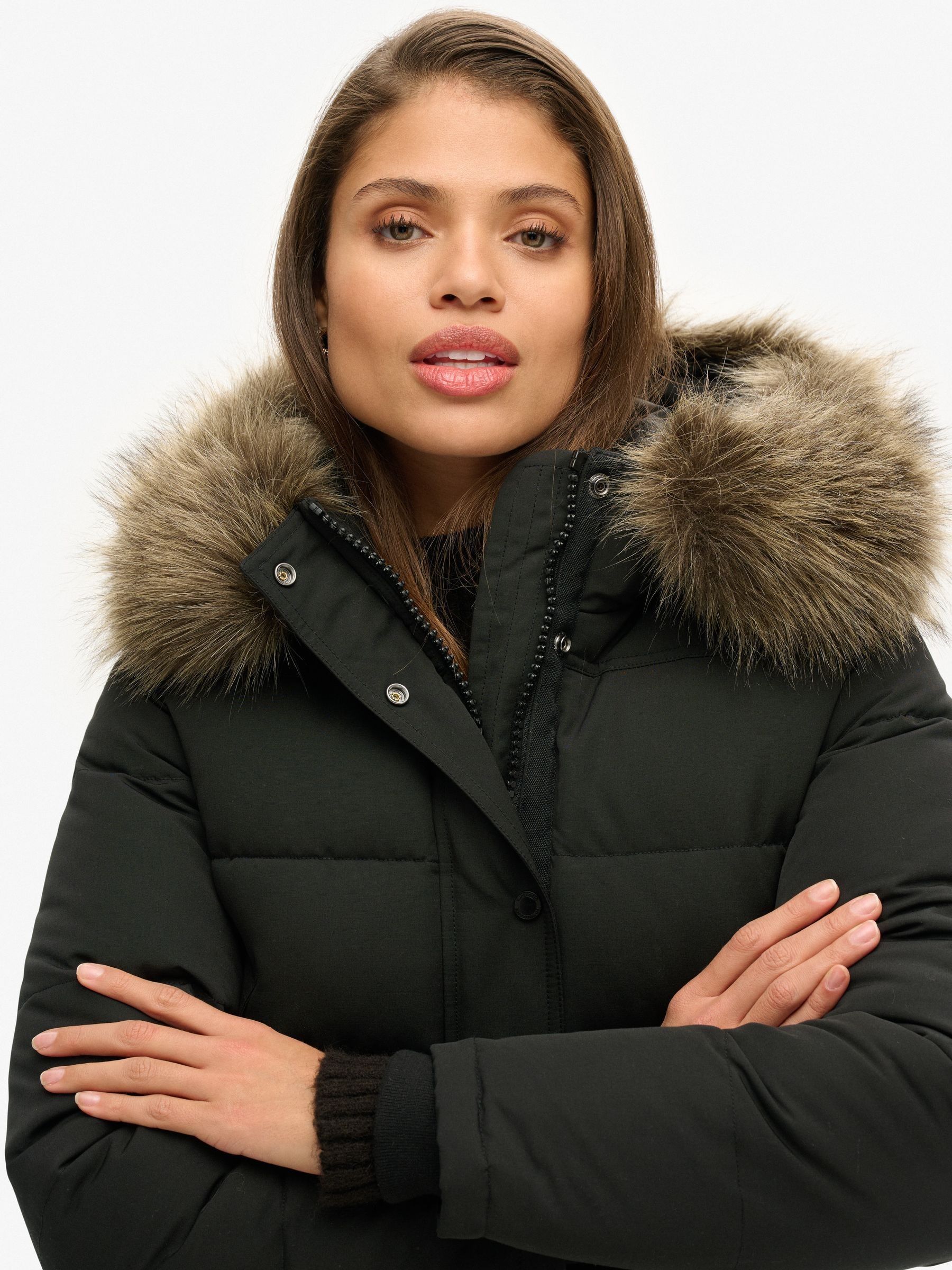 - Hooded with removable faux fur trim and bungee cord adjuster