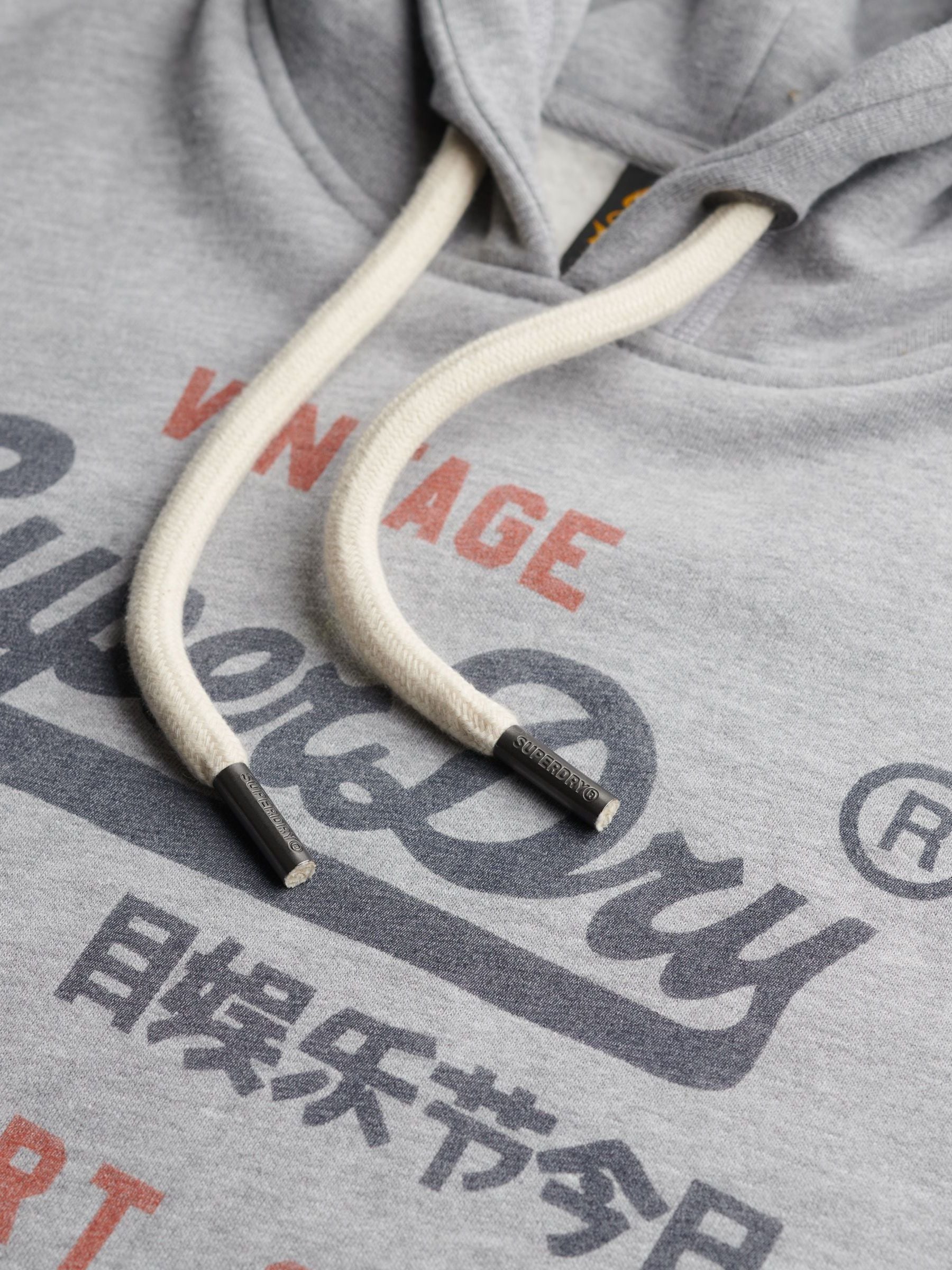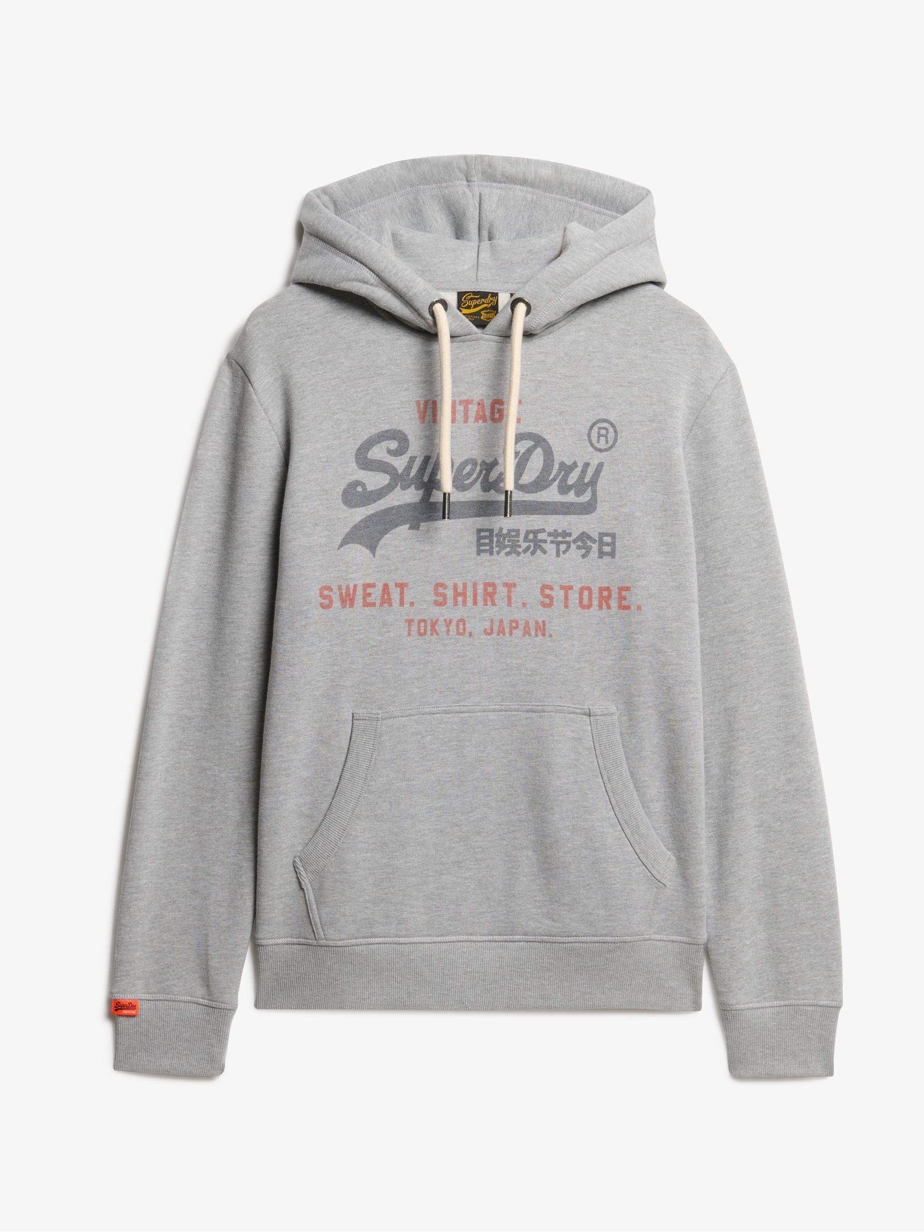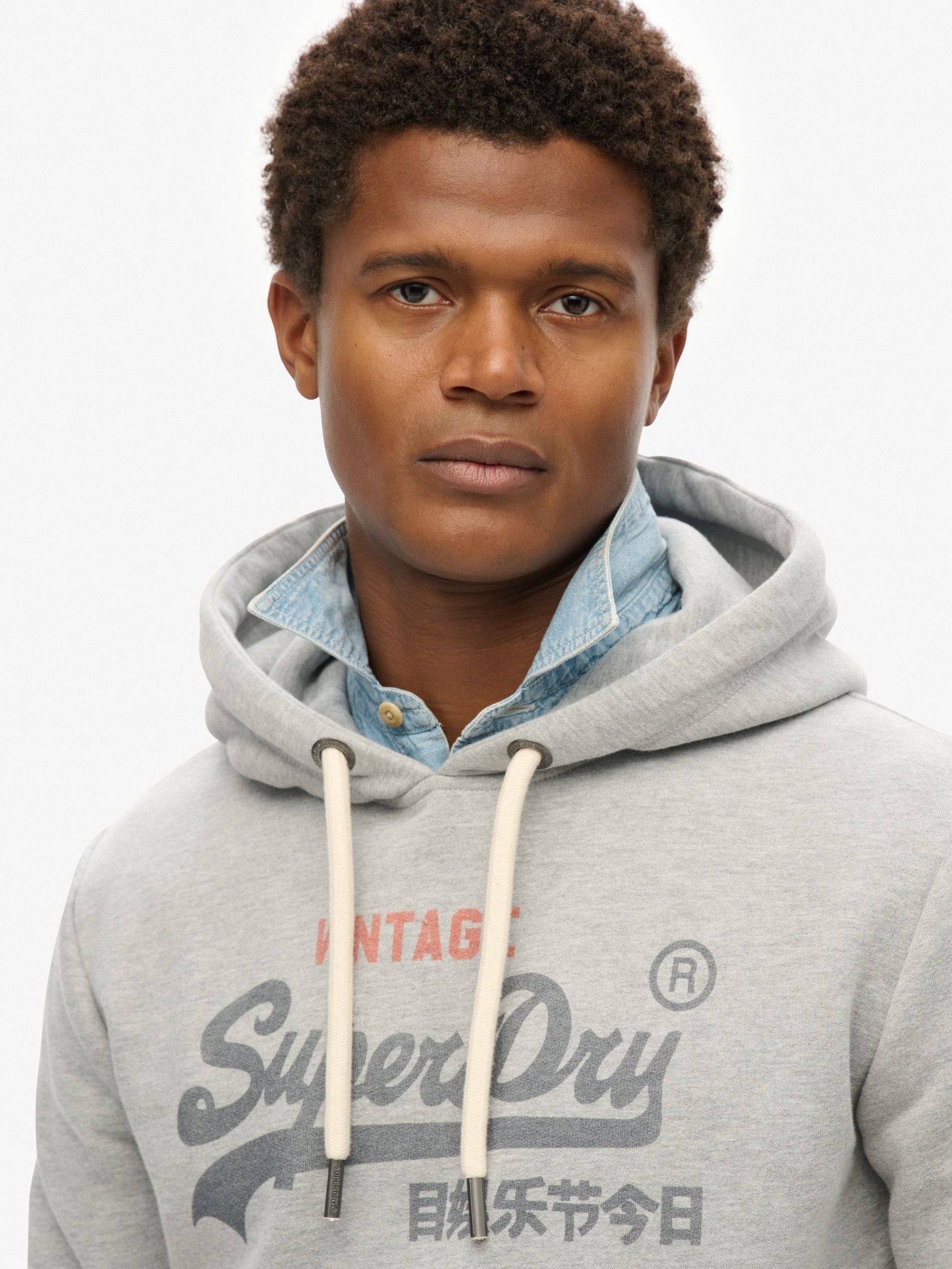 Relaxed fit the classic Superdry fit. Not too slim, not too loose, just right. Go for your normal sizeHooded with an adjustable drawstringExternal front pocket with ribbed lining, cuffs and hemline Lightly brushed lining and a large graphic across the chest Signature tab on the cuffAn iconic design that’s been perfected over the years with immense quality. The Vintage Logo Heritage Relaxed Hoodie has been finished with a luxury lightly brushed lining and faded graphic across the chest for that much-loved vintage feel to it.