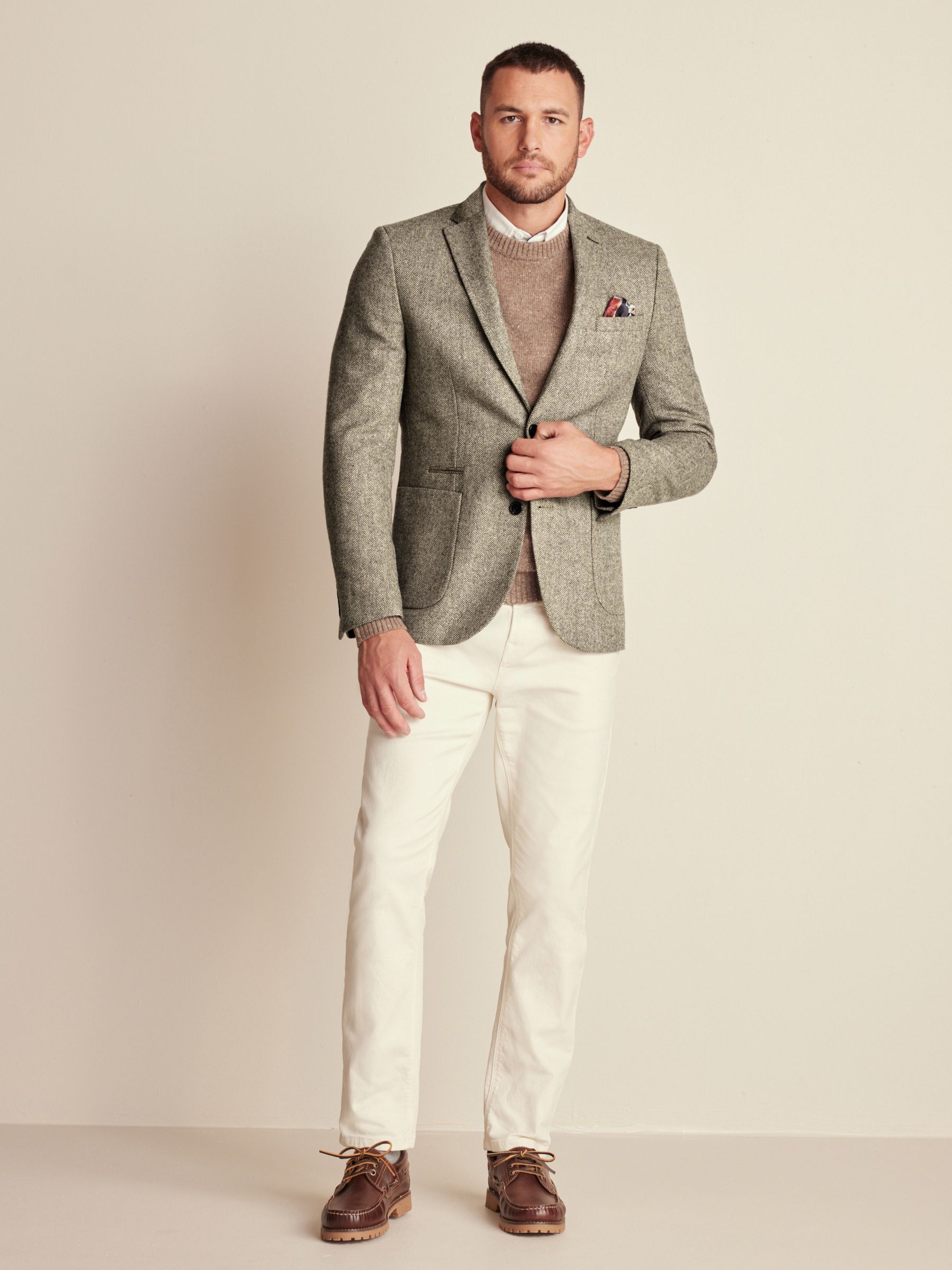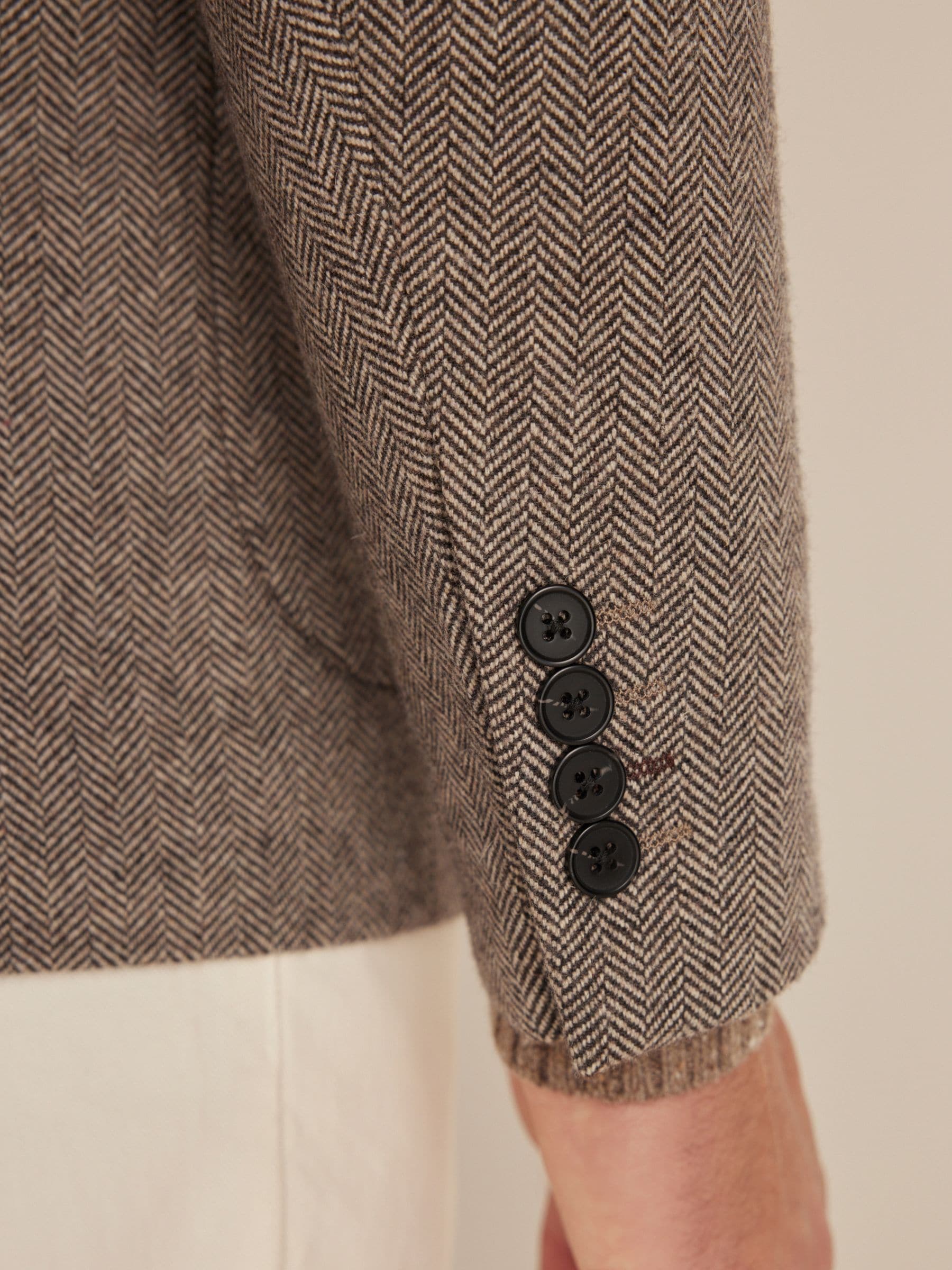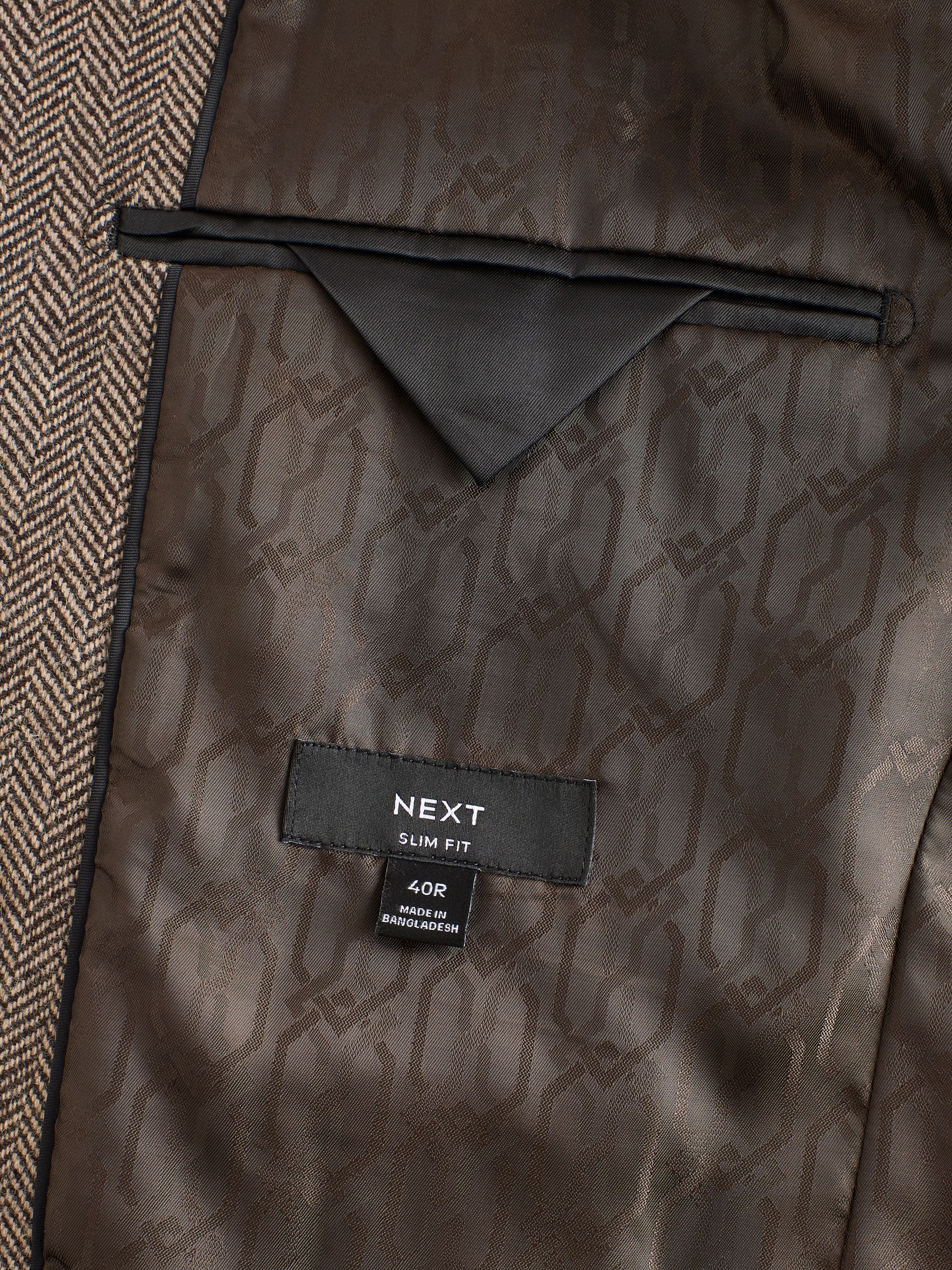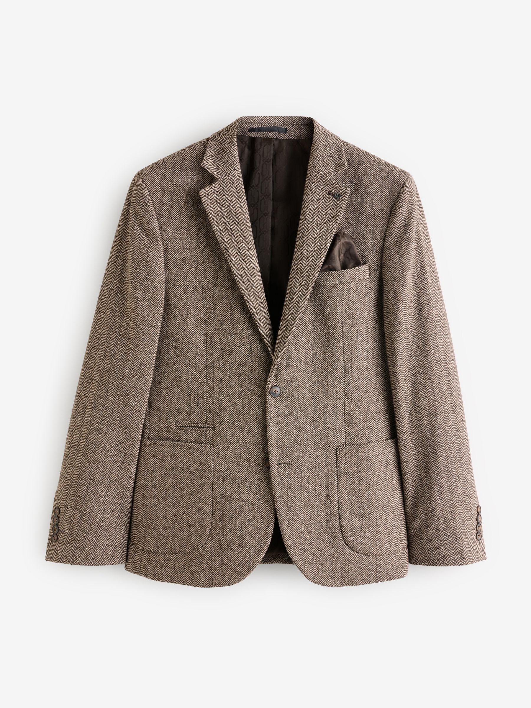 Perfect for elevating a smart casual outfit or worn to the office, this stylish taupe slim fit blazer is crafted from a wool-rich herringbone fabric blend, featuring a notched lapel collar, leading to a single-breasted two-button fastening. The blazer also features dual front pockets, a chest pocket with a pull-out pocket square and a printed internal lining. Slim fit Wool-rich herringbone fabric Soft feel Notched lapel collar Dual front pockets Chest pocket with pocket square Single breasted 2-button fastening Dry clean only. Main 53% Wool, 43% Polyester, 3% Acrylic, 1% Nylon. Lining 100% Polyester.