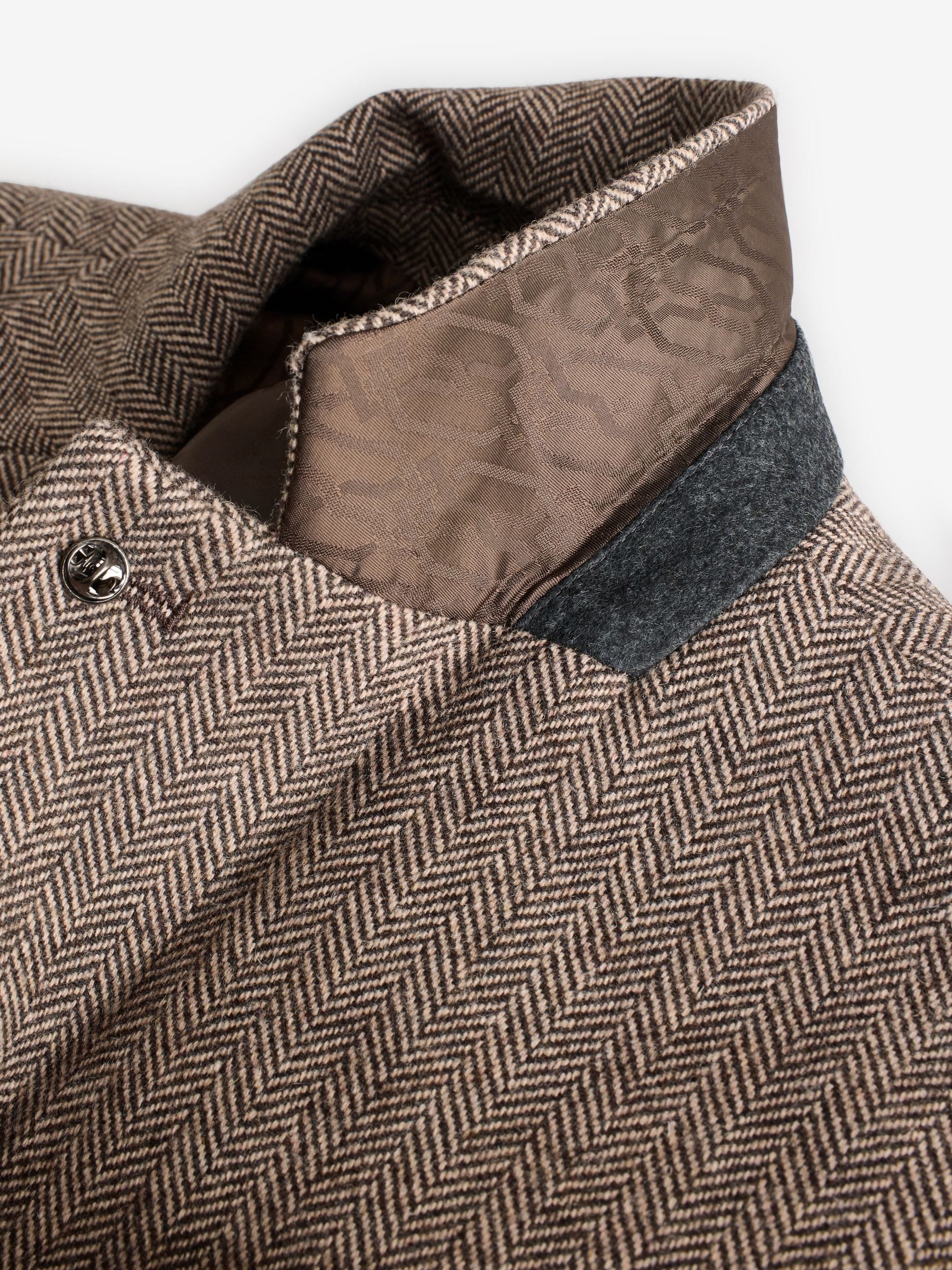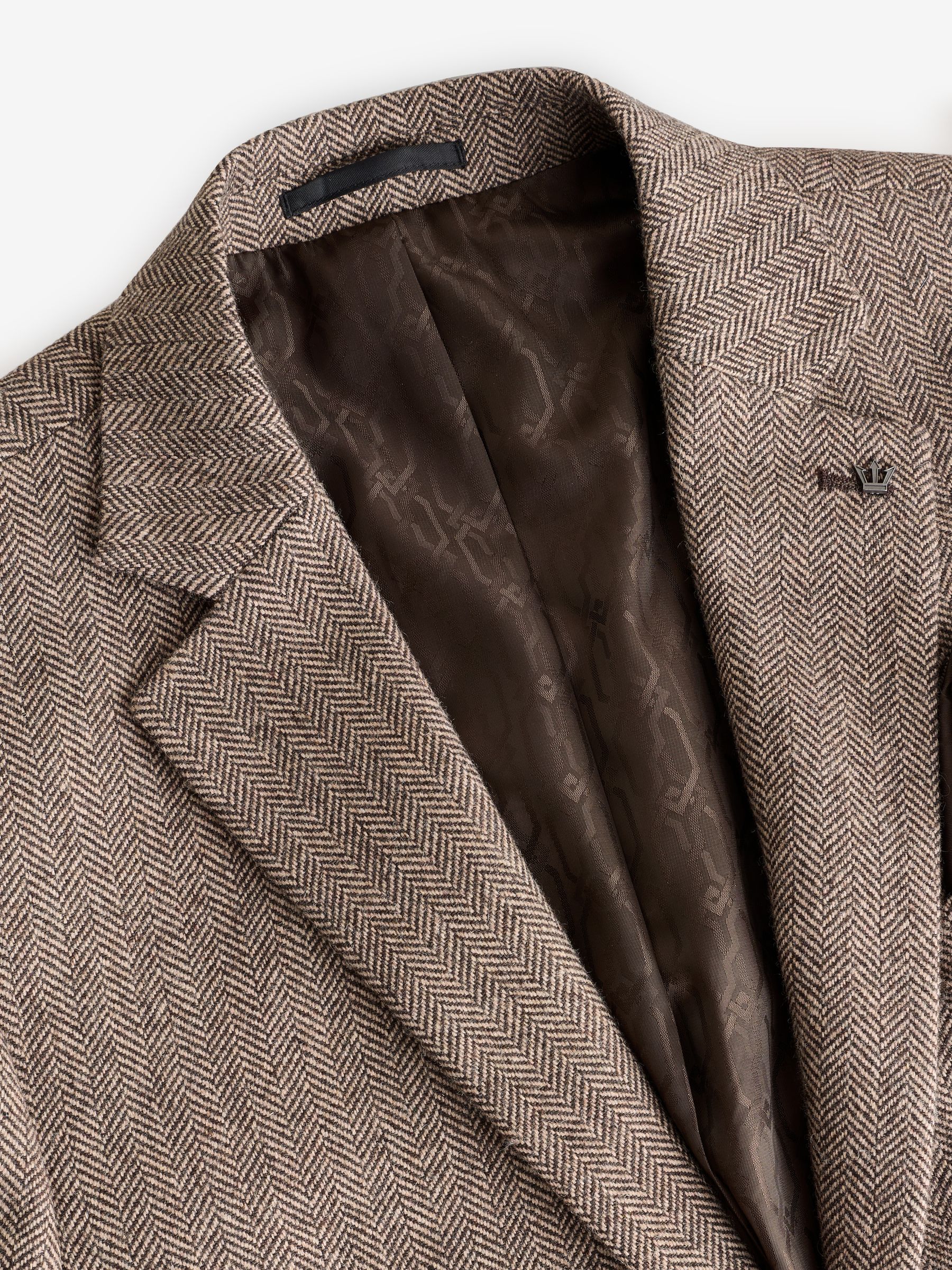 Perfect for elevating a smart casual outfit or worn to the office, this stylish taupe slim fit blazer is crafted from a wool-rich herringbone fabric blend, featuring a notched lapel collar, leading to a single-breasted two-button fastening. The blazer also features dual front pockets, a chest pocket with a pull-out pocket square and a printed internal lining.