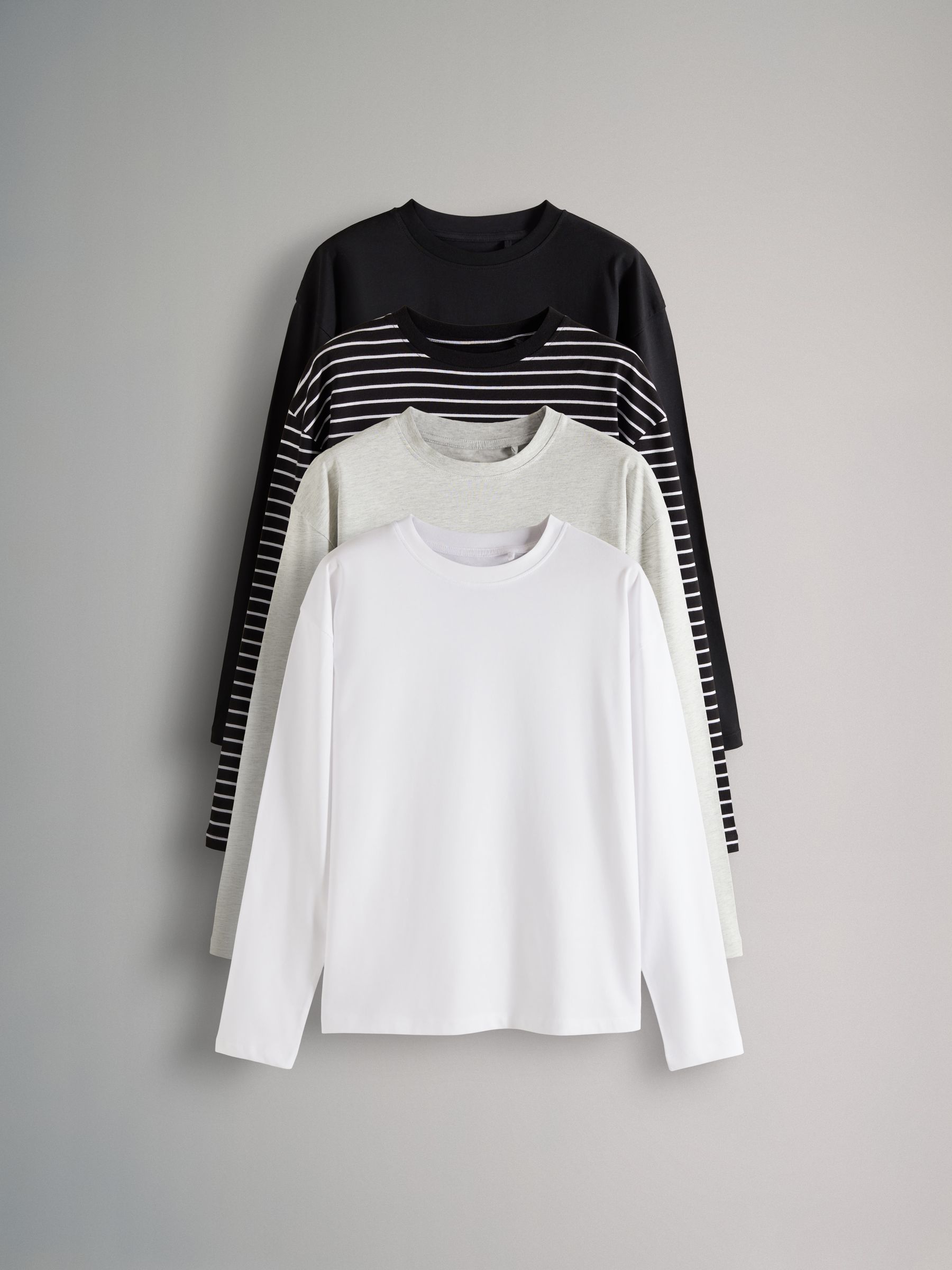 Elevate your basics with our long sleeve top multipack from The Set. Designed in soft cotton for a relaxed fit, the pack includes four tops in alternate colourways, black, white, grey and a monochrome stripe with a simple crew neck. They are the perfect starting point for your everyday outfit and will look great worn with our leggings, a sweatshirt and some trainers for an effortless outfit.
