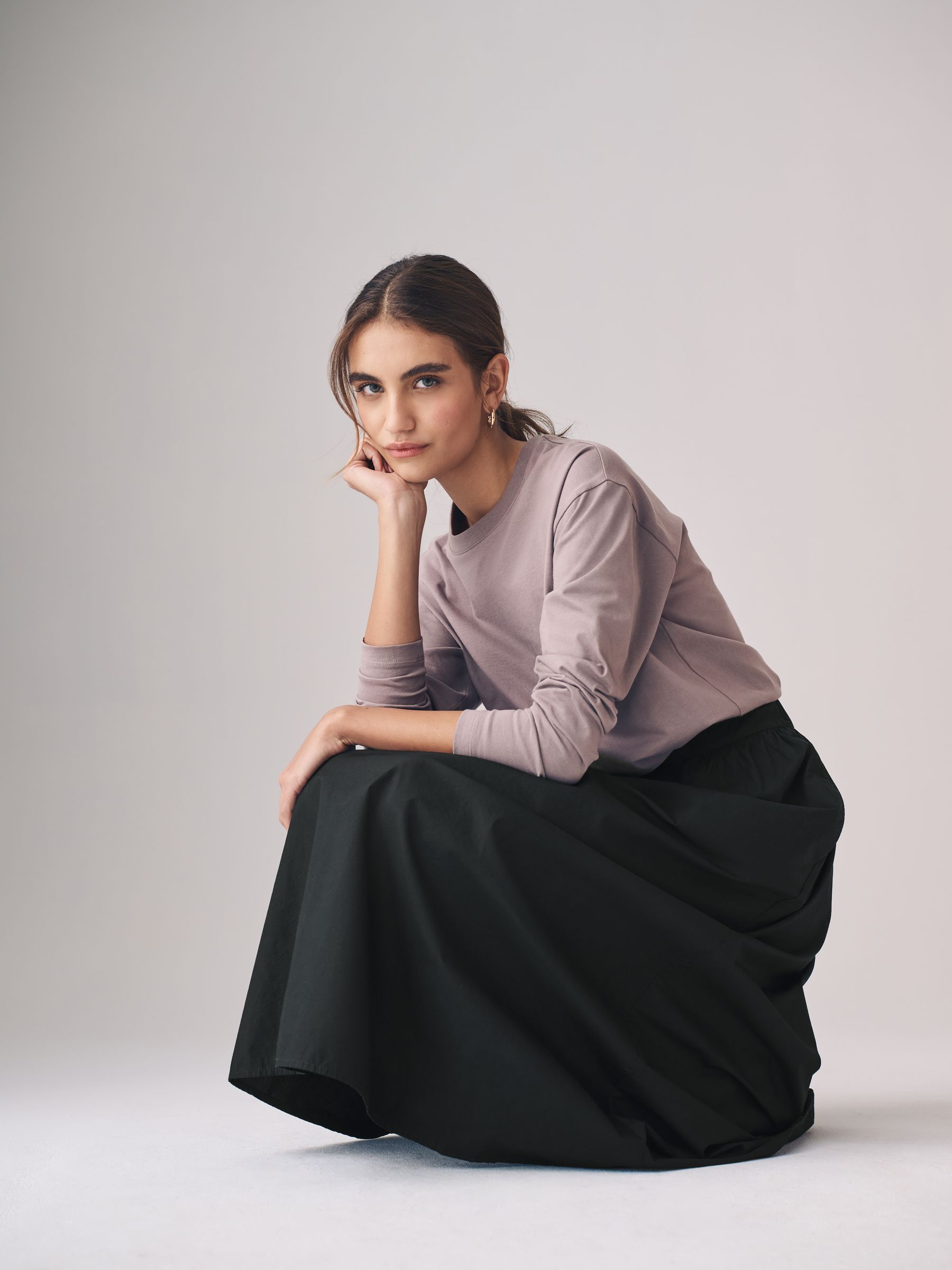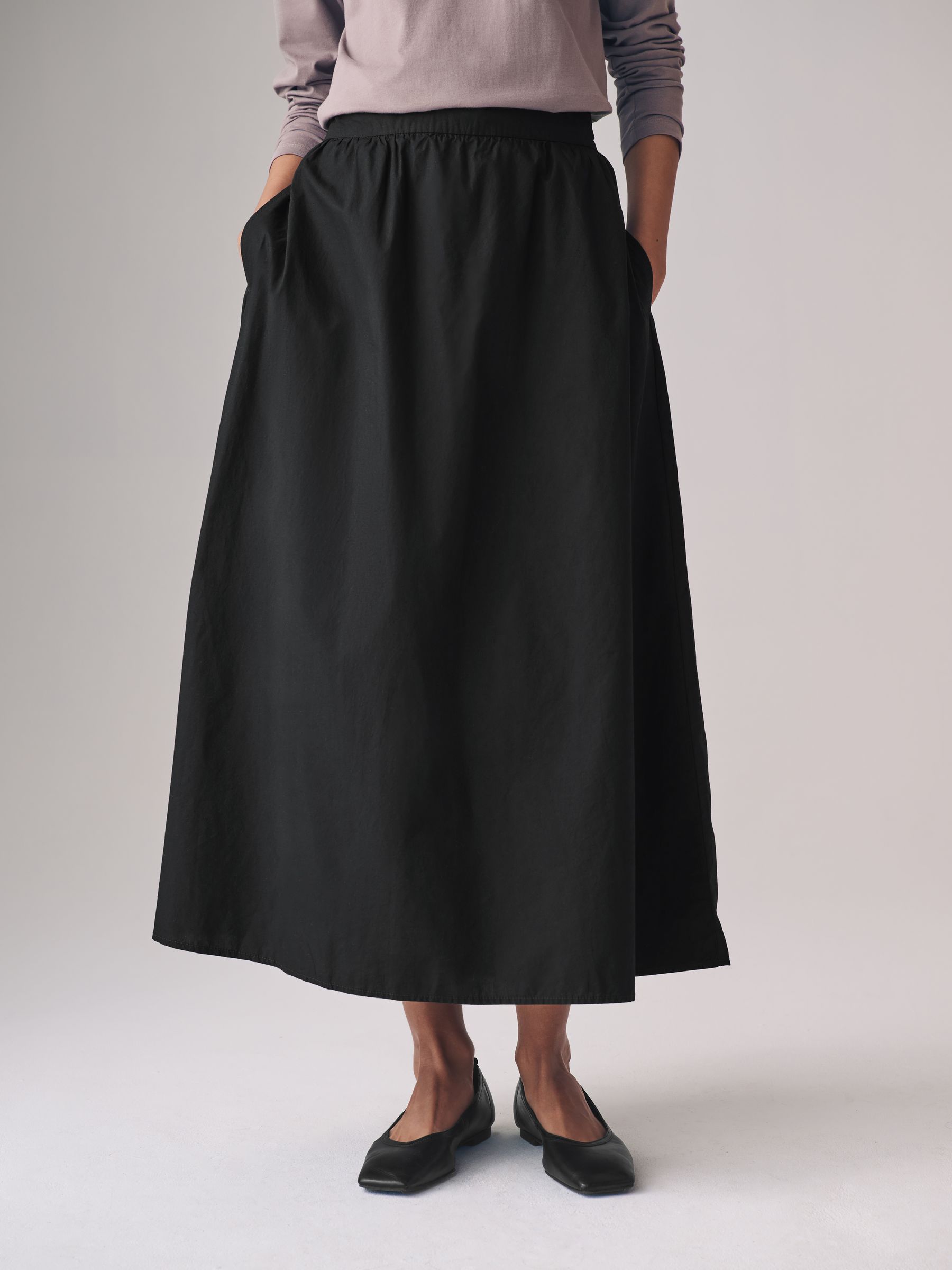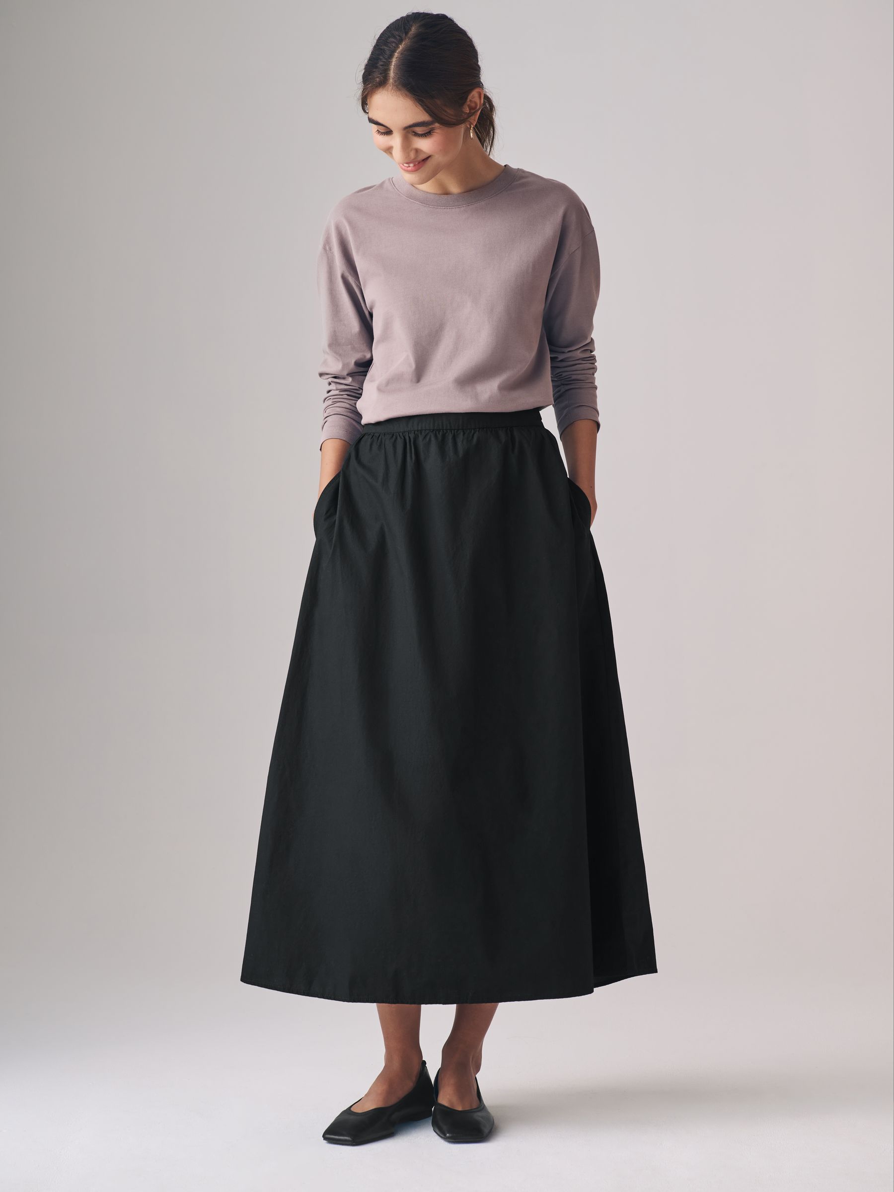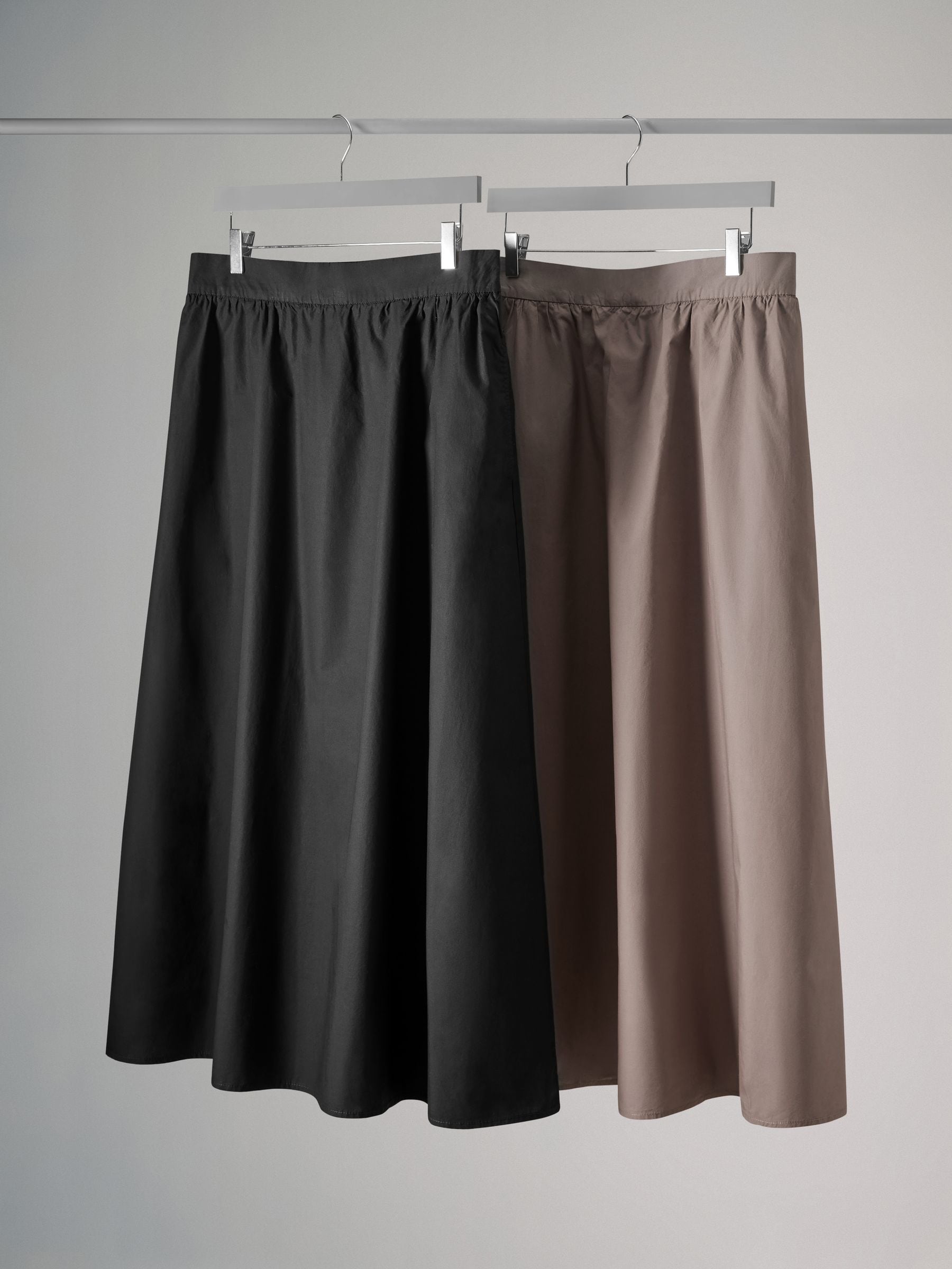 Our full midi skirt two pack from The Set will be a versatile addition to your wardrobe. Designed in soft cotton poplin in core colours, black and taupe brown, these midi-length skirts also have pockets and a wide waistband. Keep your silhouette simple and wear it with one of our bodysuits tucked in and heels or for a slouchier look, wear it with a chunky knit and trainers.