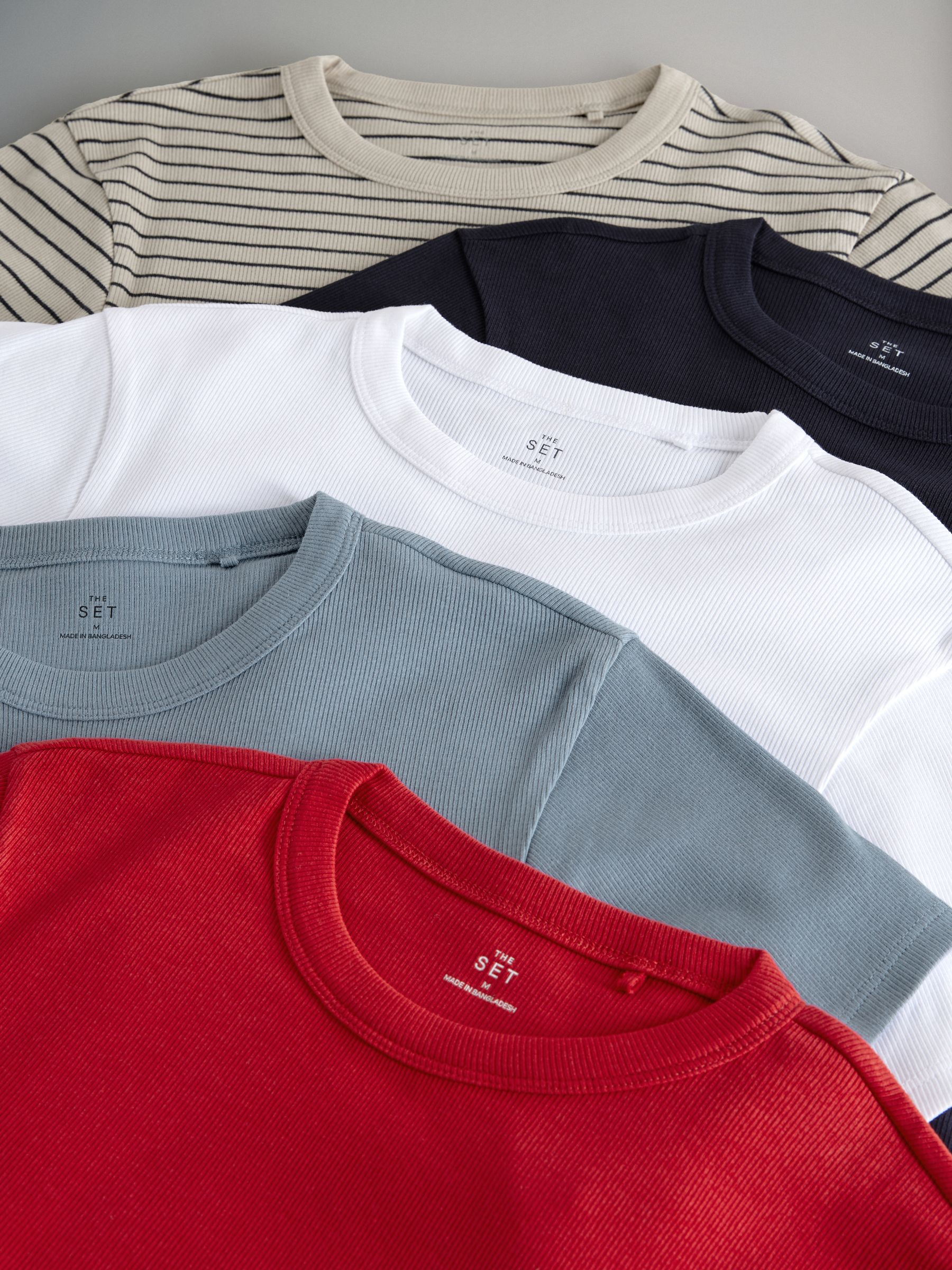 The Set’s t-shirt multipack is a wardrobe staple. The pack includes five short sleeve tops each in different colourways and made from a soft and stretchy cotton with a ribbed finish. Designed for a slim fit, these crew neck tops will look great worn alone with jeans and trainers or layered under a jumper on colder days. 5 pack Ribbed fabric Wardrobe essential Slim fit 5 x T-shirt 95% Cotton, 5% Elastane.