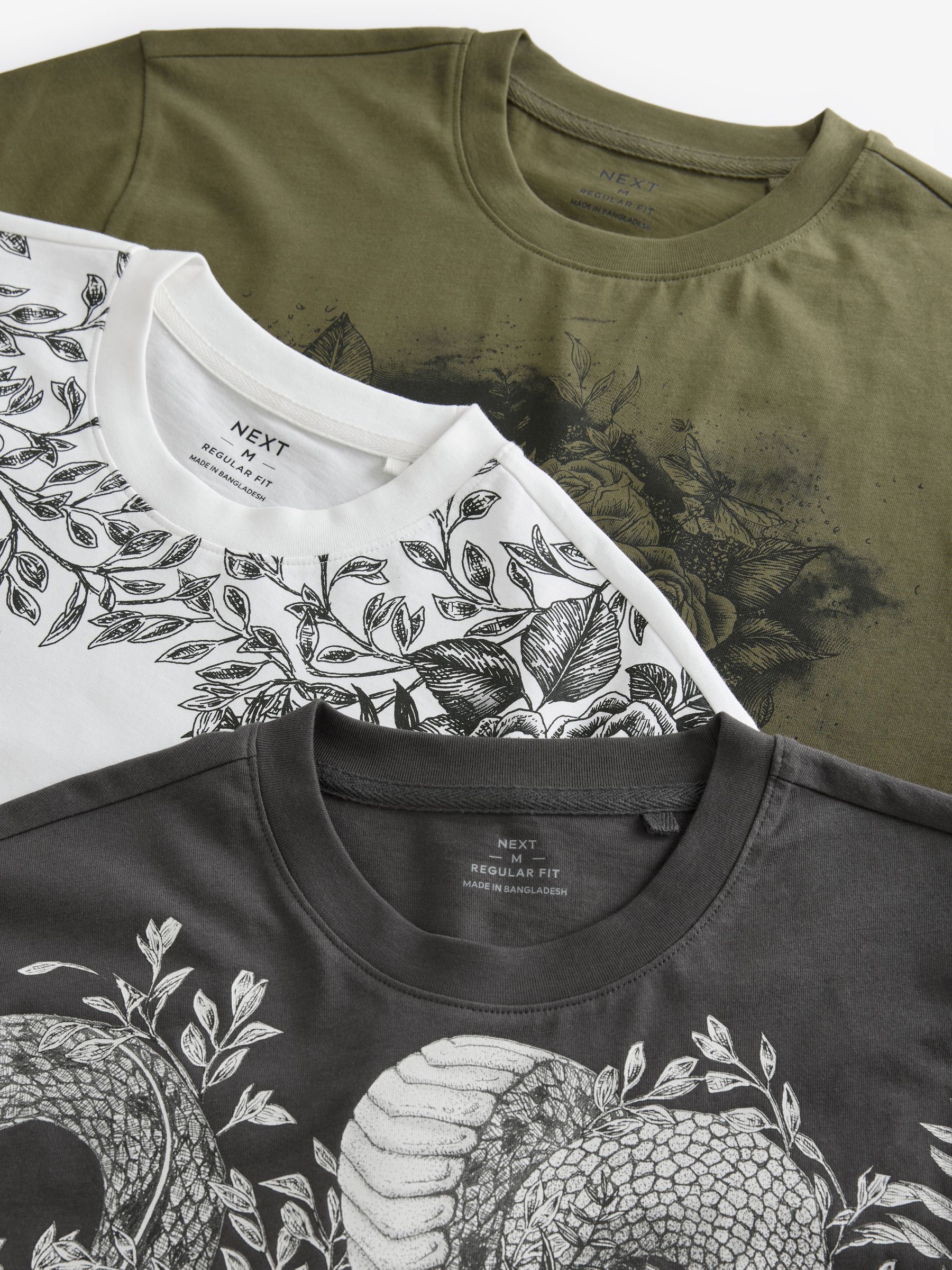 White/Black/Khaki 100% Cotton Graphic Print T-Shirts 3 Pack