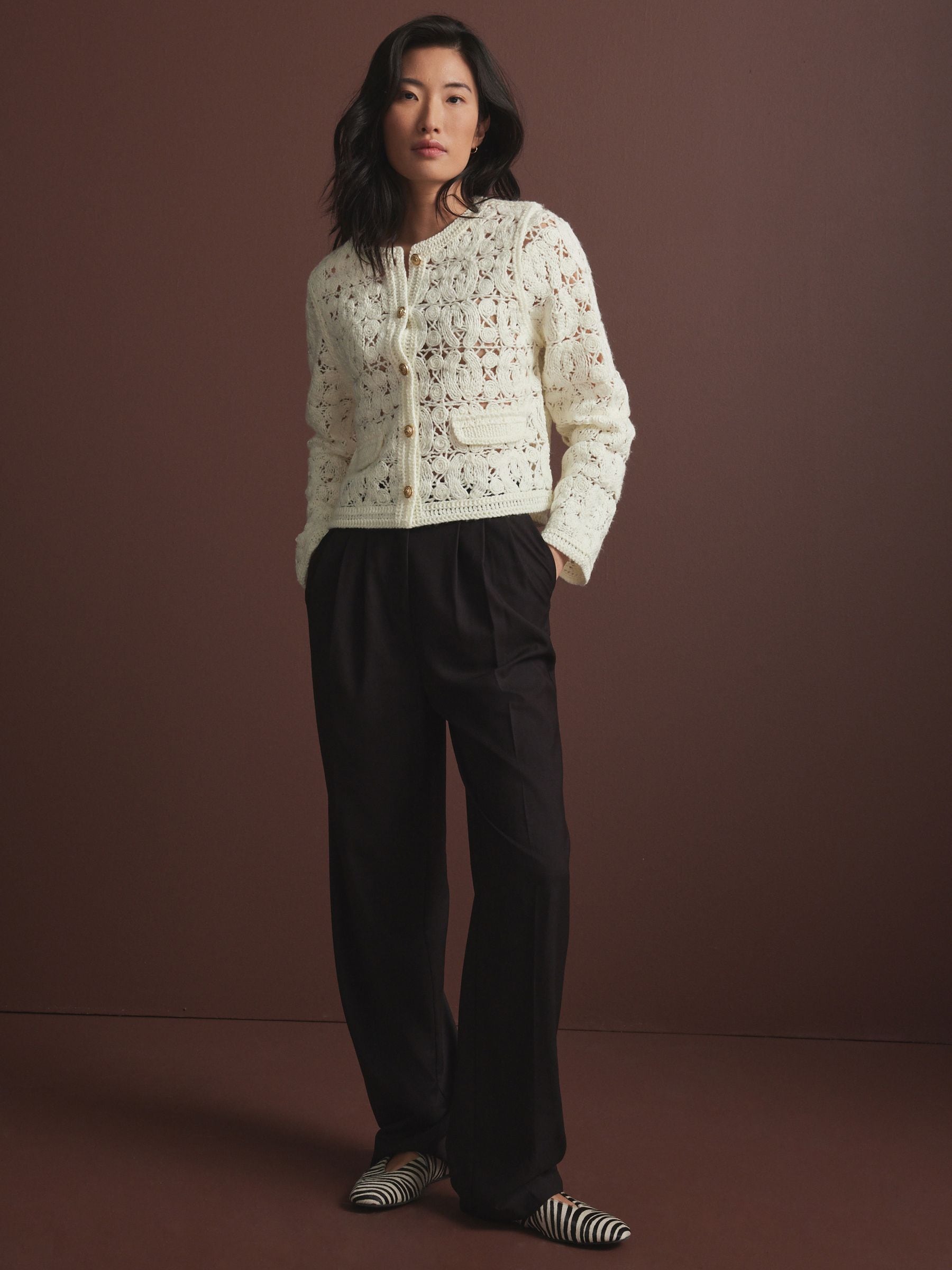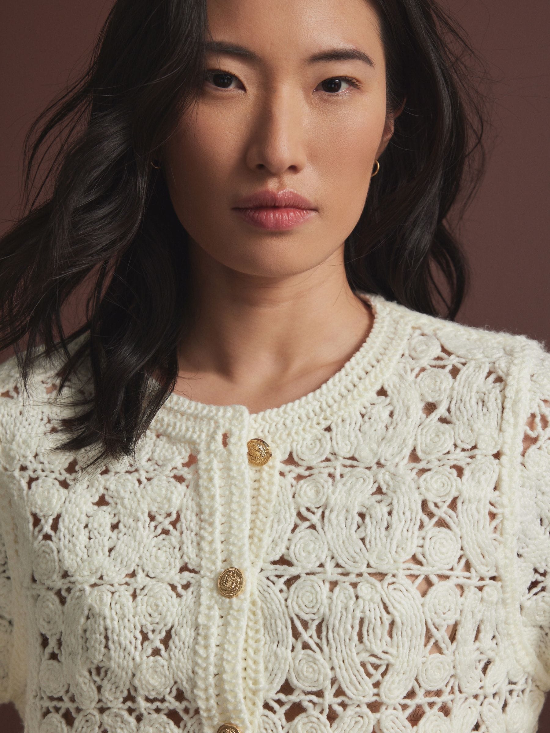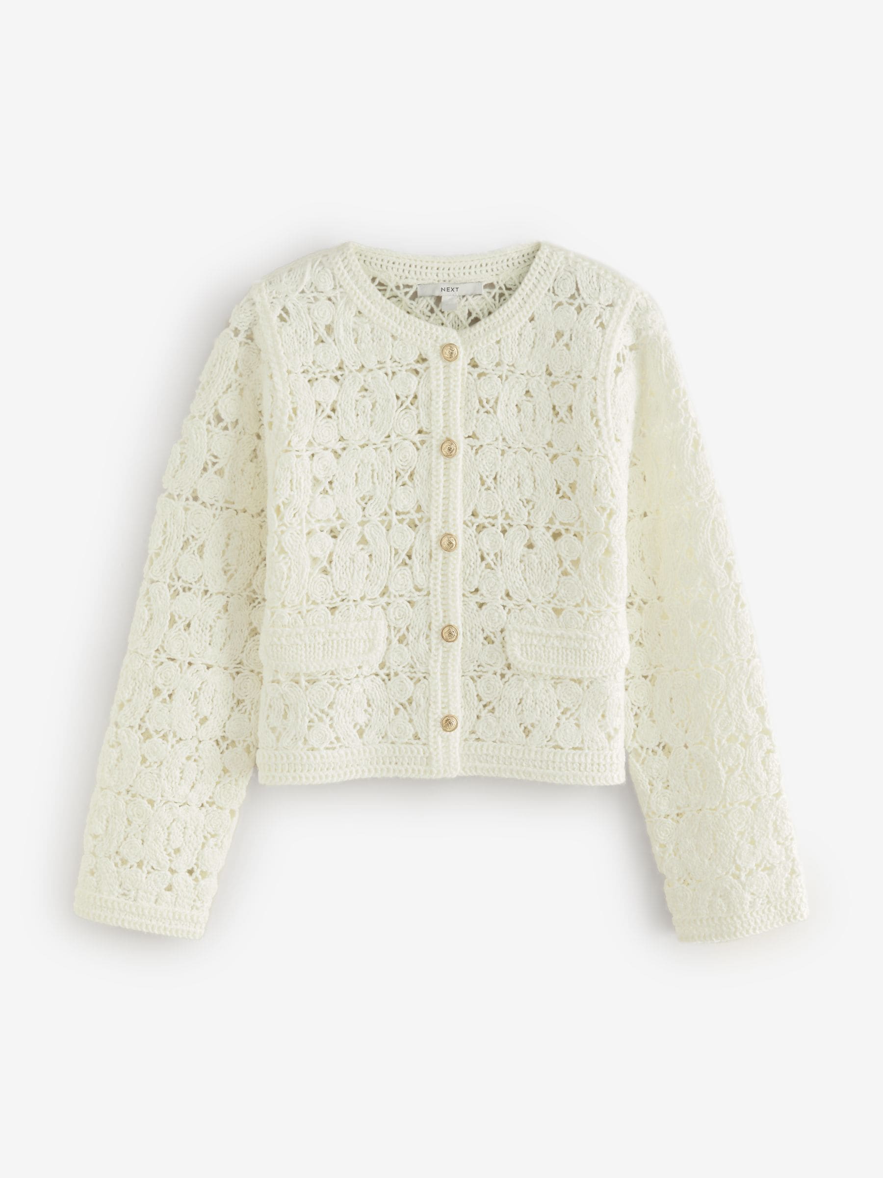 A timeless wardrobe staple, this ecru smart and stylish crochet knitted jacket exudes feminine elegance and sophistication. Featuring statement gold buttons and mock pockets, this versatile piece can be dressed up for formal occasions or worn unbuttoned for a casual layering look. Regular fit Knitted fabric Crocheted detailing Gold buttons Mock pockets Machine washable. 100% Acrylic.