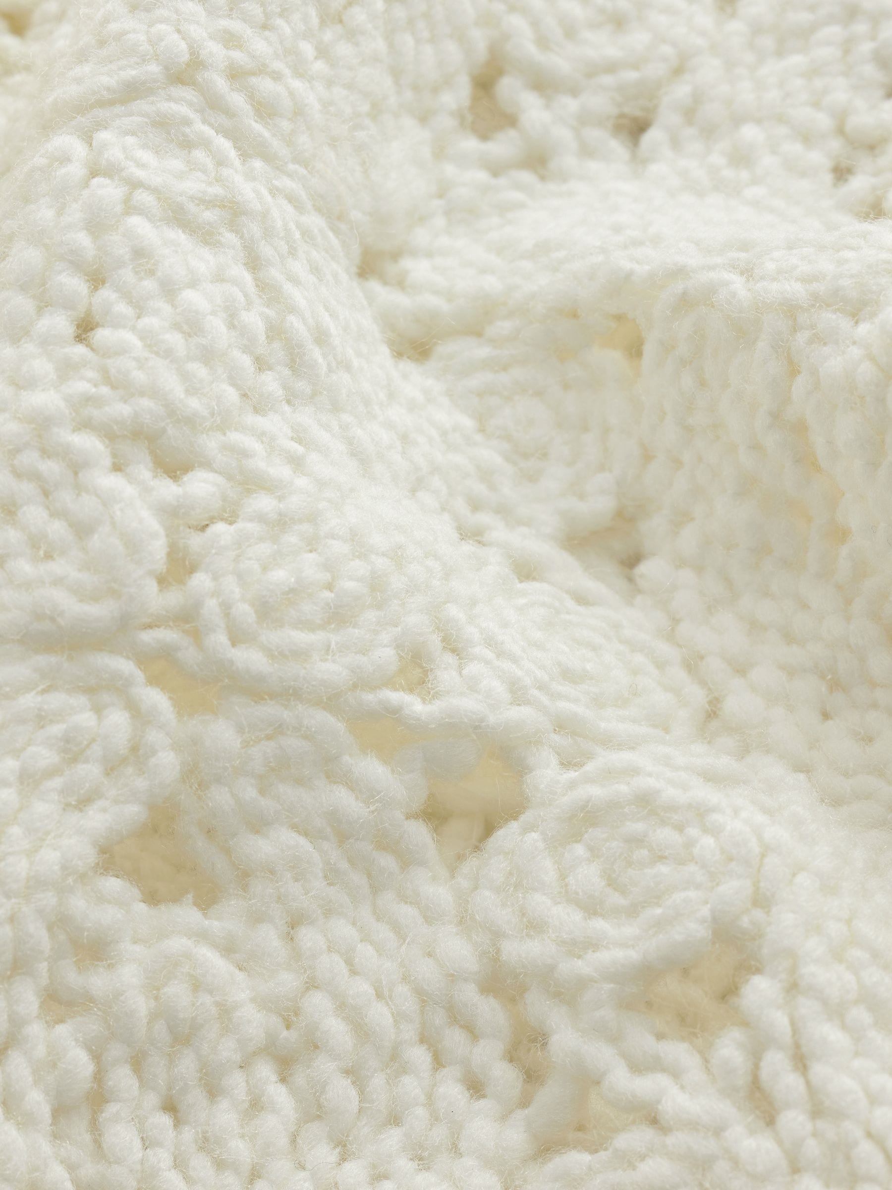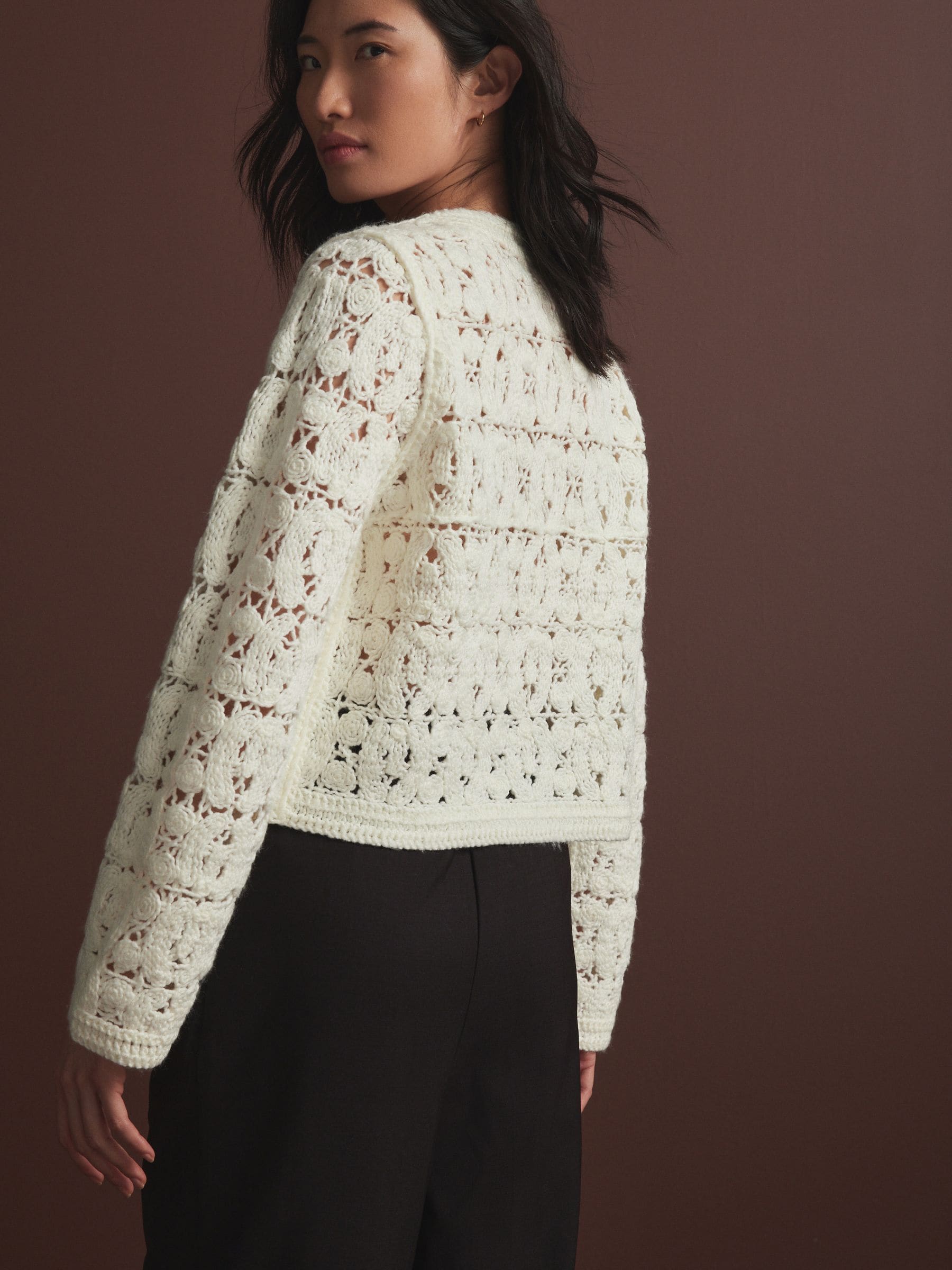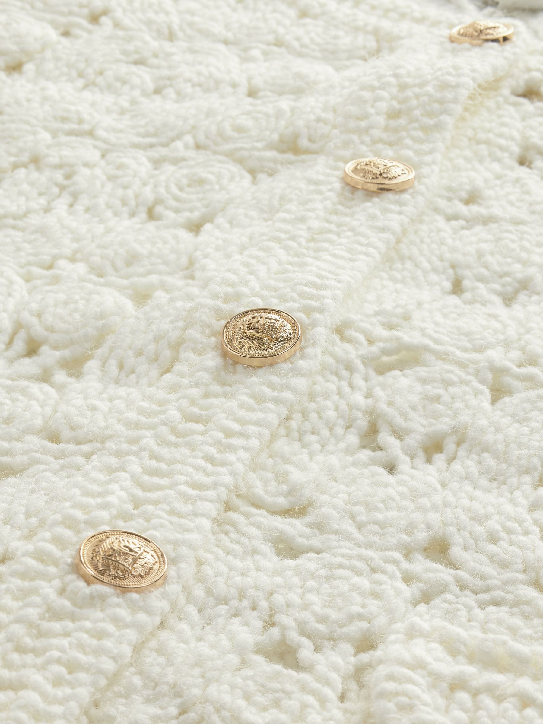 A timeless wardrobe staple, this ecru smart and stylish crochet knitted jacket exudes feminine elegance and sophistication. Featuring statement gold buttons and mock pockets, this versatile piece can be dressed up for formal occasions or worn unbuttoned for a casual layering look.