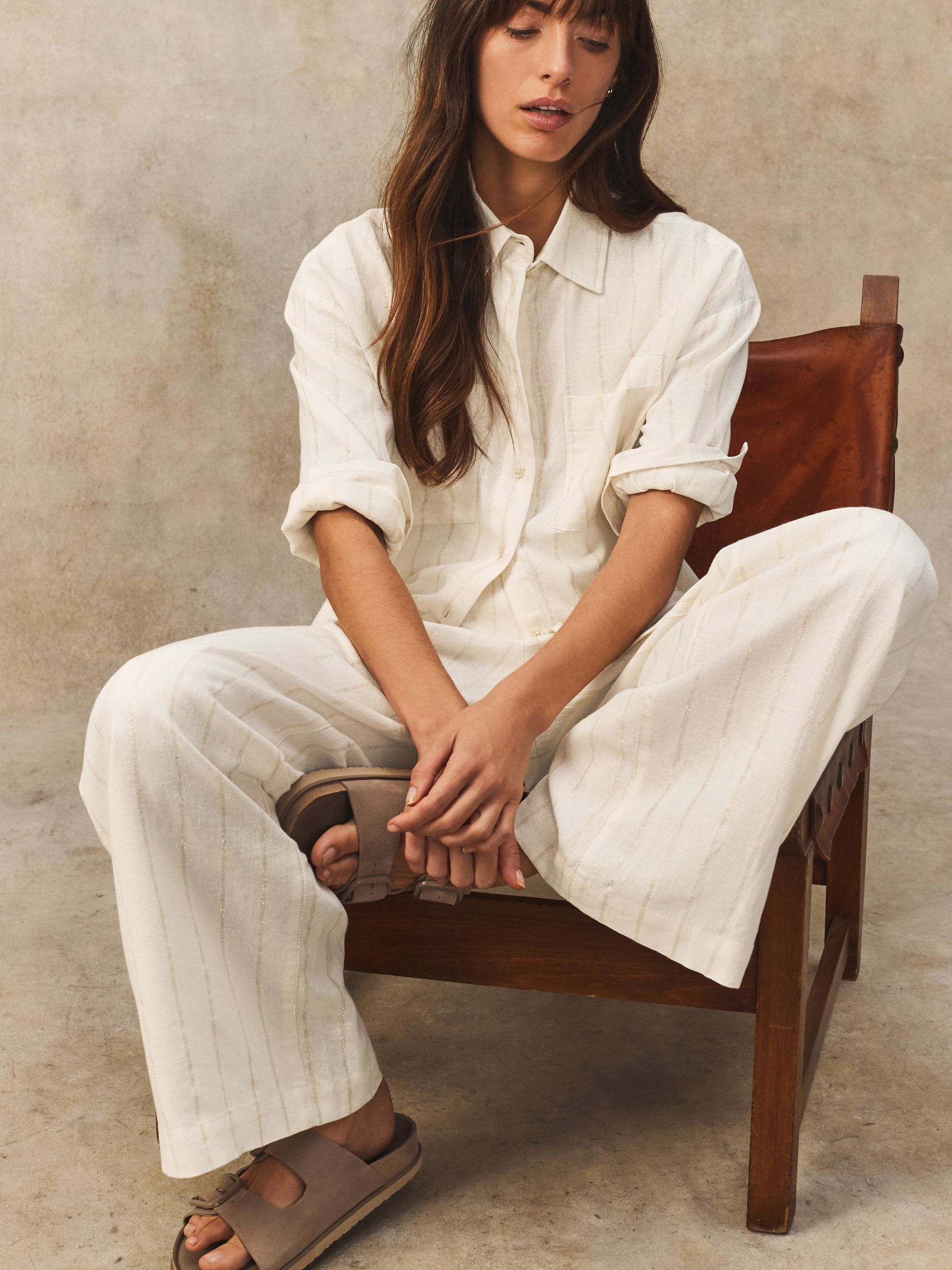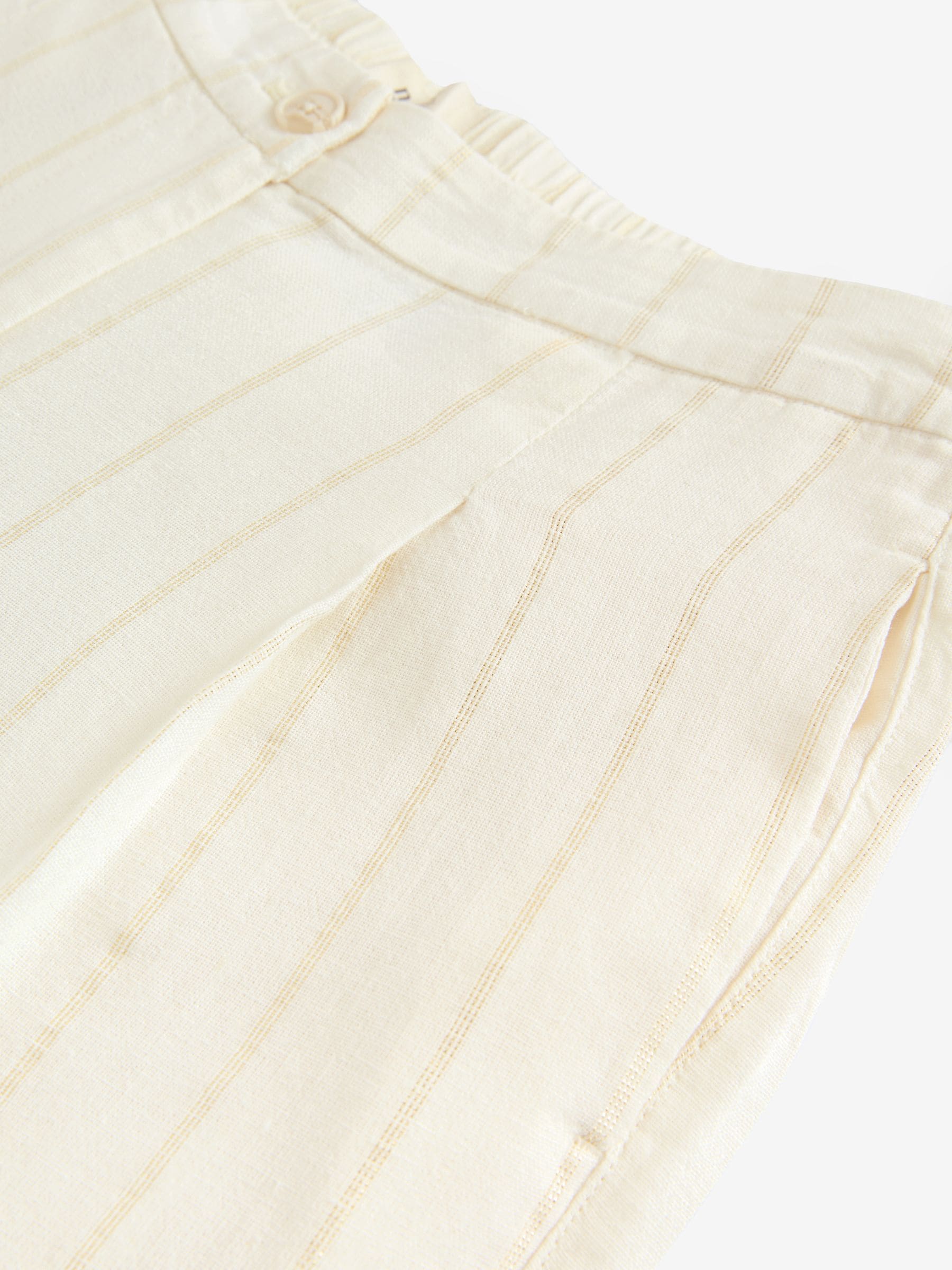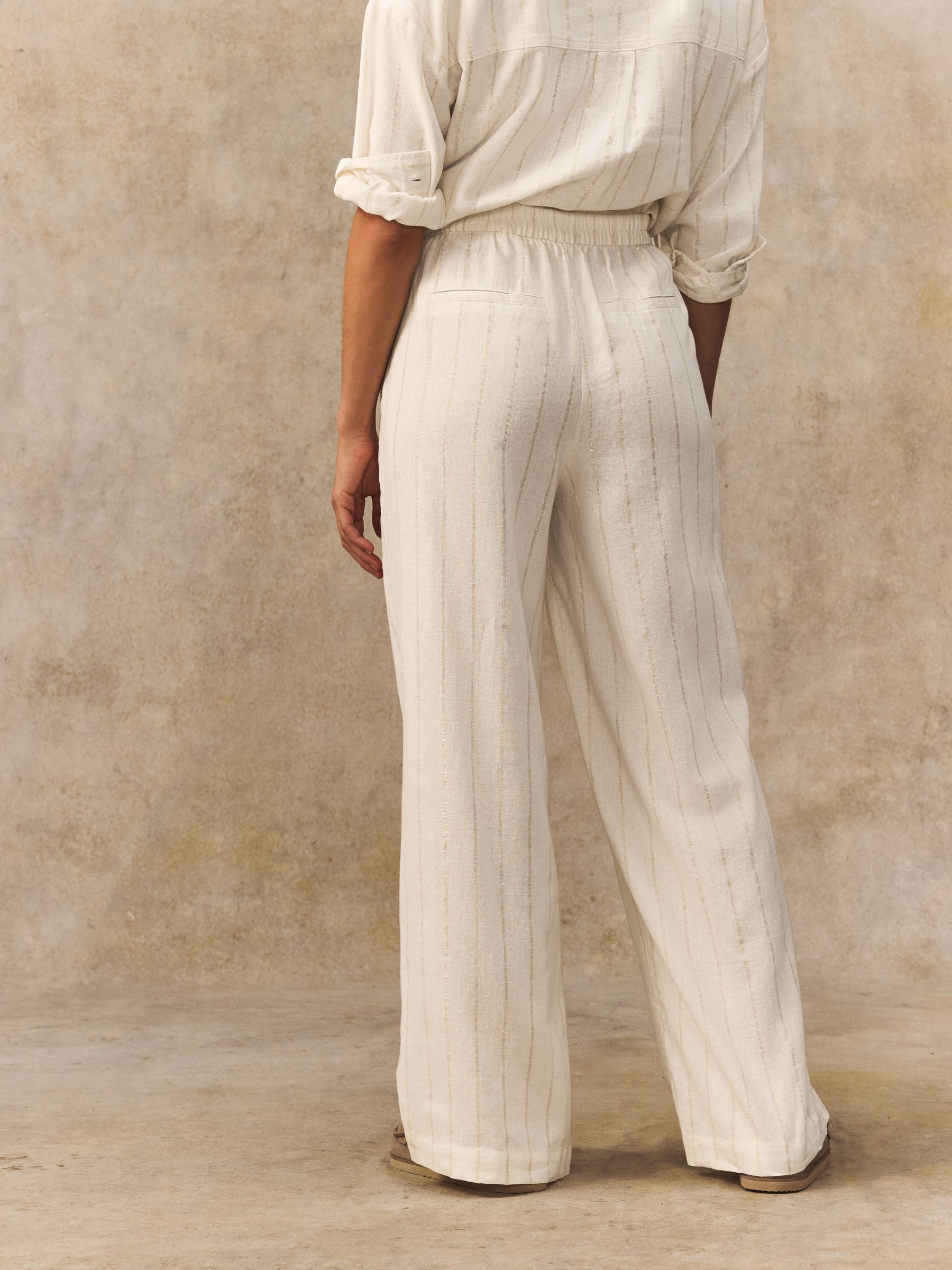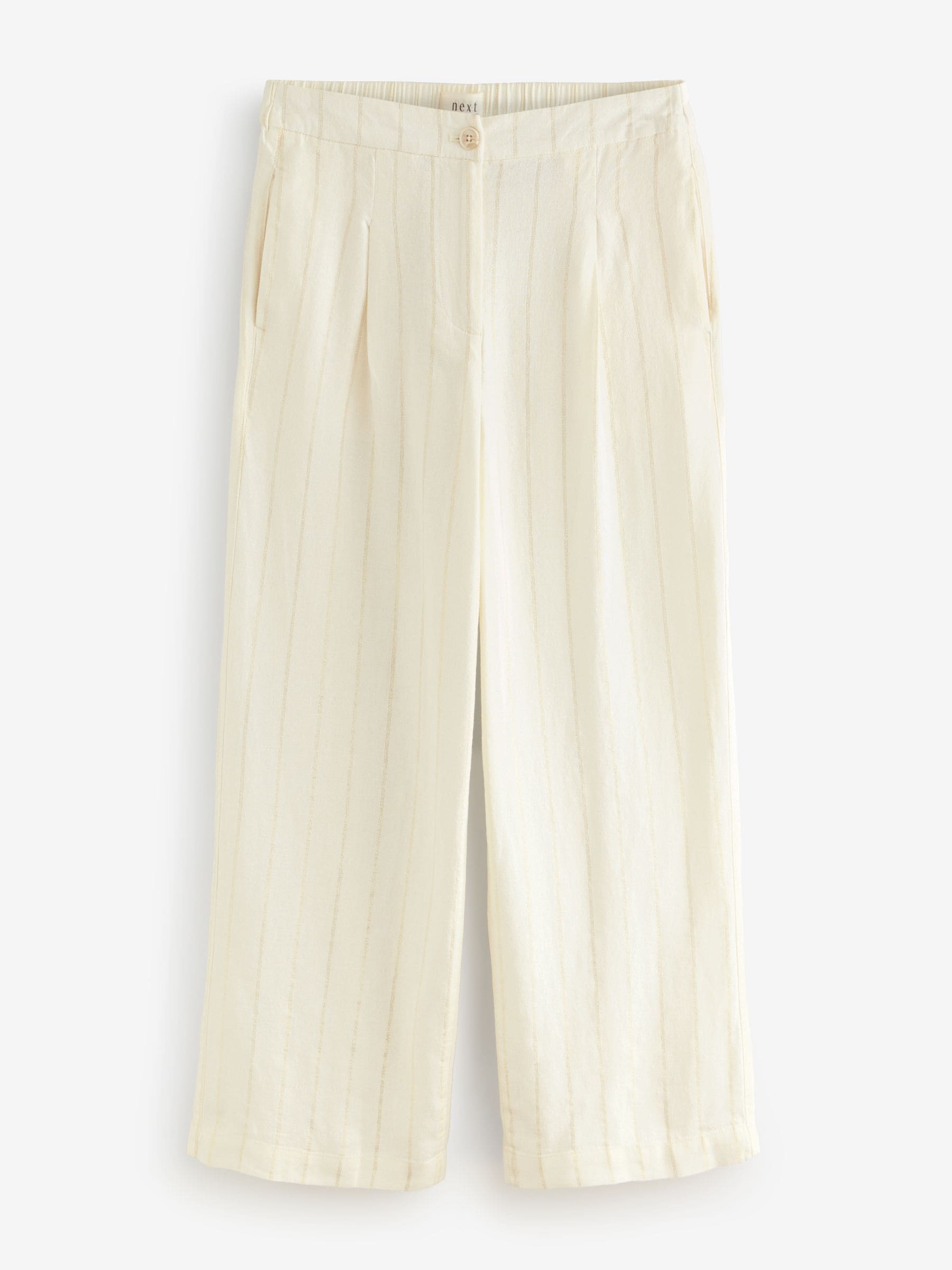 With a linen-blend fabric for a breathable summer feel, these wide leg trousers have a white tonal stripe design with a button and zip fastening, side pockets and pleat detailing.