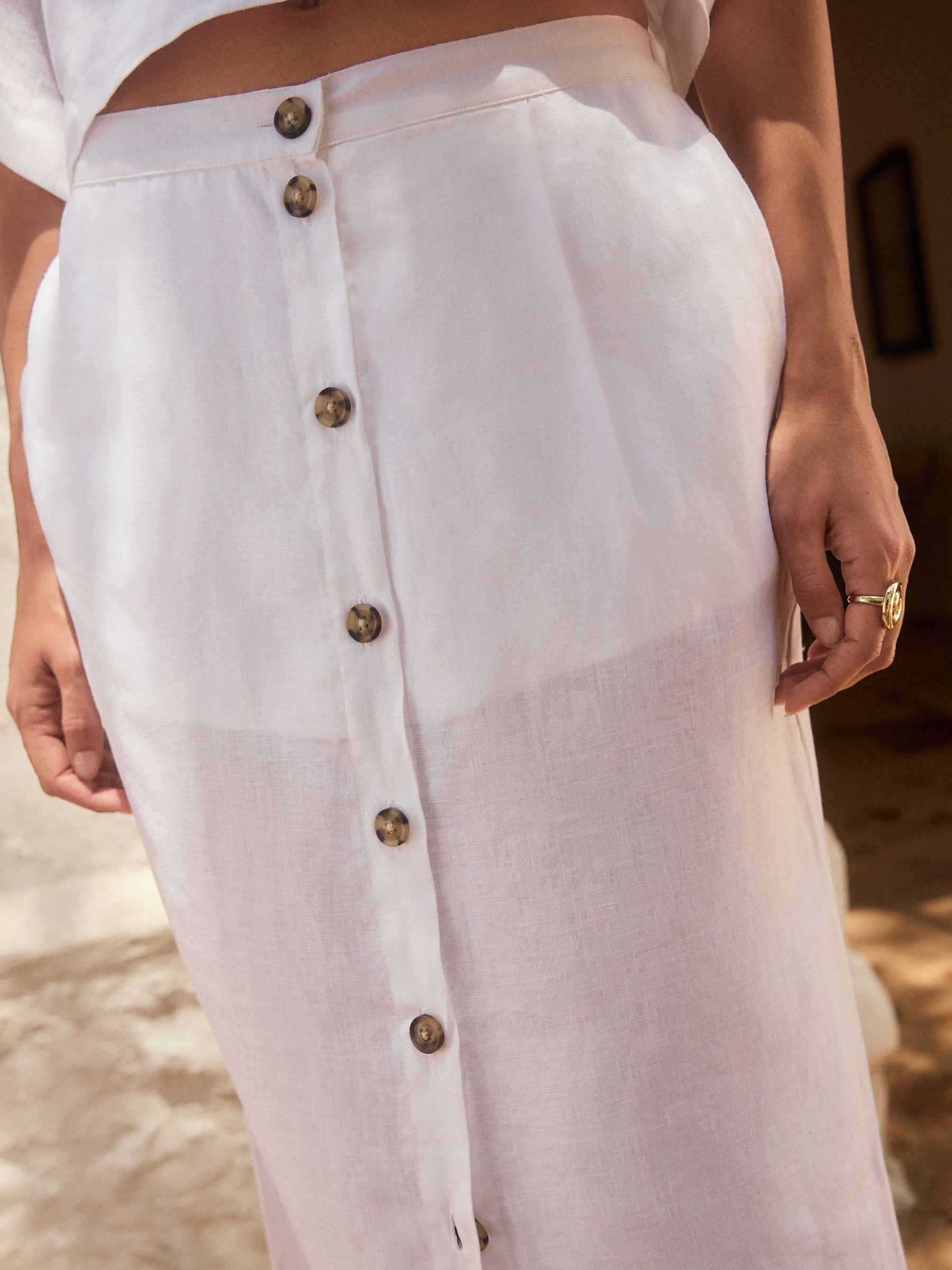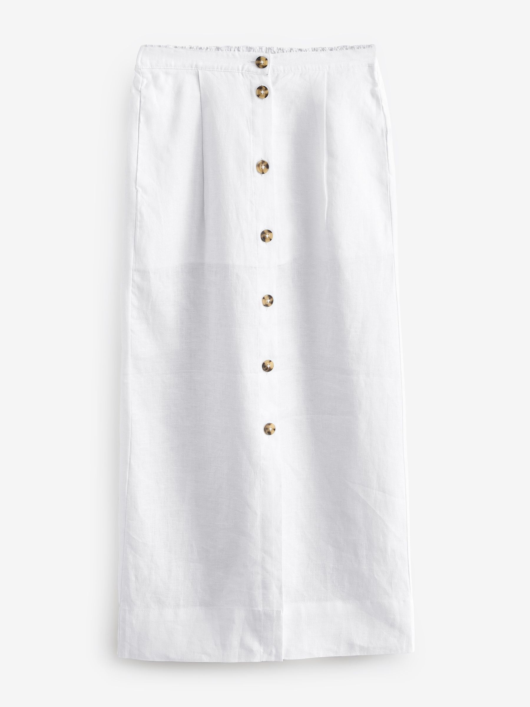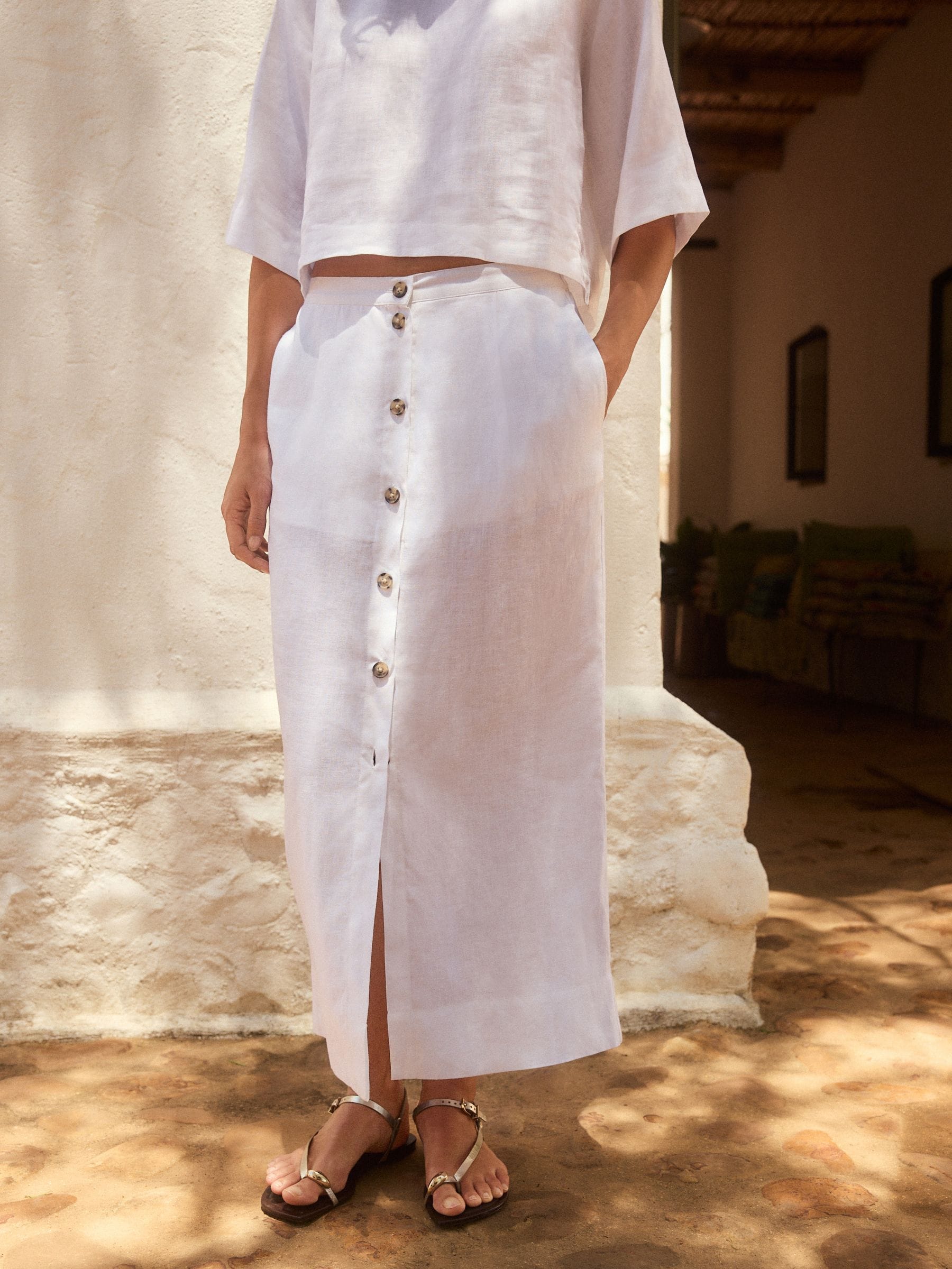 With a summer vibe, this pencil skirt is made from pure linen with button-down detailing, an elasticated waistband and side pockets in a maxi-length, perfectly paired with sandals.
