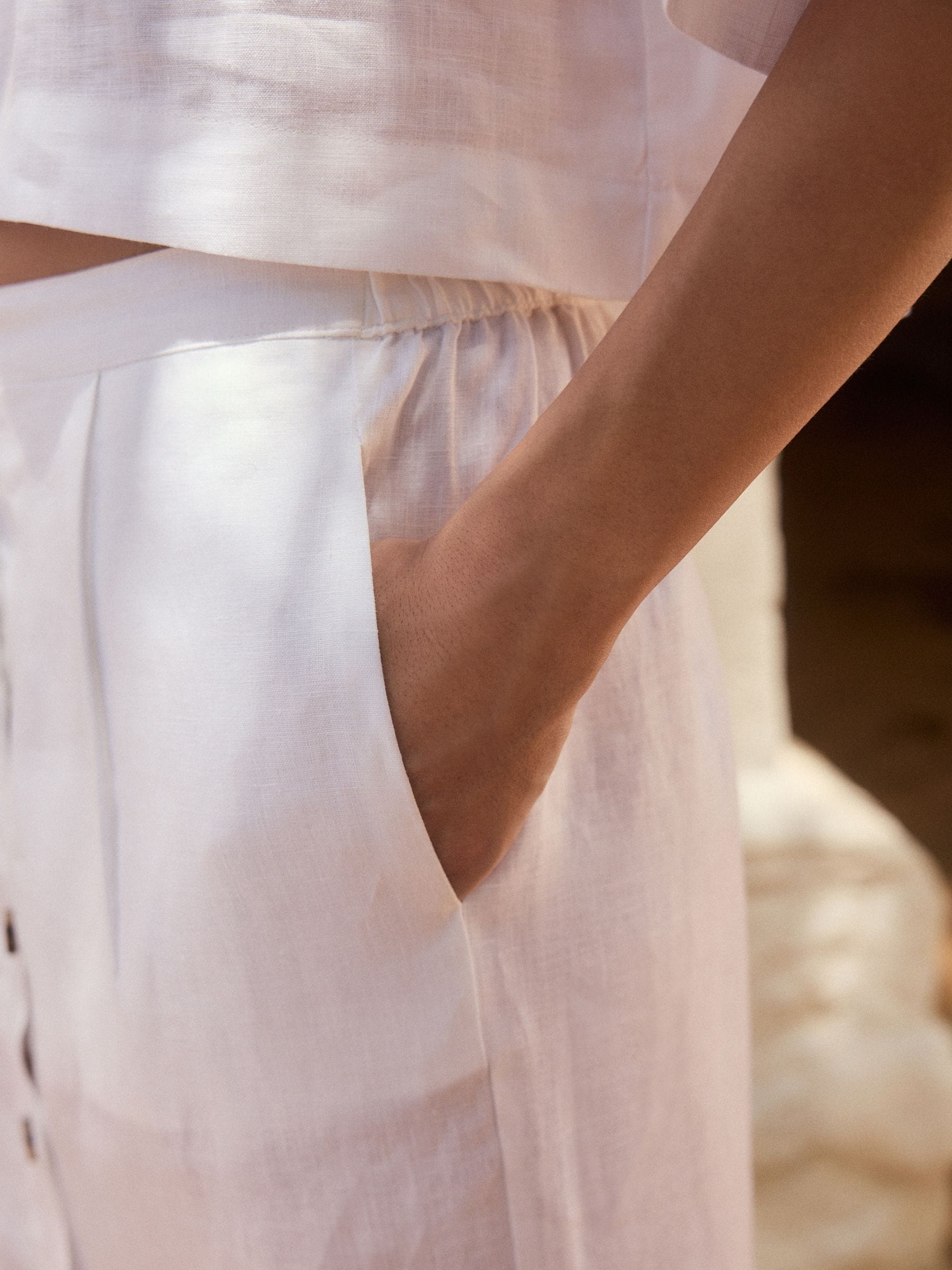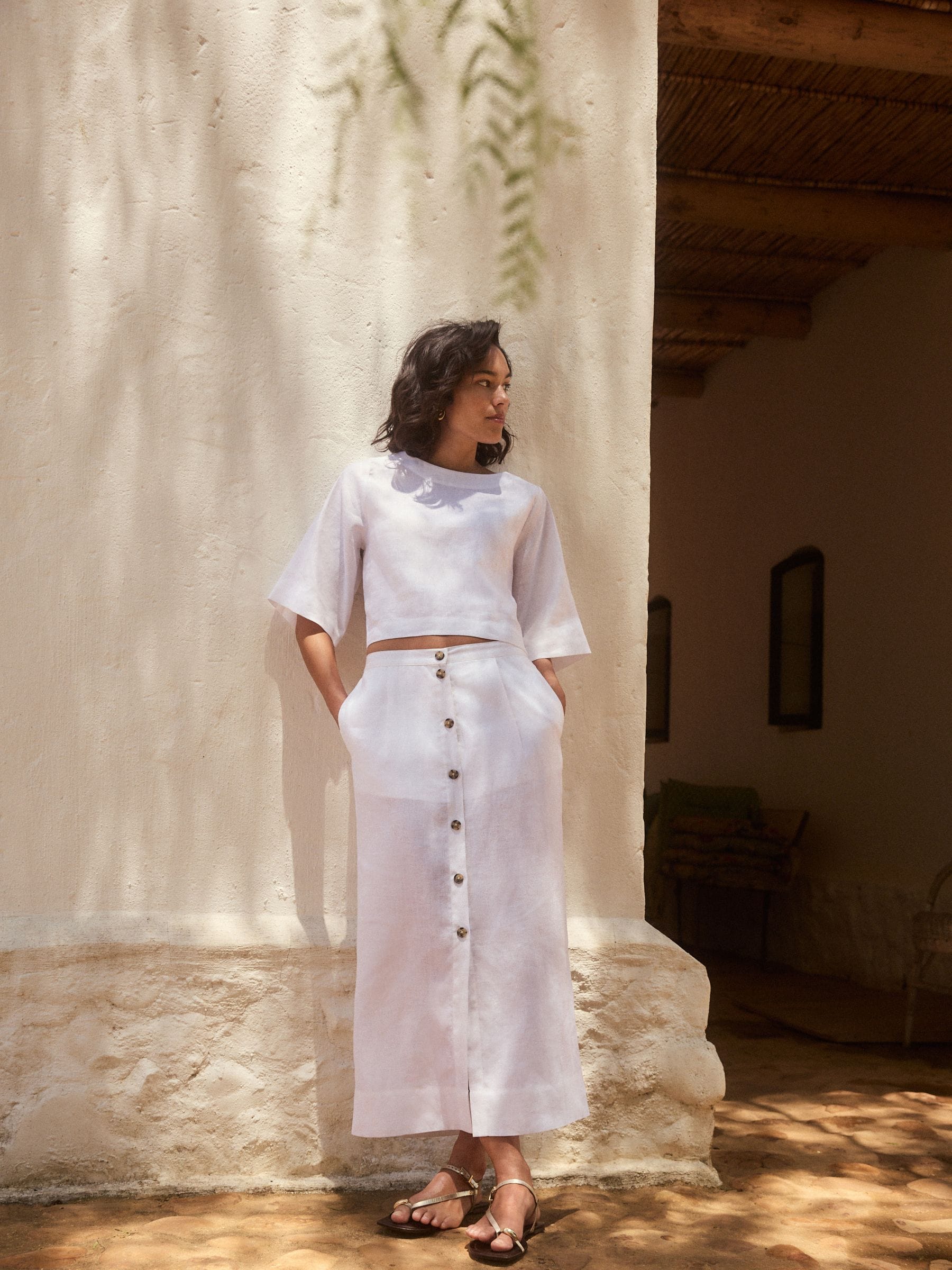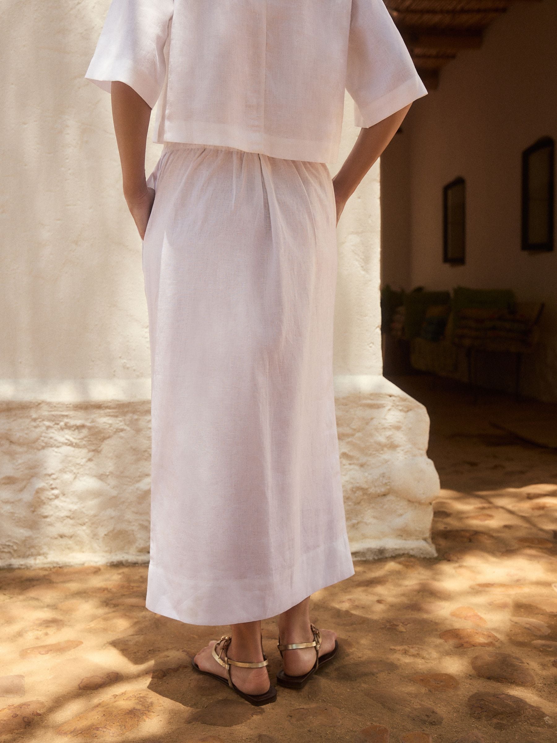 With a summer vibe, this pencil skirt is made from pure linen with button-down detailing, an elasticated waistband and side pockets in a maxi-length, perfectly paired with sandals.