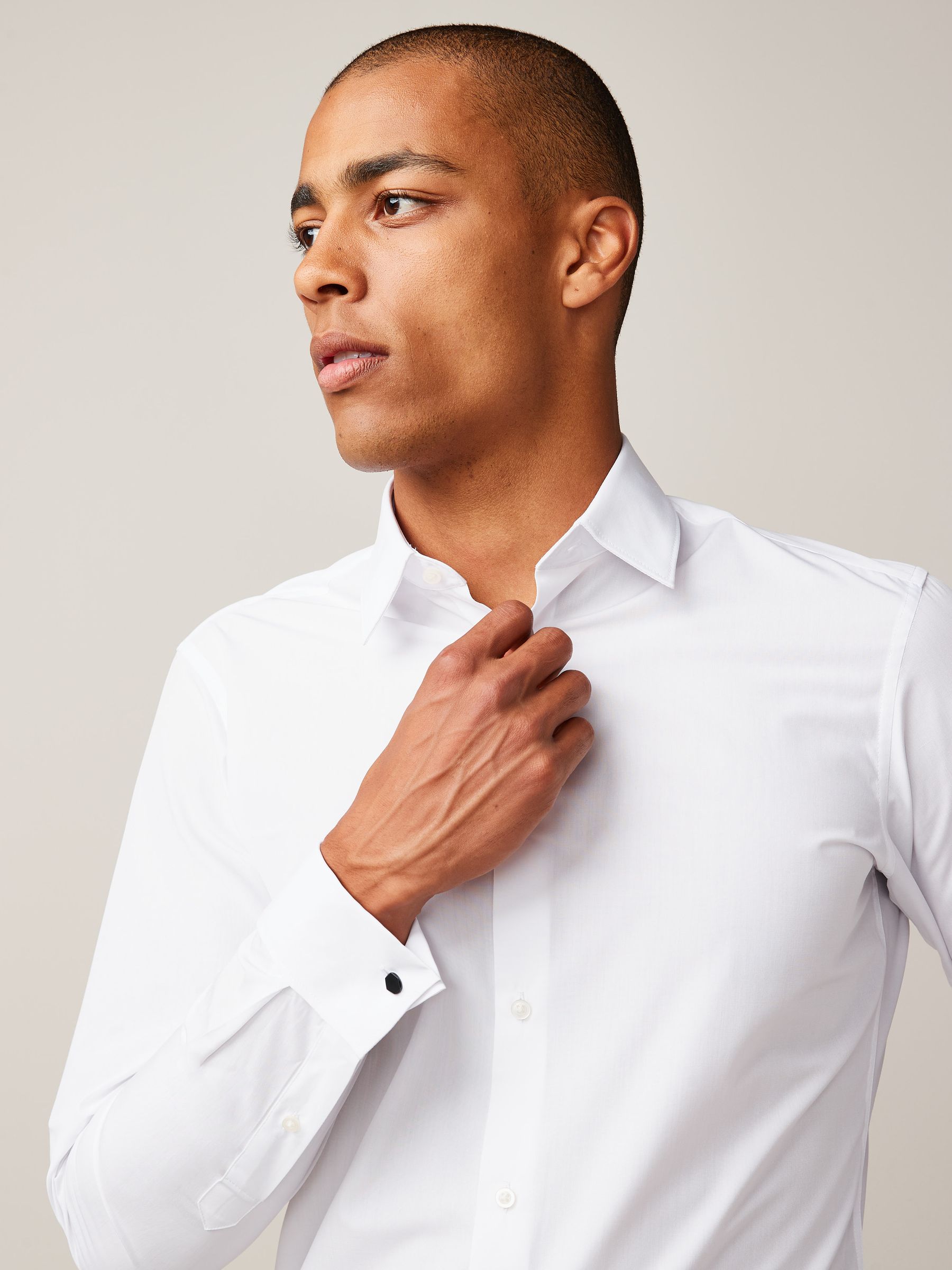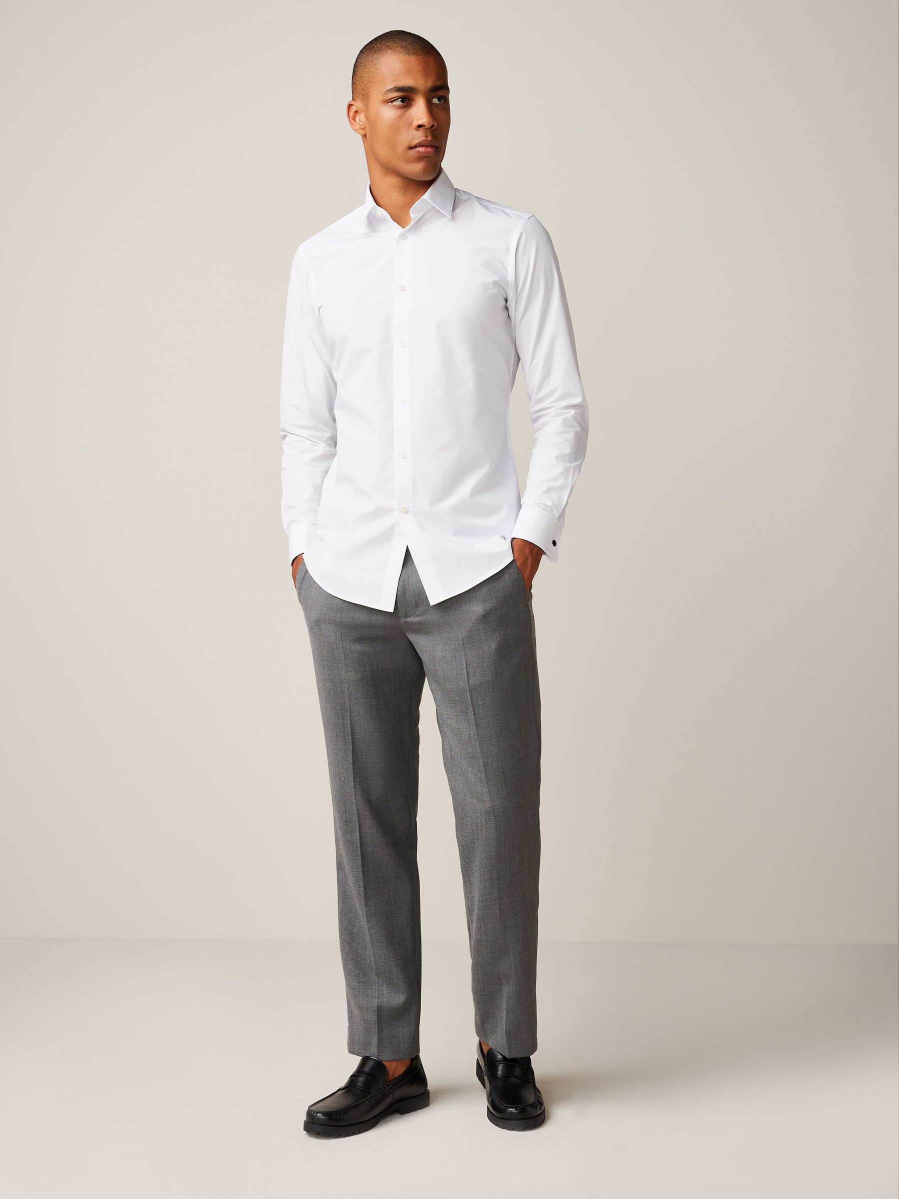 Make everyday styling easy with our easy care double cuff slim fit shirt in white. Easy to iron, practical and comfortable, this shirt is designed to take the stress out of dressing. Slim fit Cotton blend Double cuff long sleeves Button through fastening Machine washable. 65% Recycled polyester, 35% Cotton. Better Cotton – By choosing our cotton products, you’re supporting our investment in Better Cotton’s mission to help cotton farming communities survive and thrive while protecting and restoring the environment. This product is sourced via a system of mass balance and therefore may not contain Better Cotton. Learn more at www.next.co.uk/better-cotton, Contains recycled polyester certified to the Global Recycled Standard (GRS) which verifies the percentage of recycled material and tracks it from the recycler to the final product. The exact % of certified recycled polyester is shown in the product composition above. See individual on-product labelling for full certification details